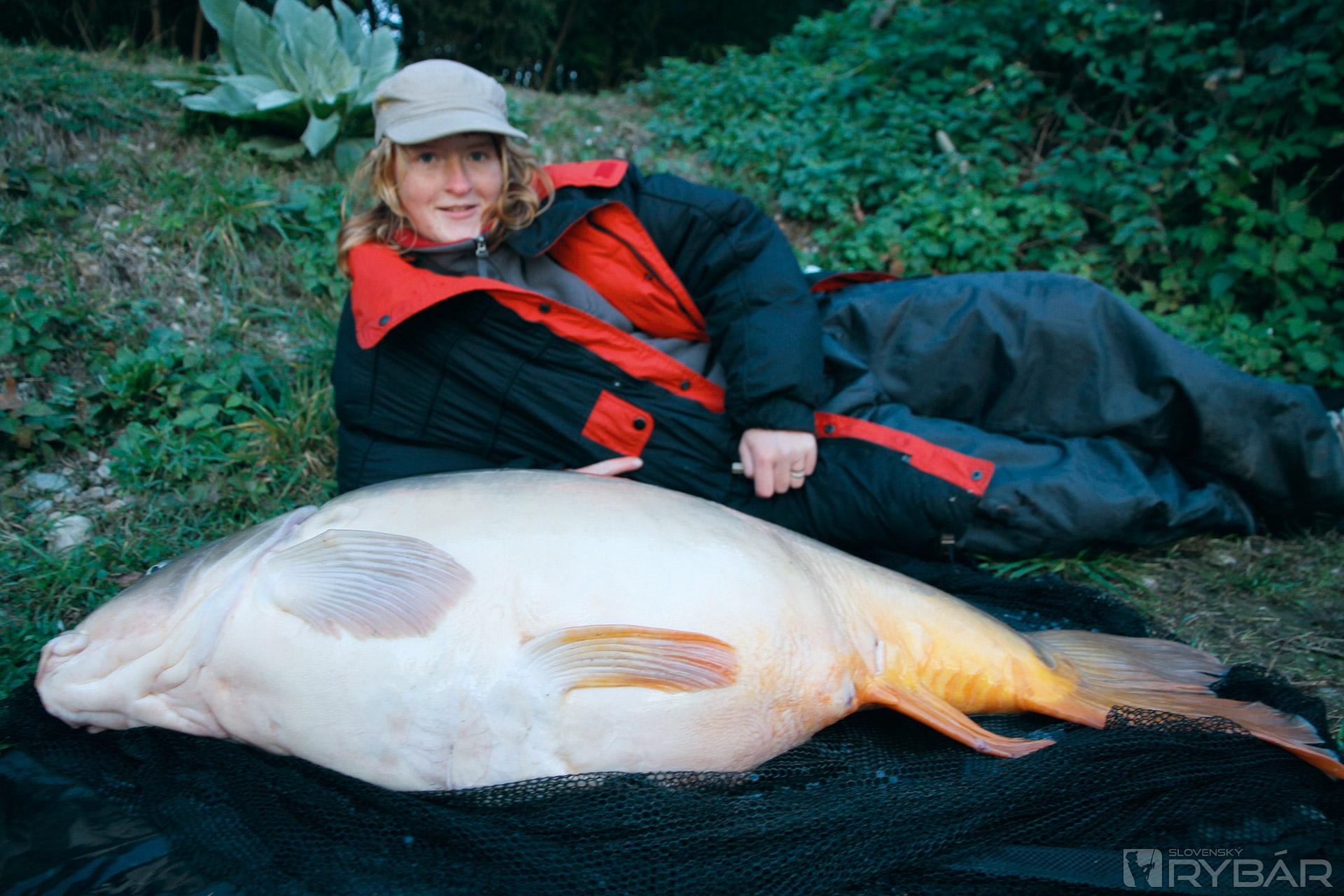 Vôbec si neuvedomujem, čo som ulovil až do chvíle, kým Zdenko s úžasom v očiach vyslovil: „Je to ona!“ Áno je to ona! Jedna z dvoch najcennejších rýb revíru! Za takú rybu sa človek cíti aj patrične zodpovedný, tak nasleduje len rýchle váženie na dvoch váhach, pár fotografií a rýchlo späť. Nie je to ani tak dĺžka čo ma zaujíma, ako jej hmotnosť. Na jednej váhe to ukazuje 30,70 kg na druhej 30,50 kg po odčítaní saku. Takže oficiálne to uzavierame hmotnosťou s magickým a v budúcnosti pre mňa asi len ťažko prekonaným číslom 30,50 kg!