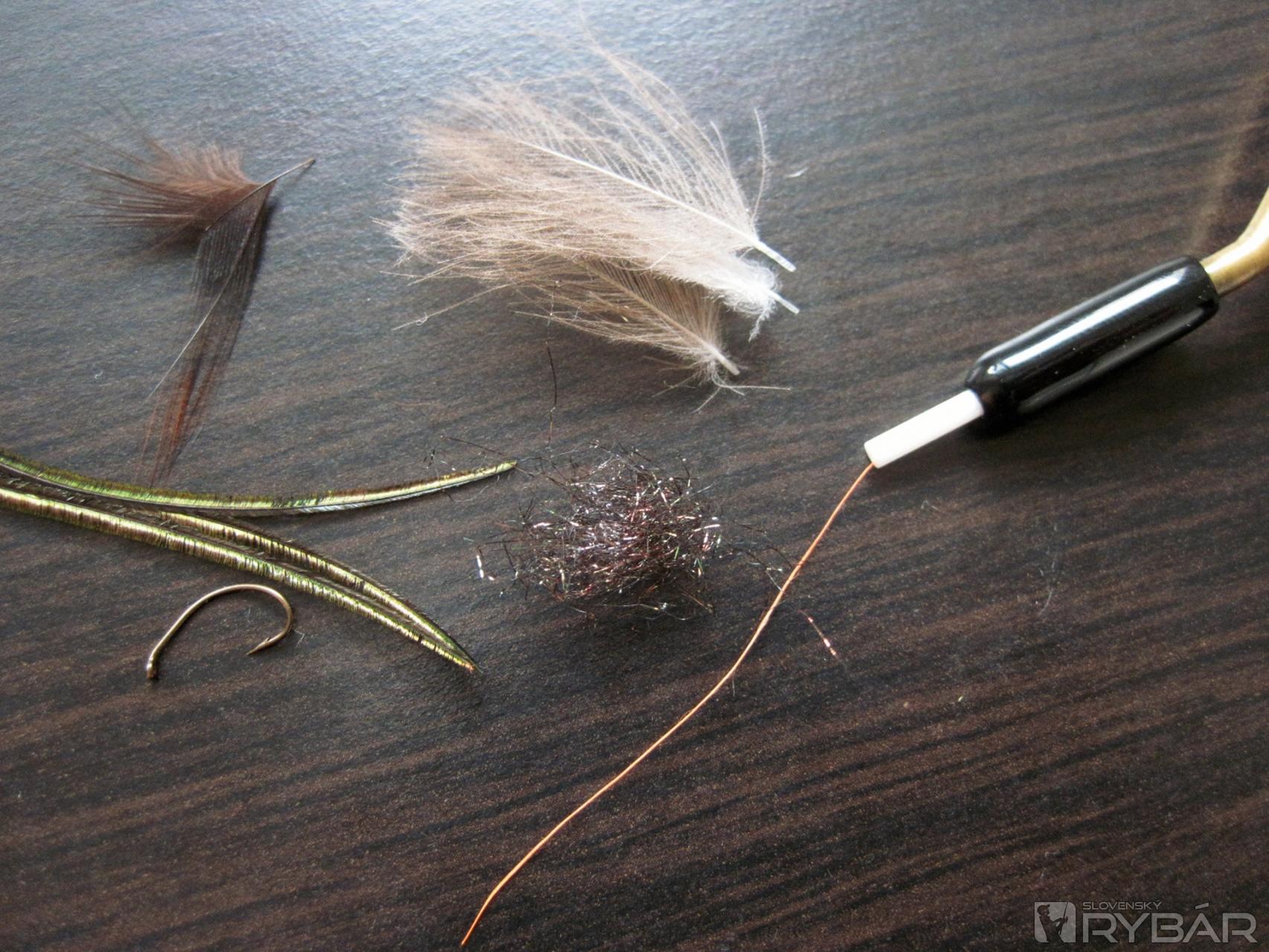 Priviažeme si 2 pierka CDC. Na hlavohruď použijeme jemný prírodný dabing, do ktorého môžeme primiešať lúče páva, pštrosa alebo použiť samotný dabing.
