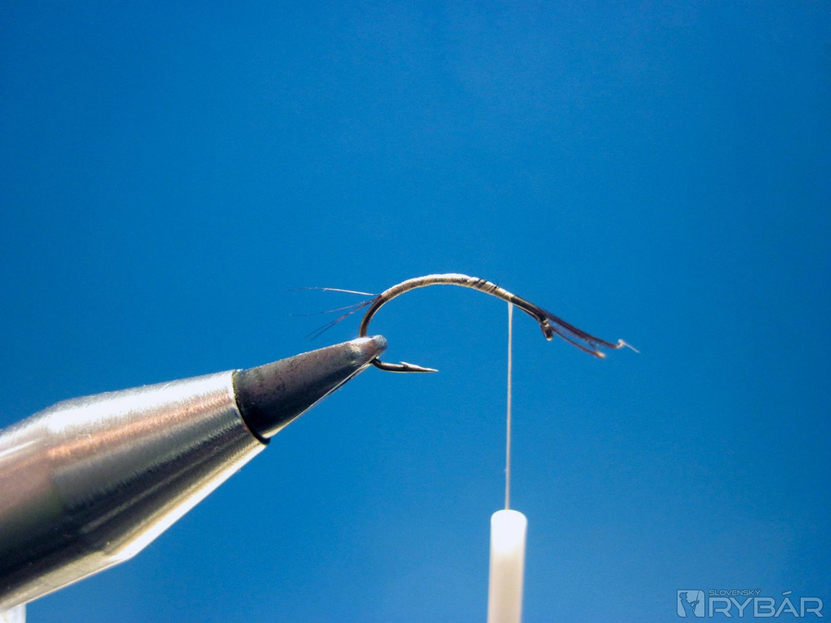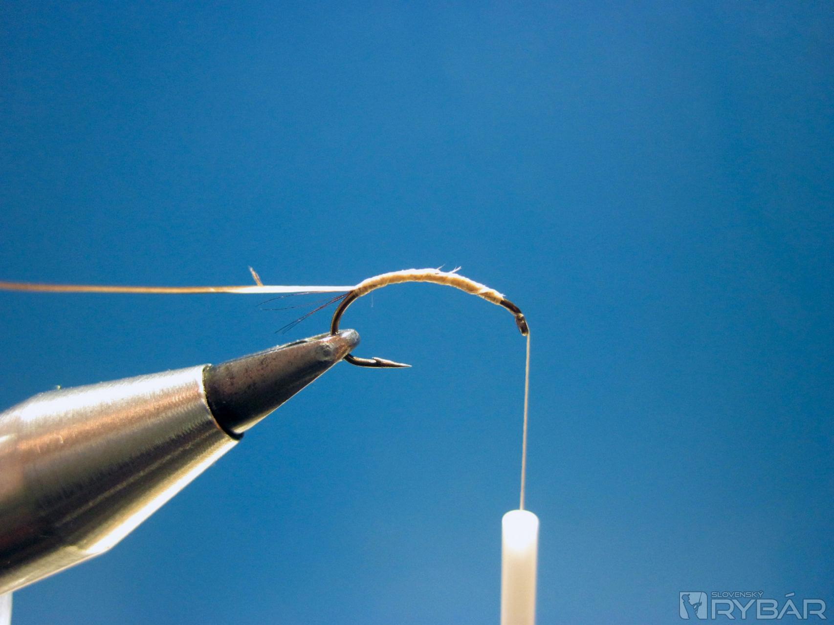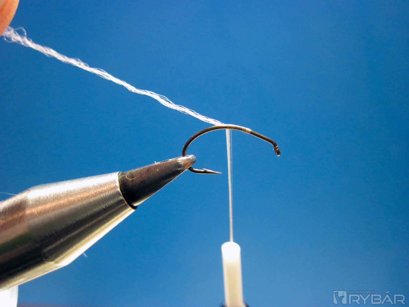 Pomocou viazacej nite naviažeme štety, tie naviažeme pozdĺž celého ramienka háčika.