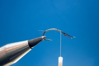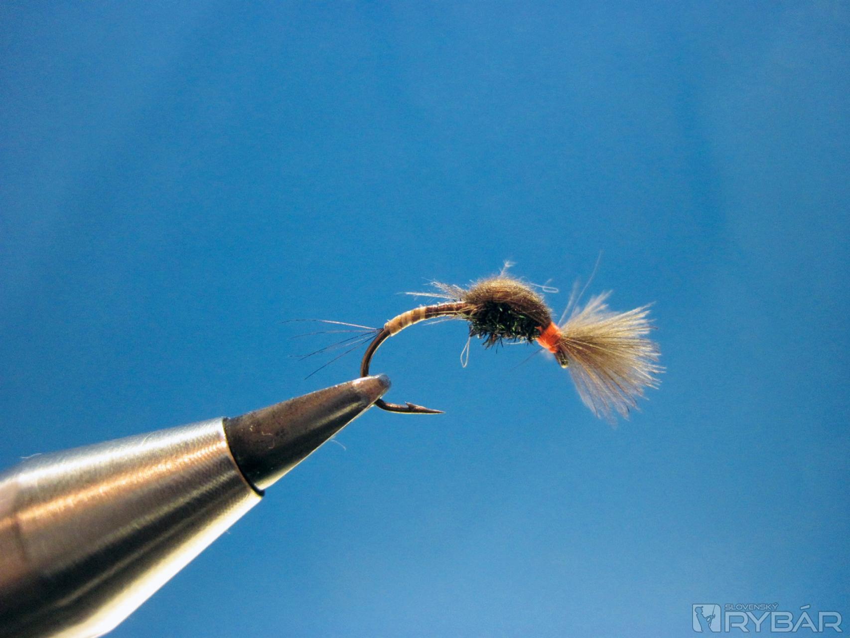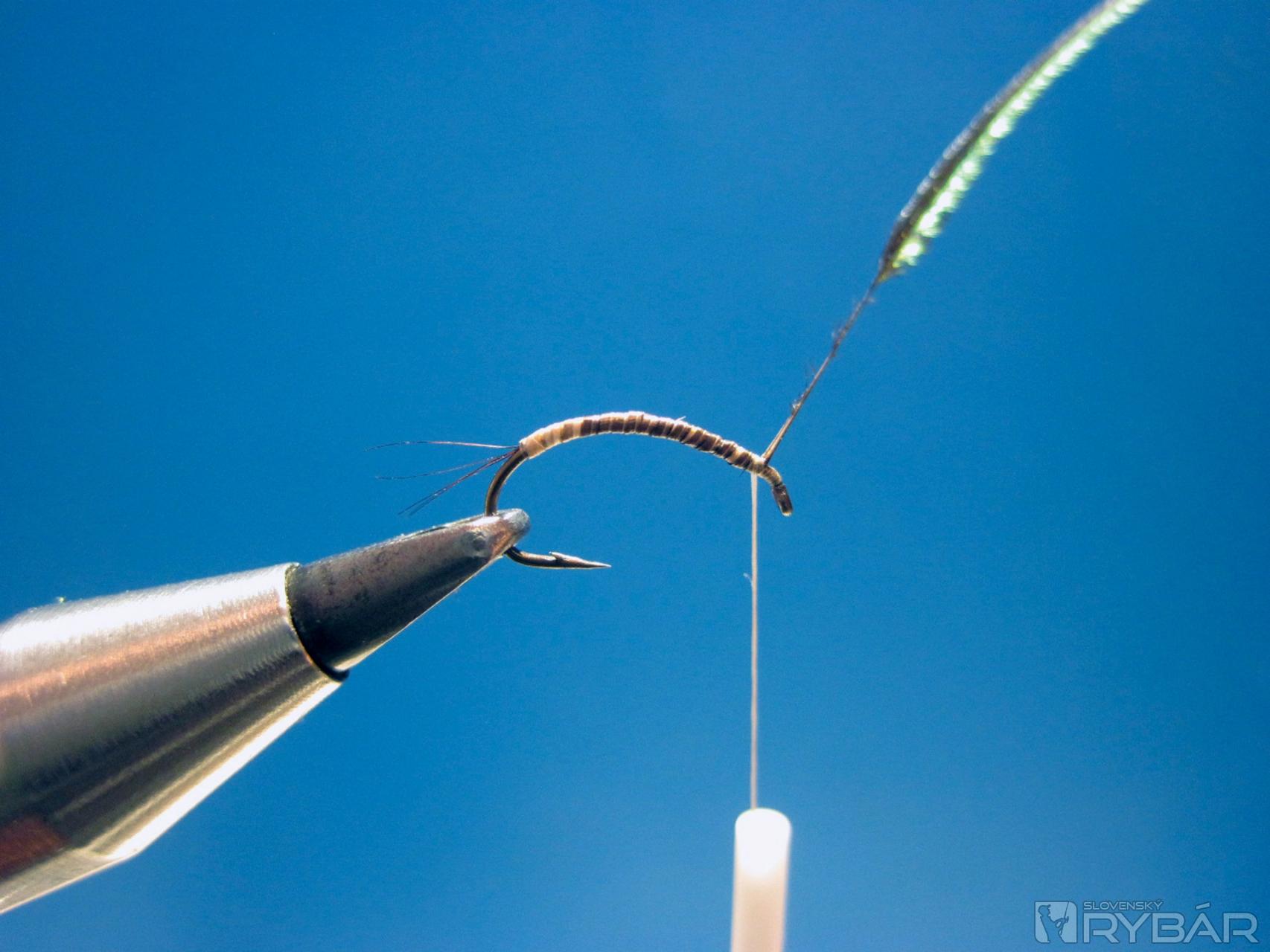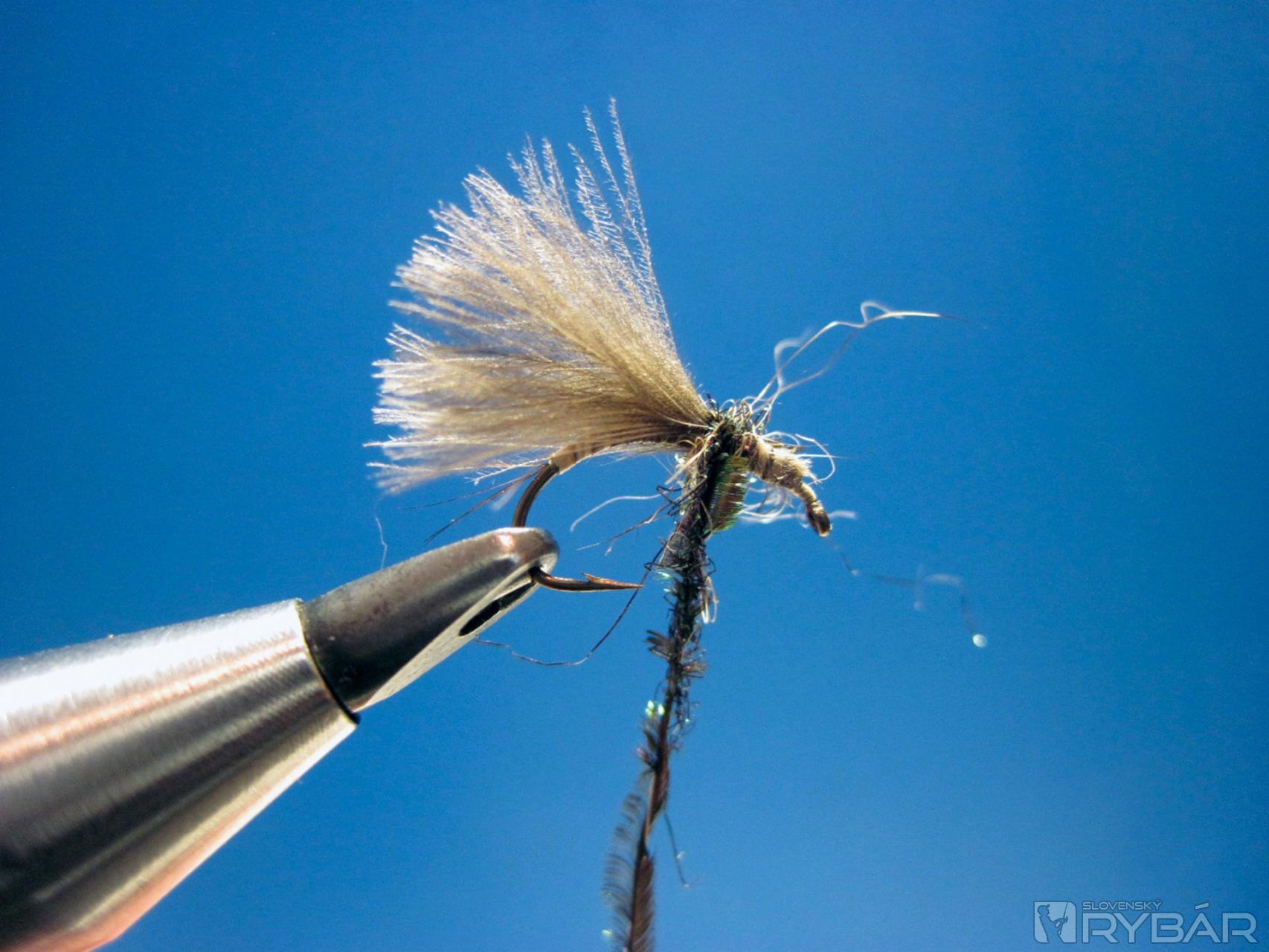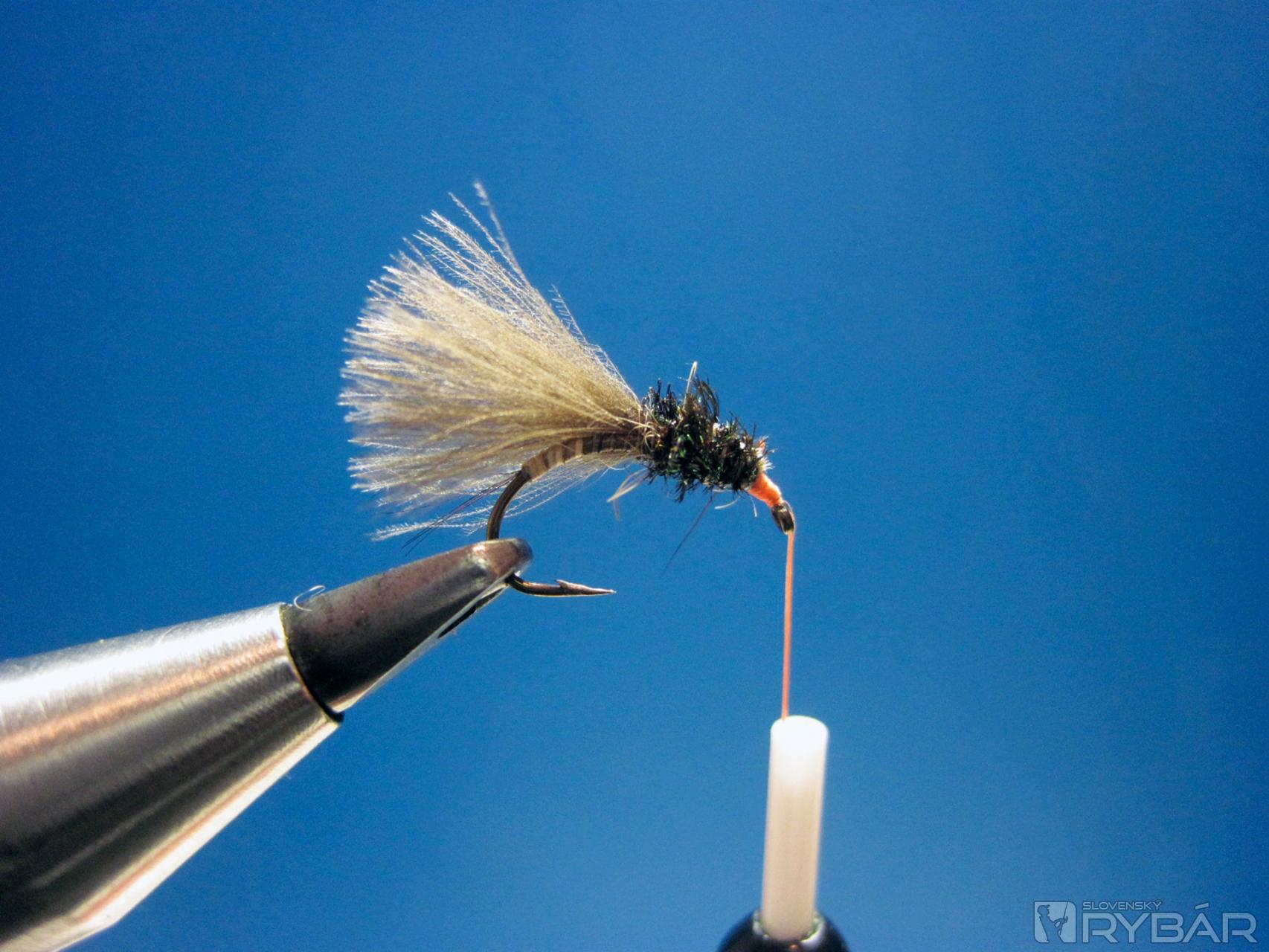 CDC pretiahneme smerom dopredu, zaistíme viazacou niťou a strateným uzlom a muška je hotová.