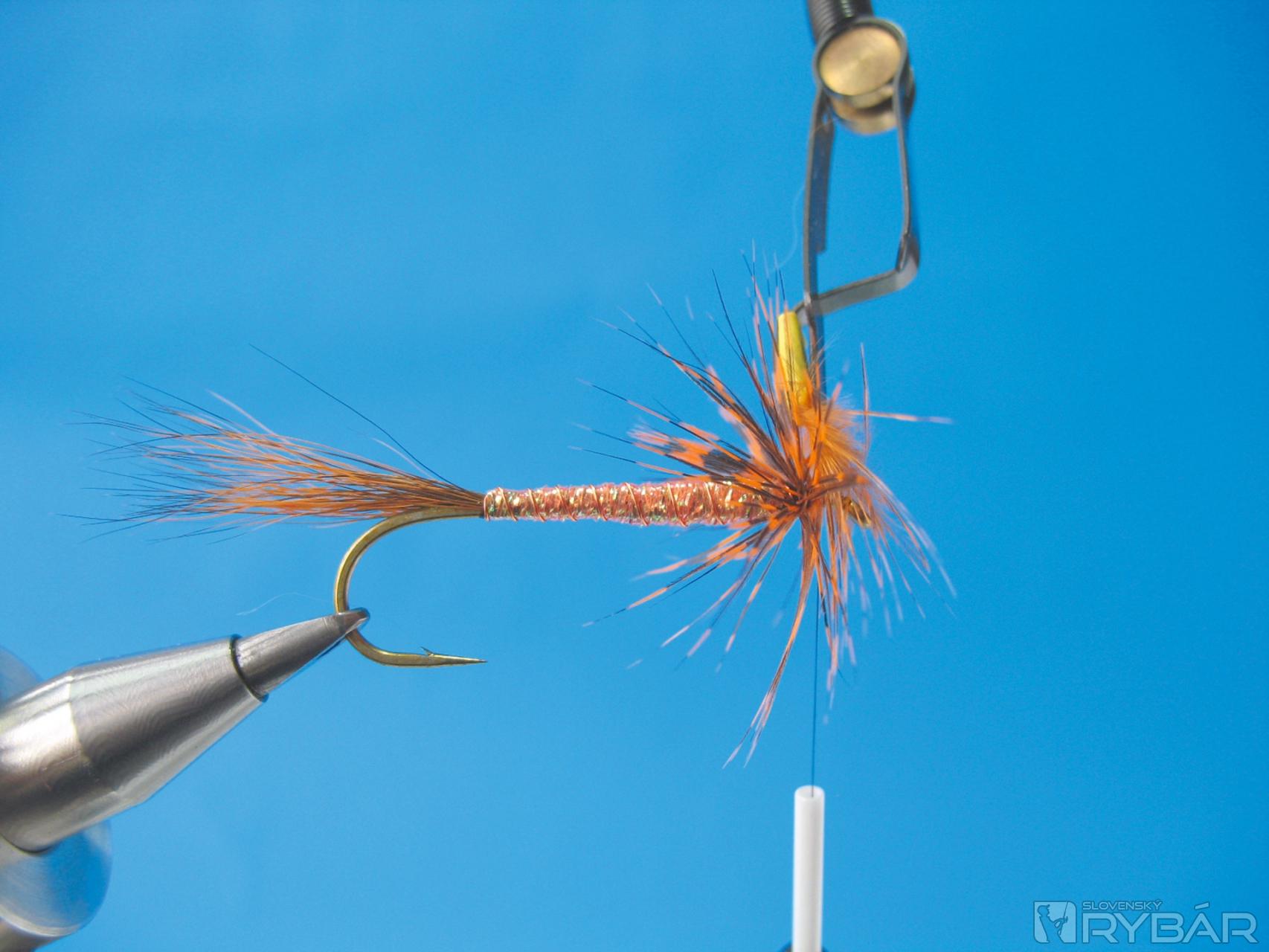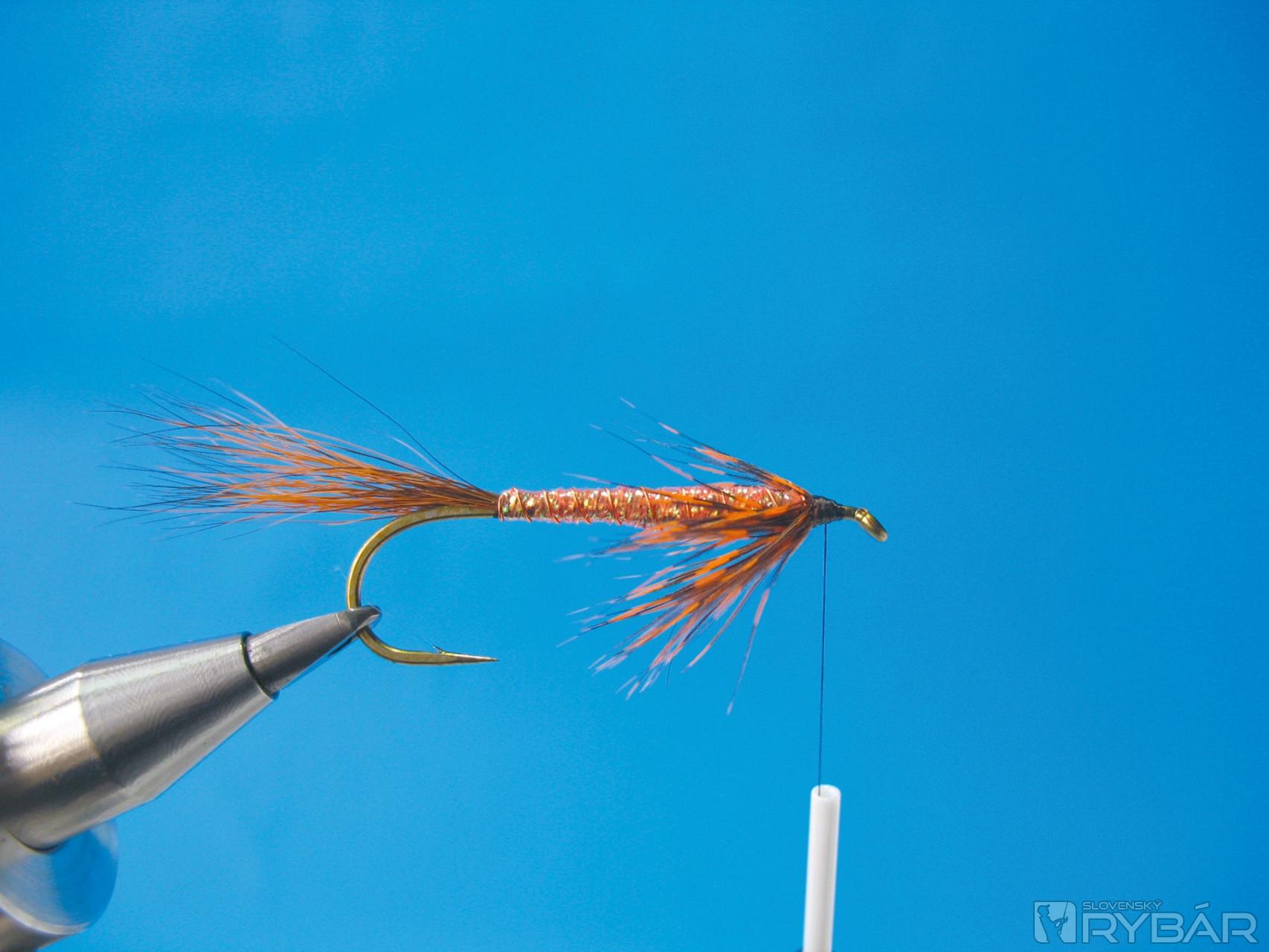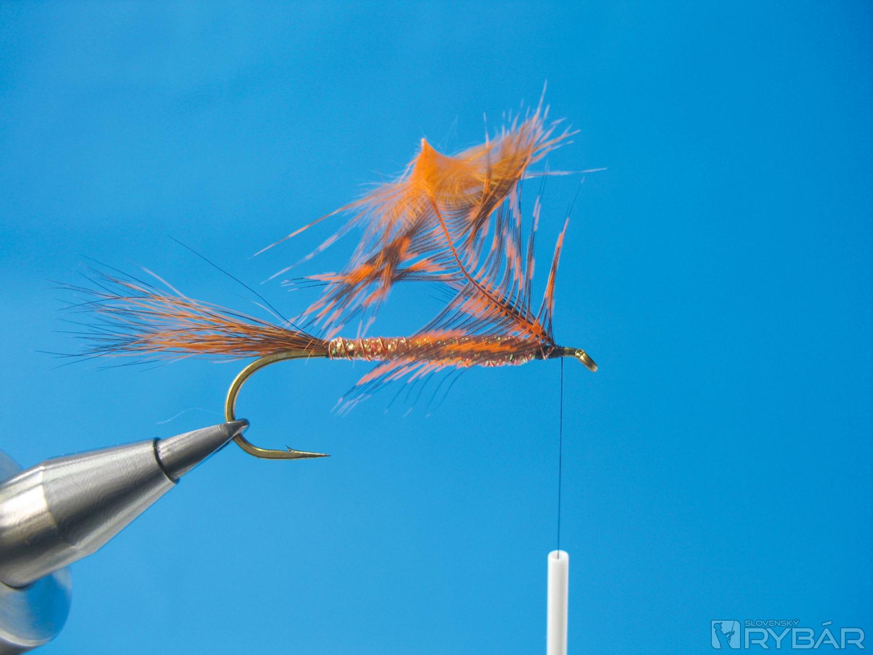 Potom už je dokončenie mušky pomerne jednoduché: po prekrúžkovaní drôtikom si naviažete plutvičky z kosierika perličky, keď pierko naviažete klasickým spôsobom a naviniete okolo ramienka háčika. Potom ich niťou stiahnete do snopčeka a zaistíte.