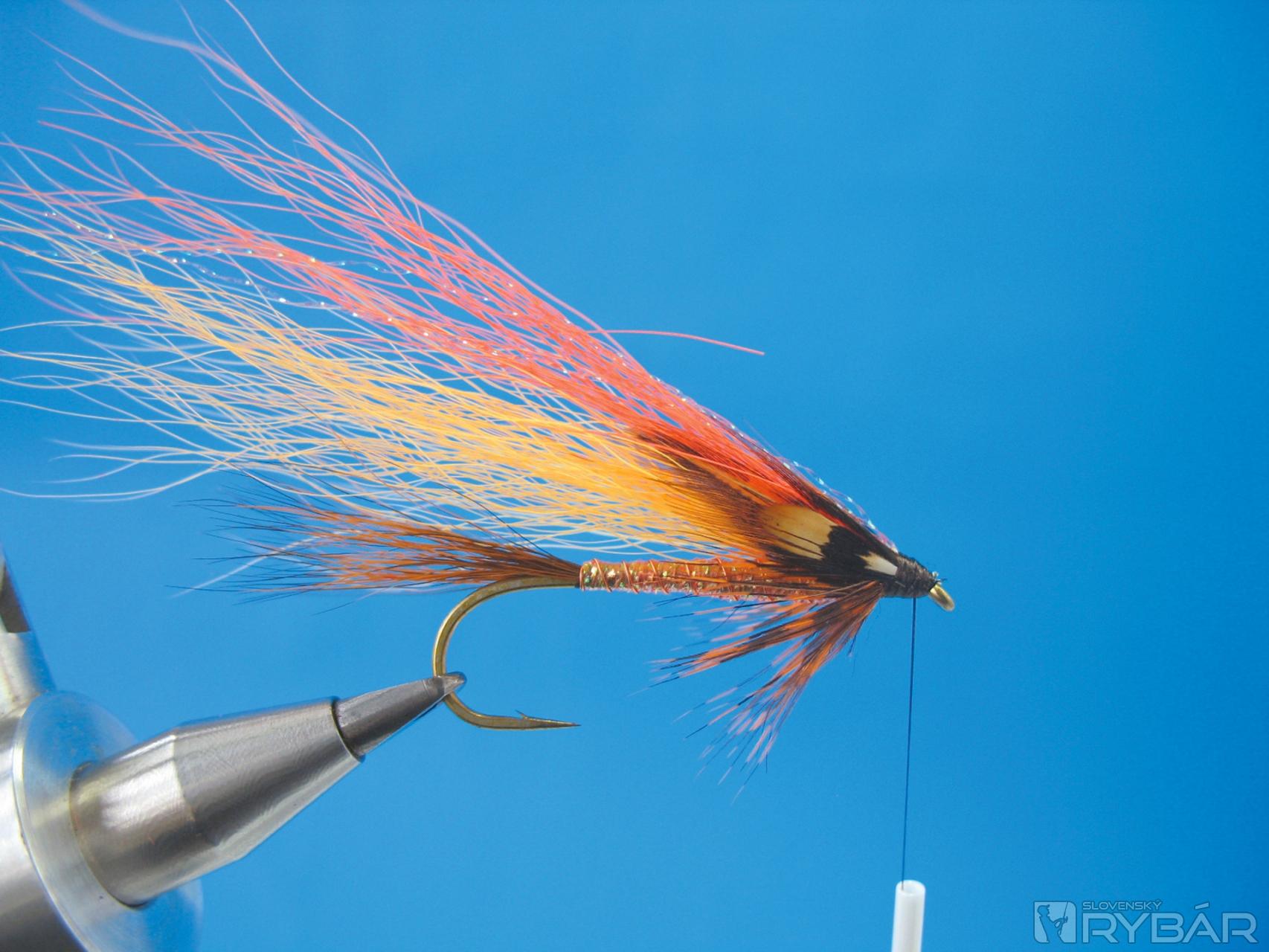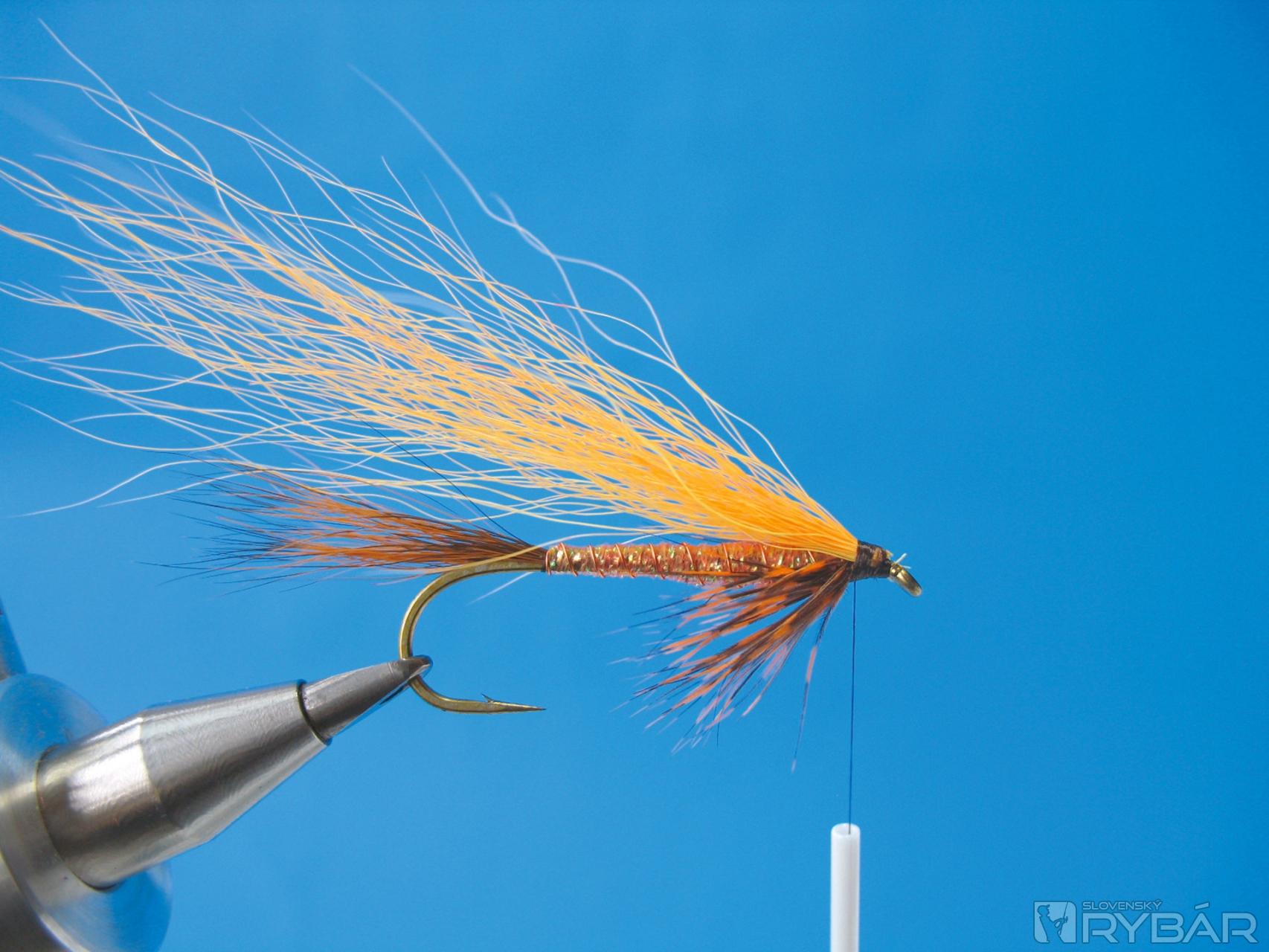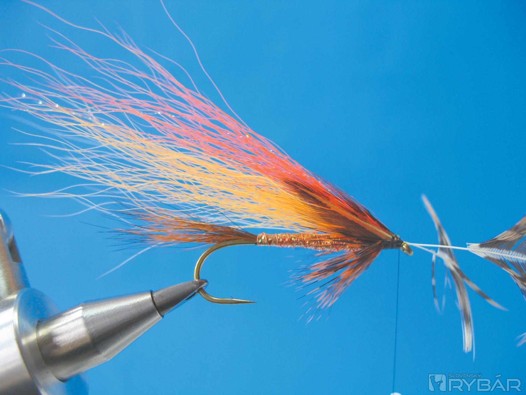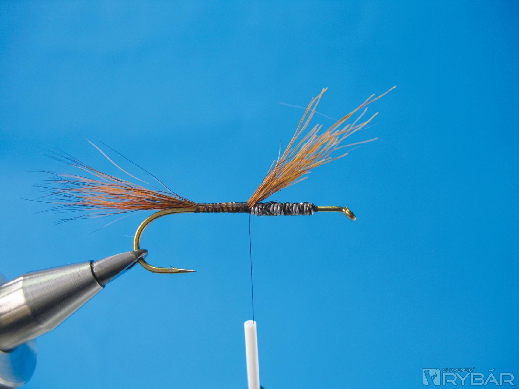 Potom už je dokončenie mušky pomerne jednoduché: po prekrúžkovaní drôtikom si naviažete plutvičky z kosierika perličky, keď pierko naviažete klasickým spôsobom a naviniete okolo ramienka háčika. Potom ich niťou stiahnete do snopčeka a zaistíte.