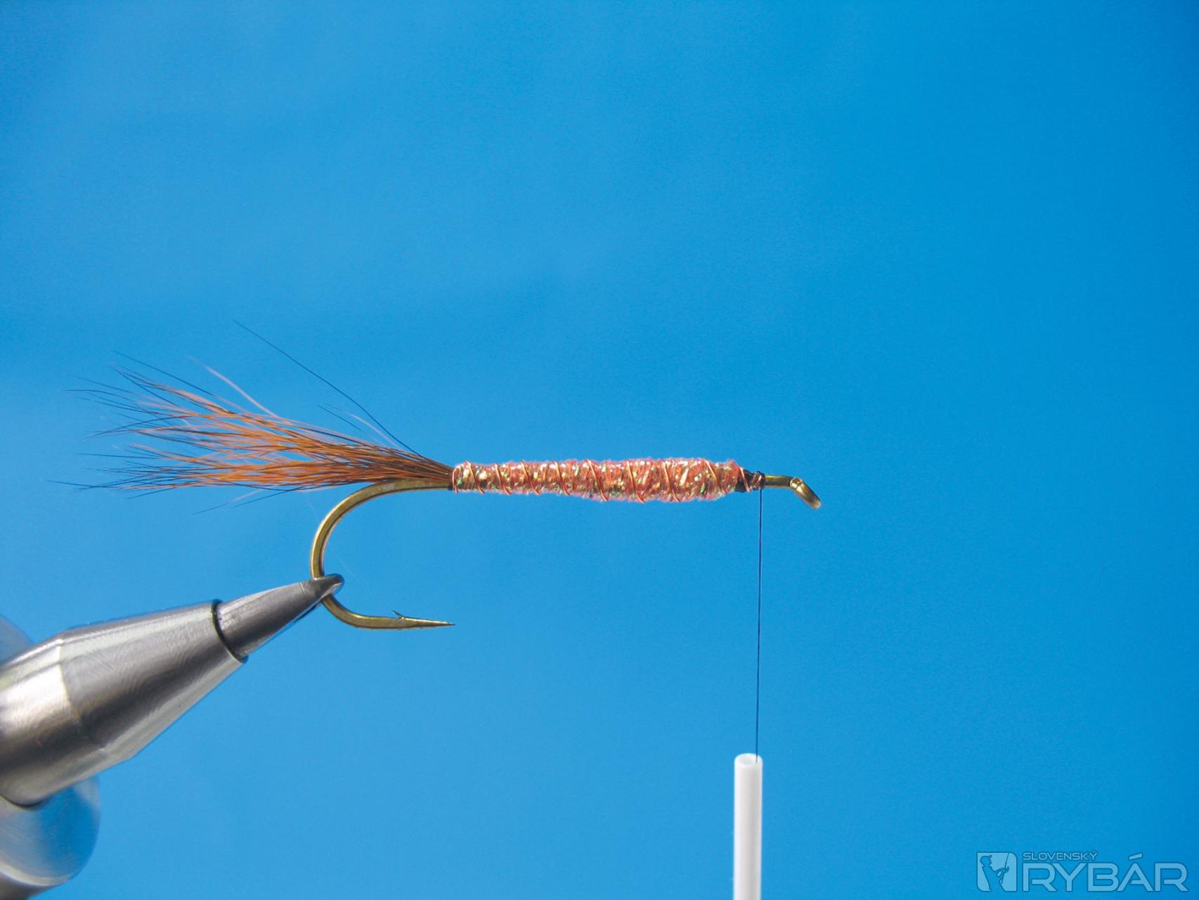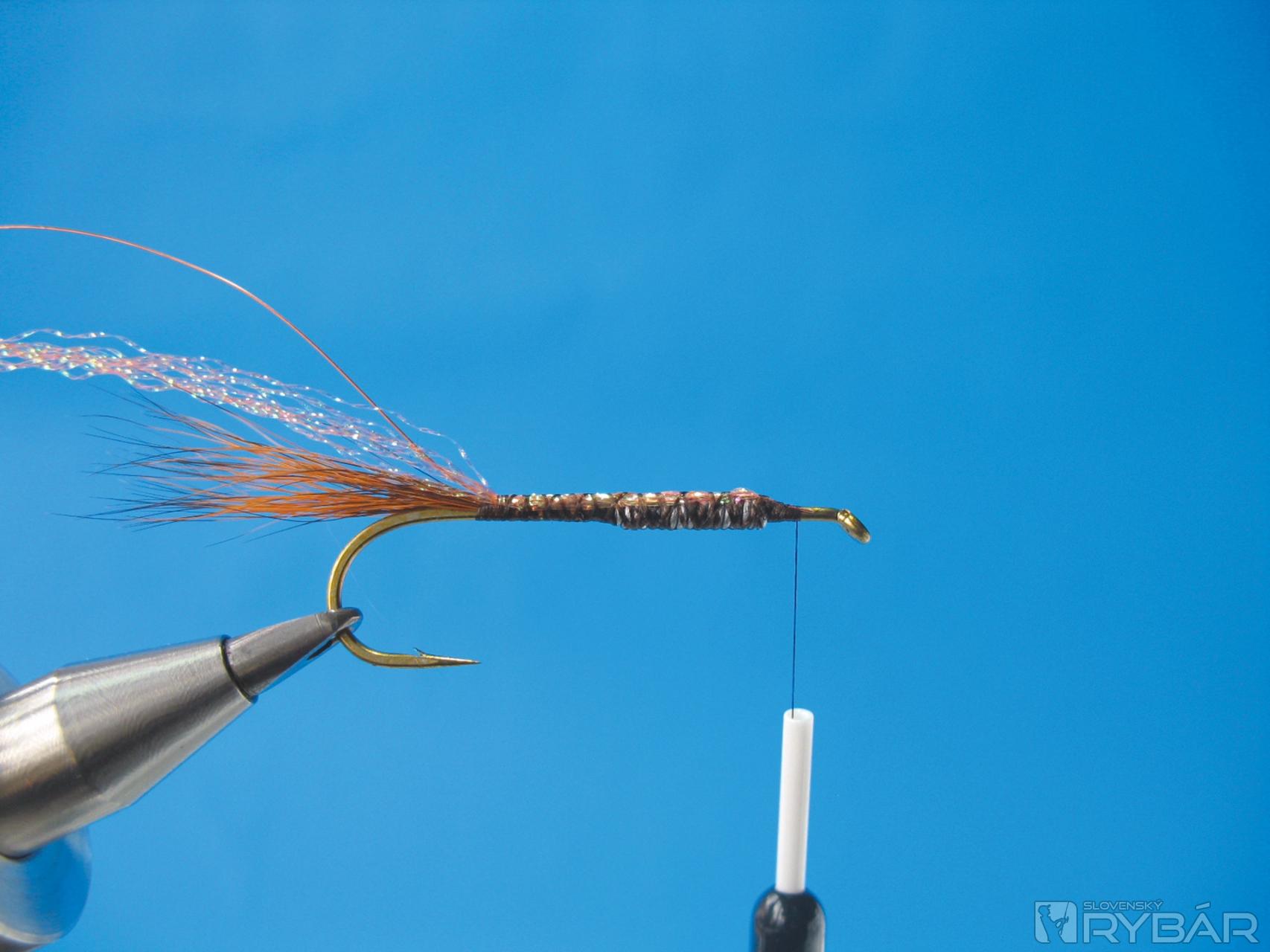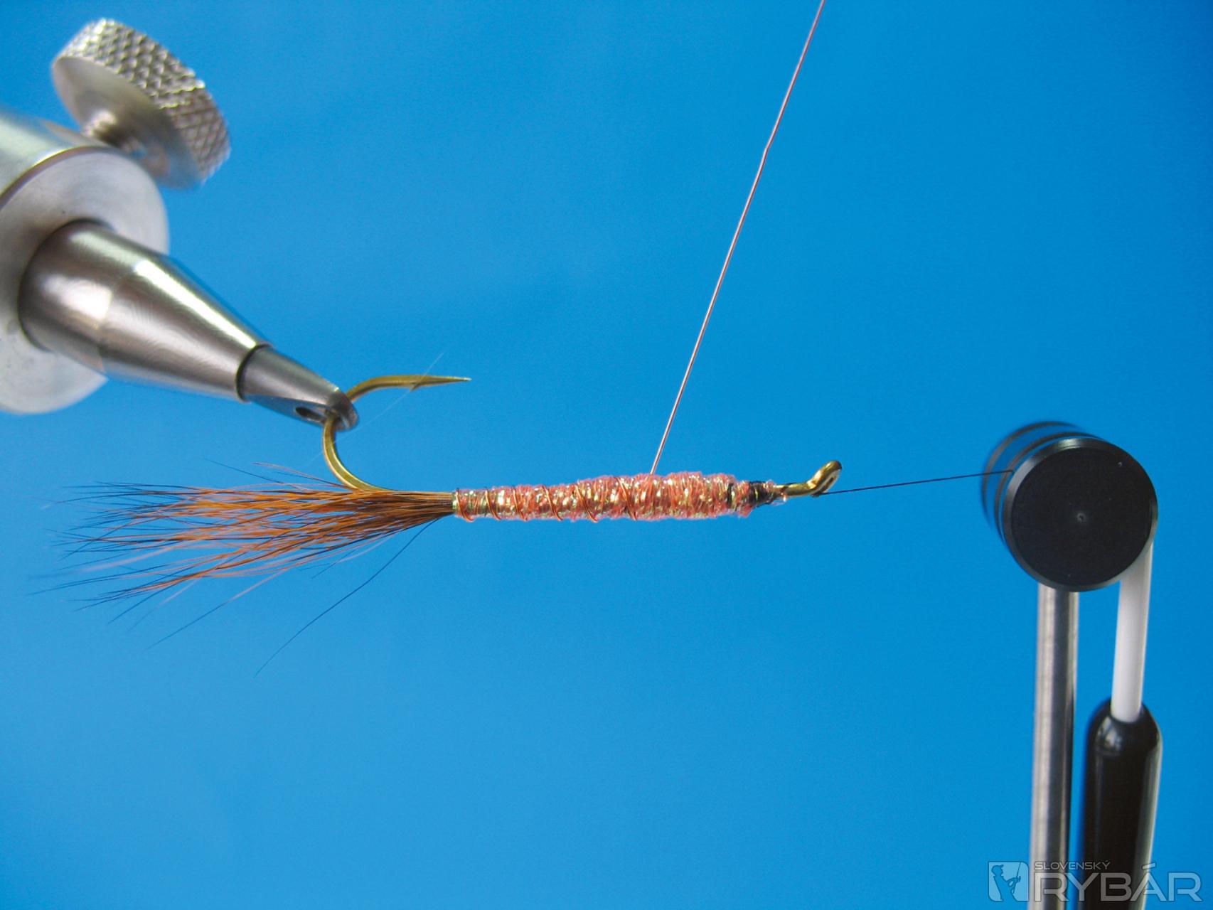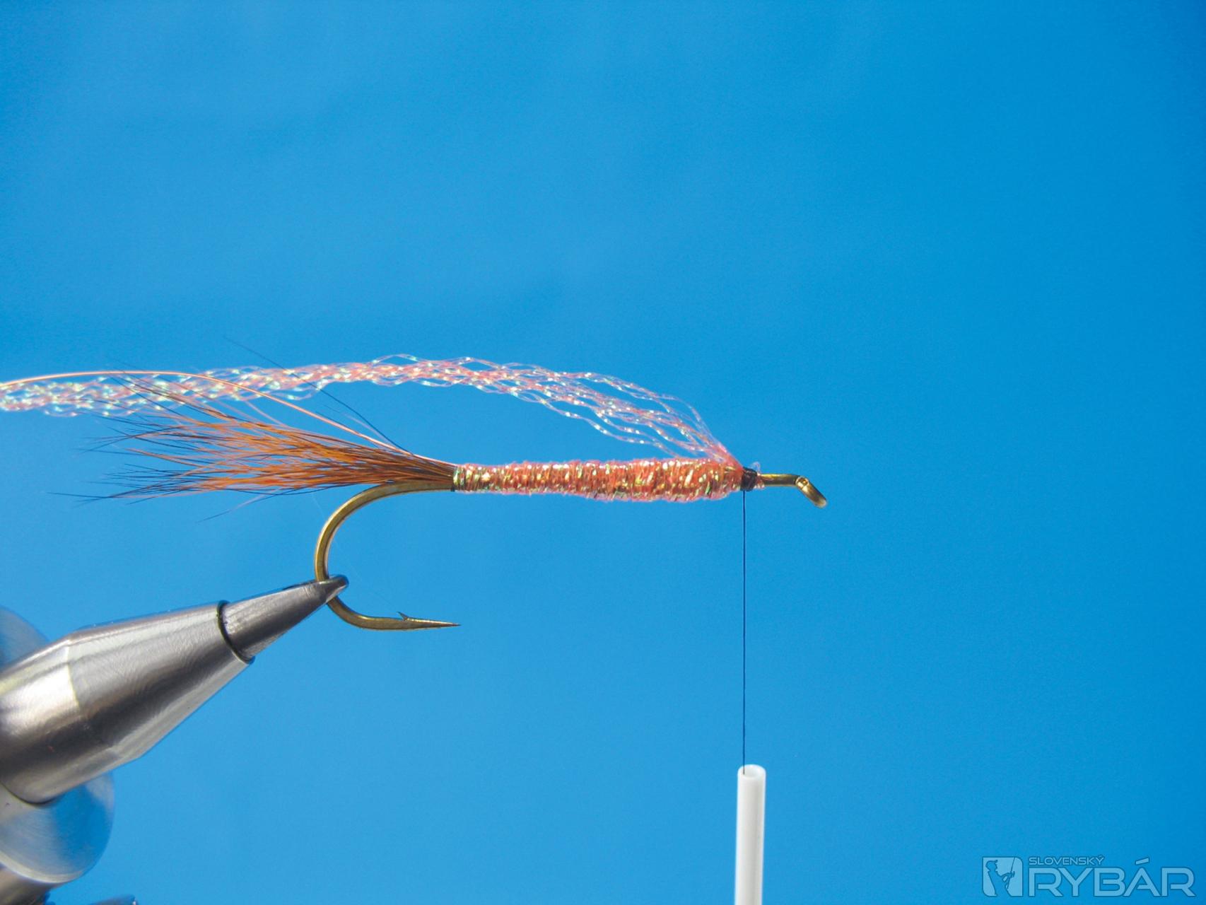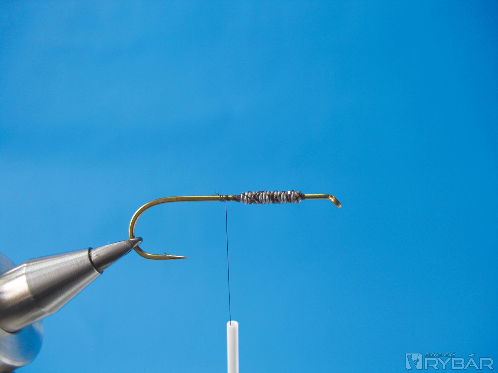 Viazanie začneme tak, že si po naviazaní nite v prvej polovici ramienka háčika navinieme olovený drôtik. V druhej polovici si naviažeme snopček srsti, ktorý bude napodobňovať plutvičky. Potom si nachystáme krúžkovací materiál, telíčko si naviažeme veľmi ľahko zo snopčeka lesklých vlákien Crystal Flash. Ak máte zveráčik s rotačným ramenom, budete mať prácu výrazne uľahčenú, pretože naviniete telíčko presne v priebehu niekoľkých sekúnd.