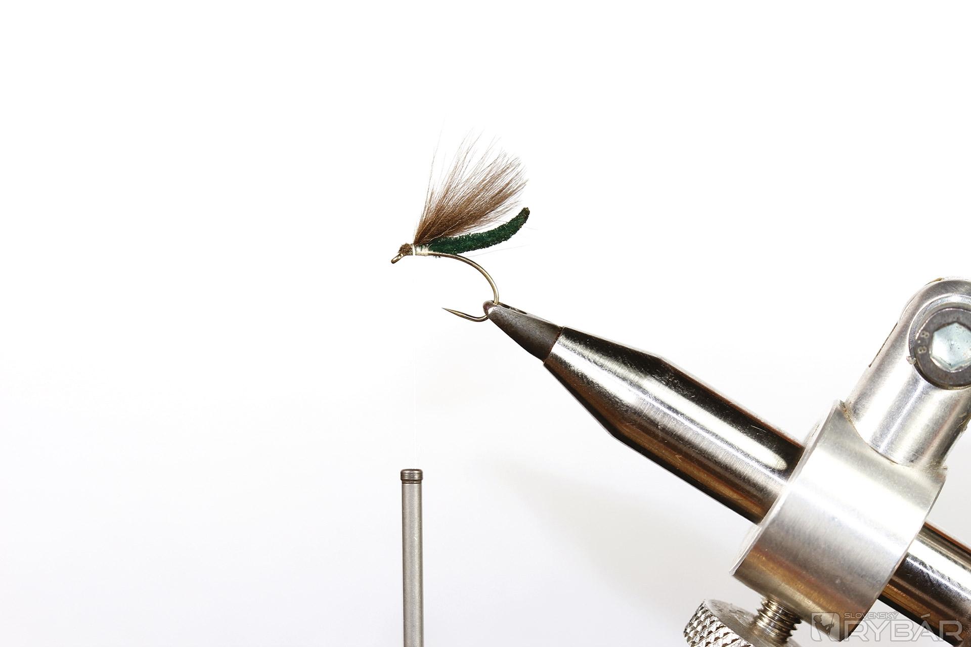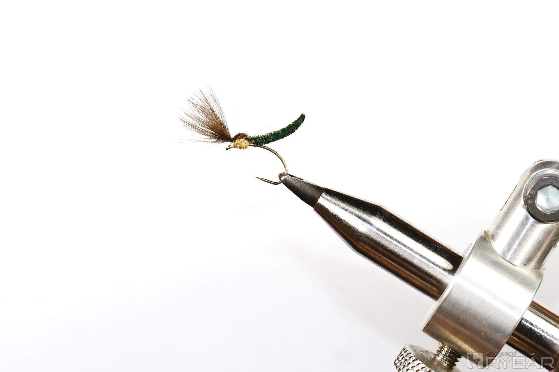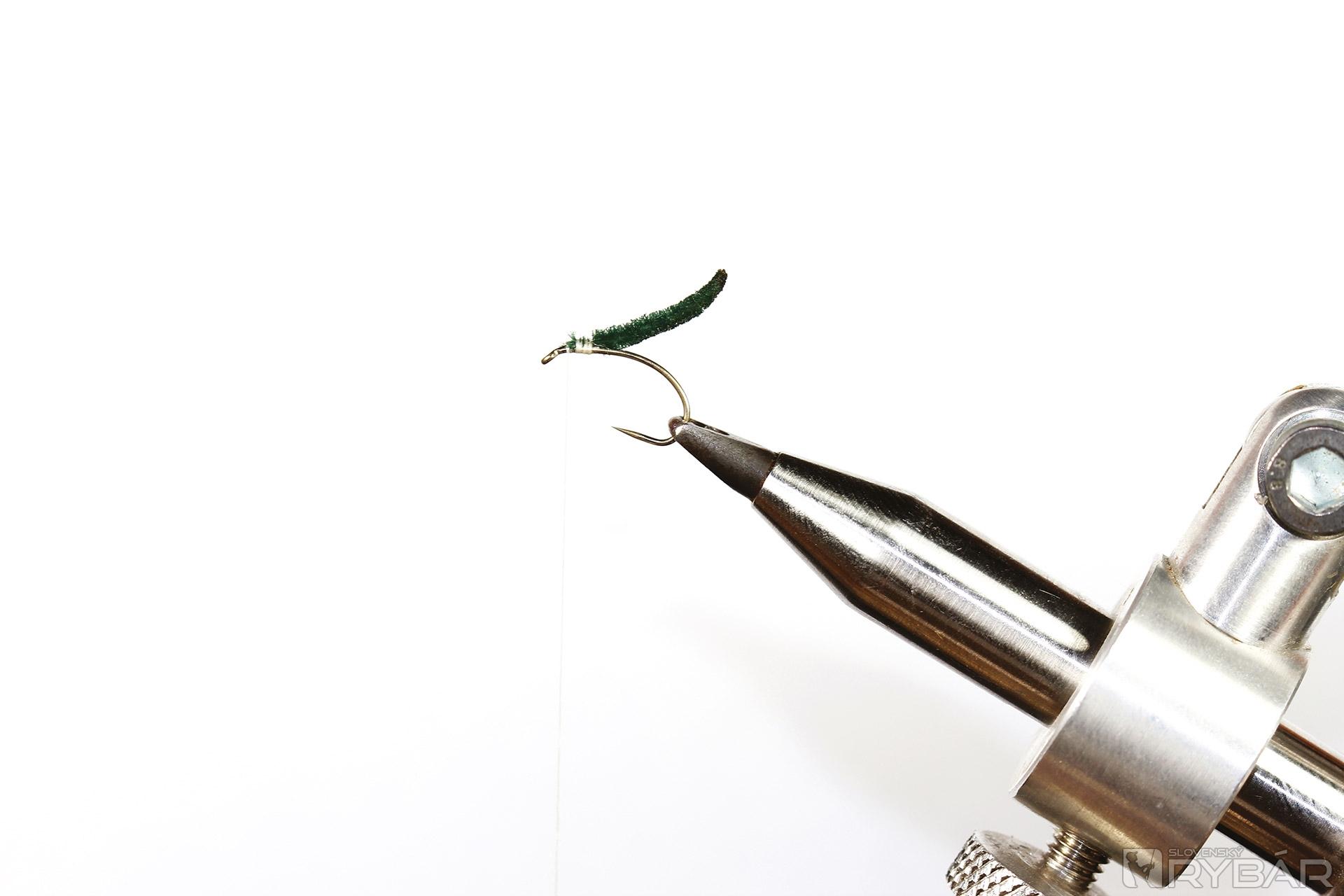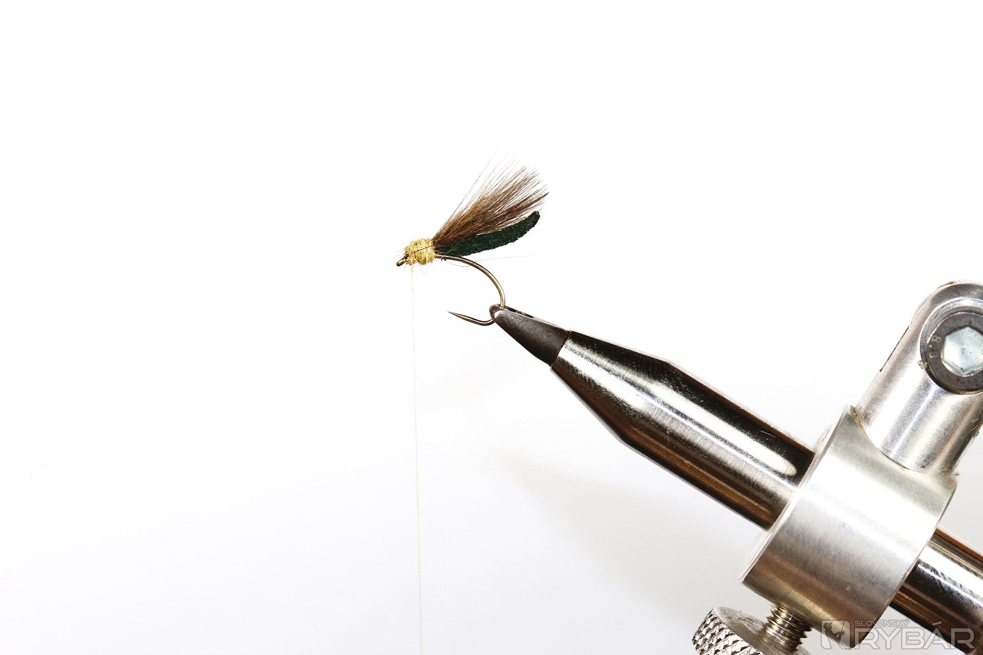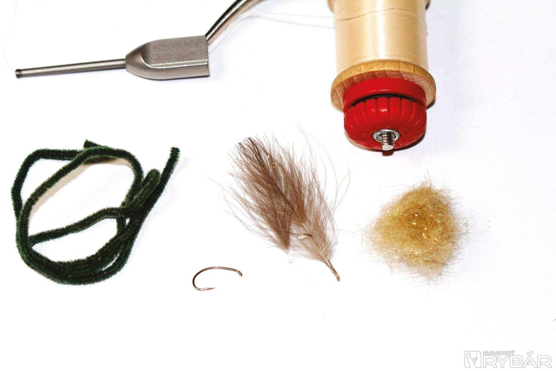 jemný krivákový háčik, šenilka, viazacia niť, dabing, jedno, alebo dve pierka CDC.