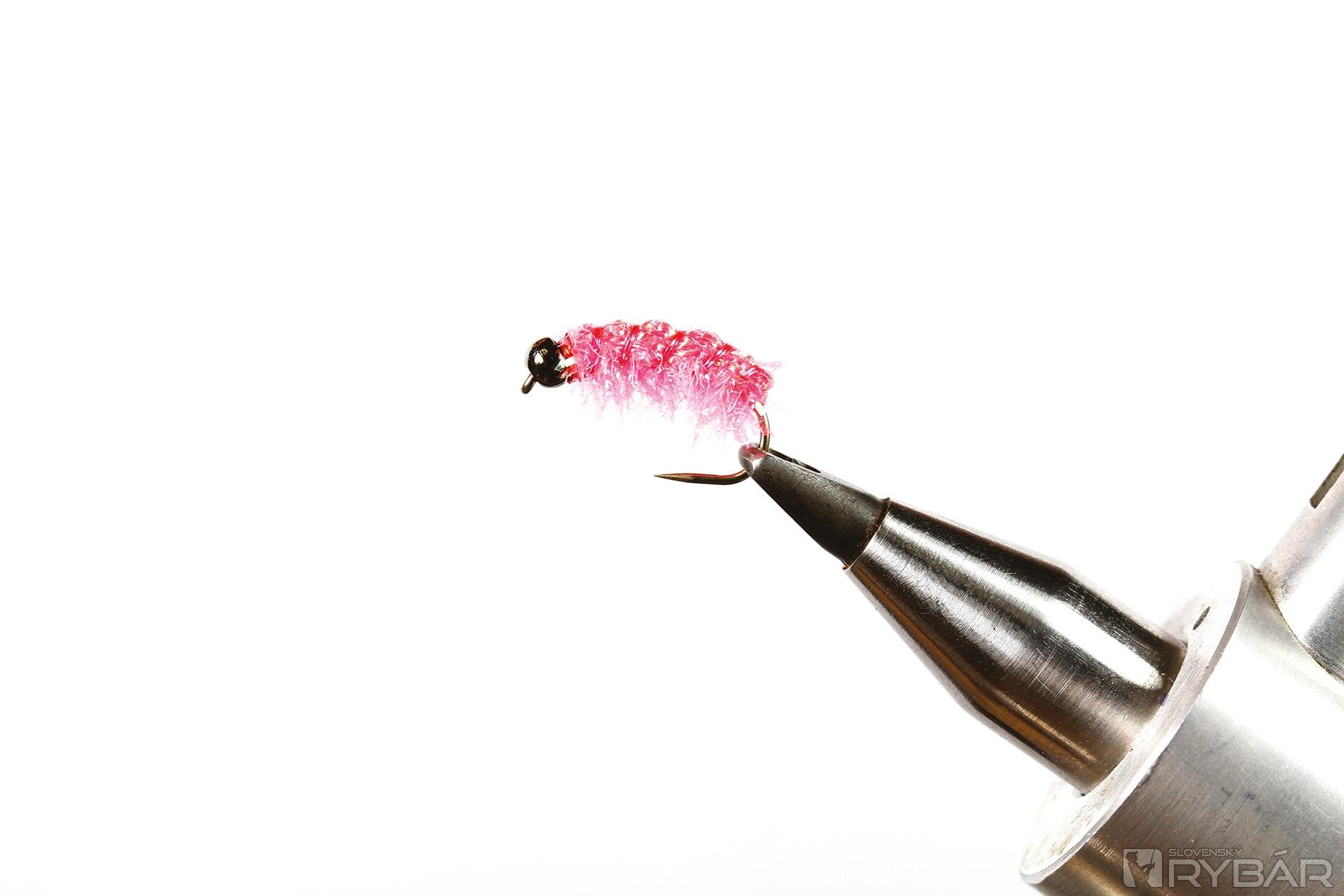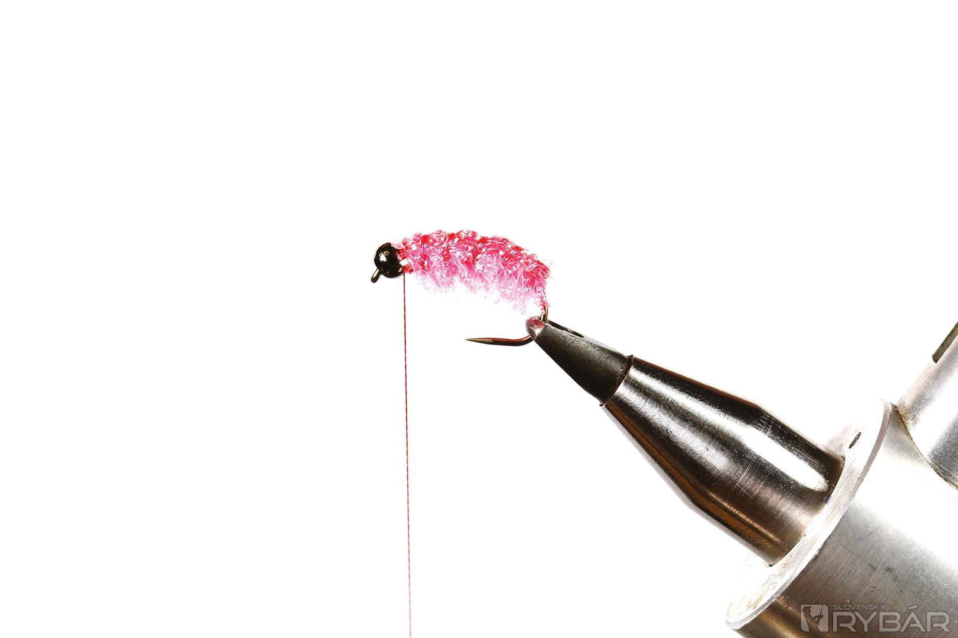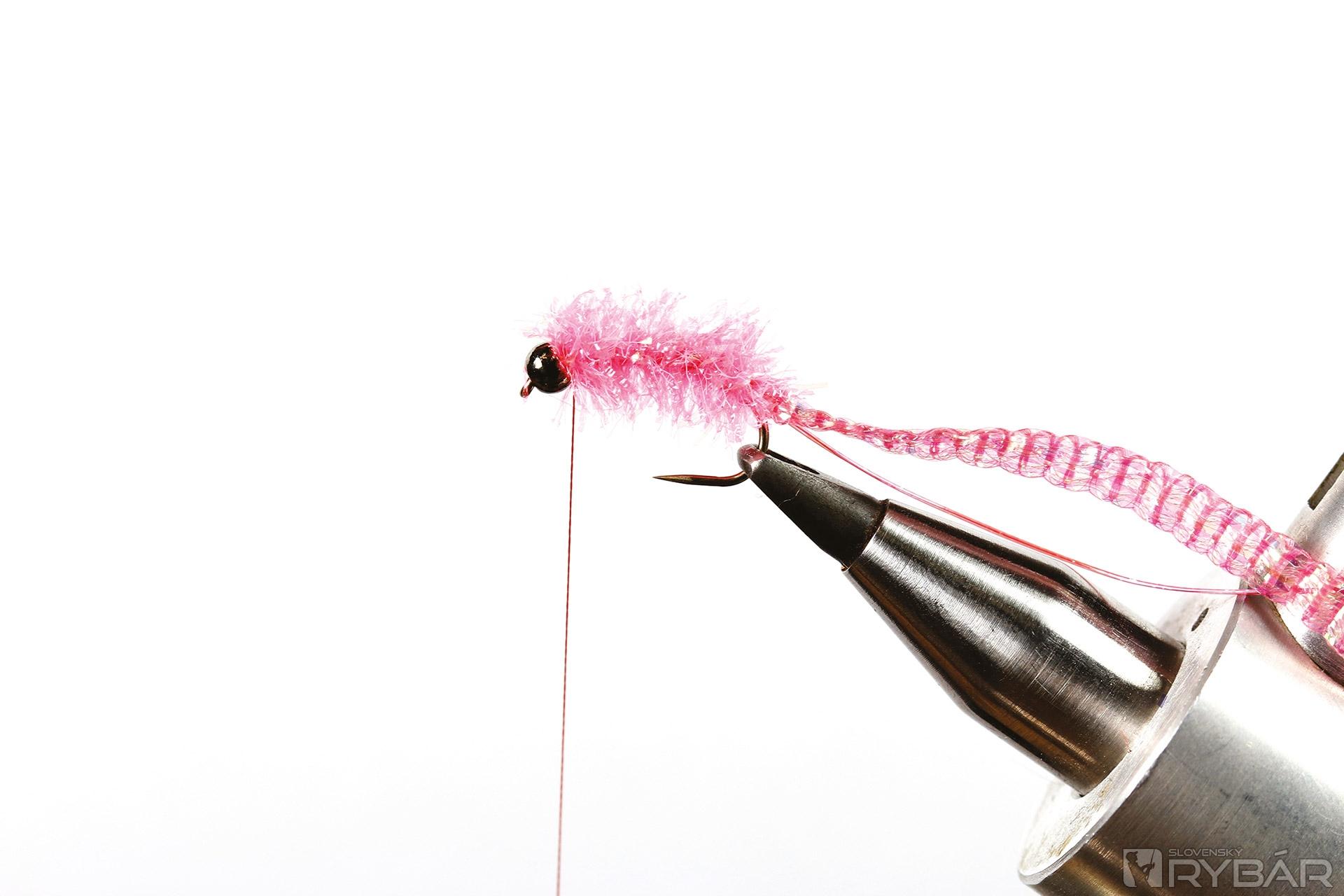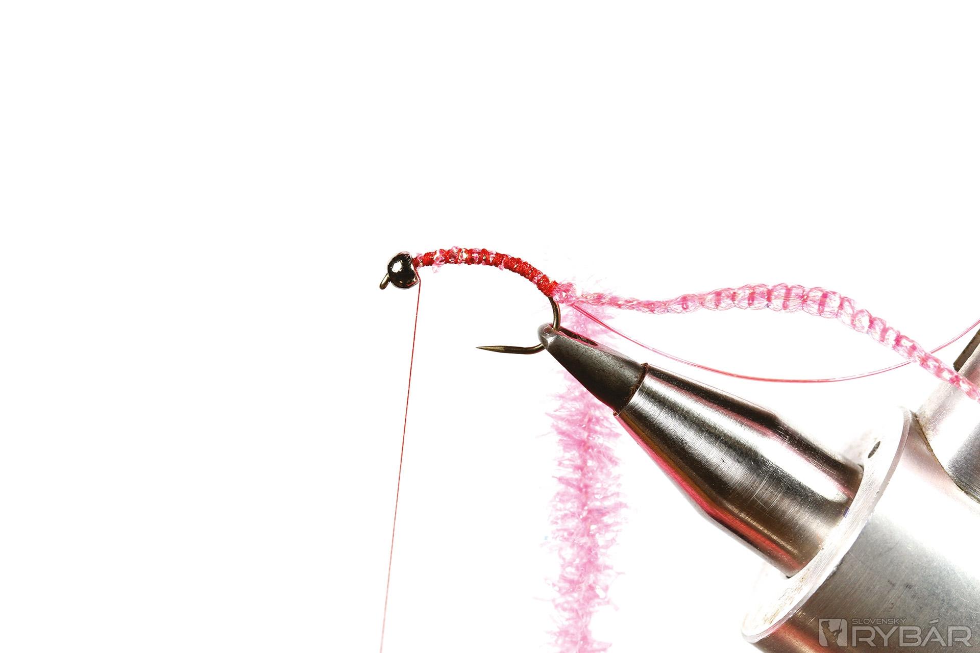 krivákový háčik, tmavá volfrámová guľôčka, červená viazacia niť, ružová UV lametka, ružová mikrošenilka, ružový chrbátikový Spectra Flash.