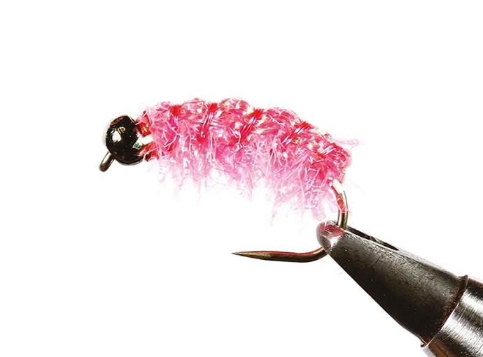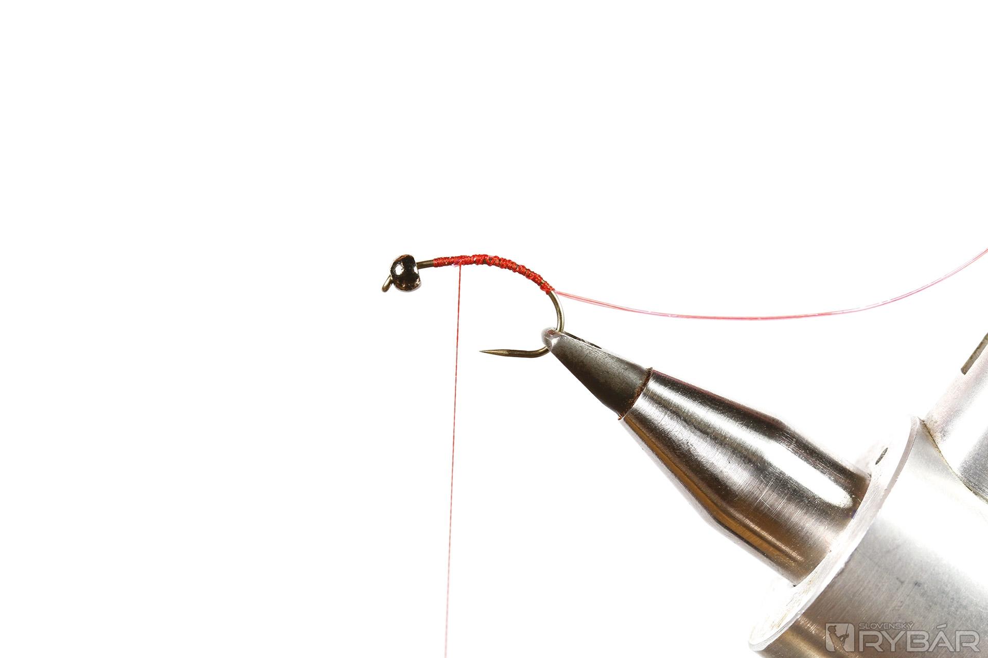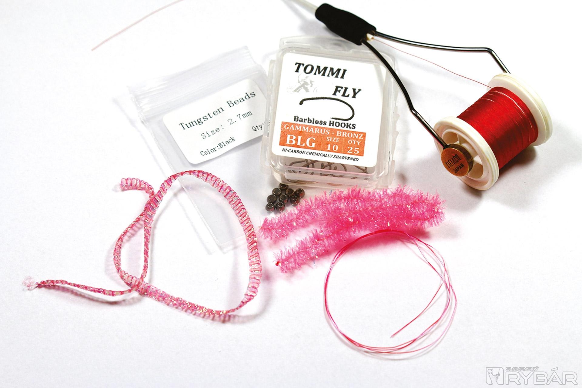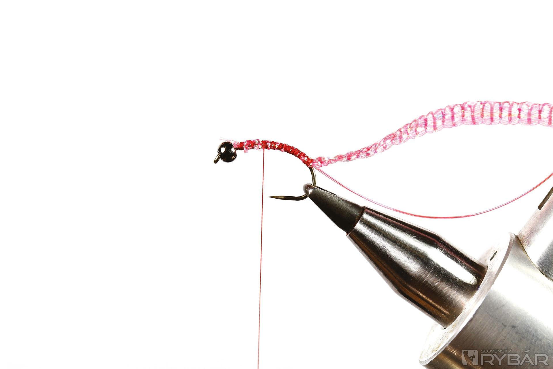 krivákový háčik, tmavá volfrámová guľôčka, červená viazacia niť, ružová UV lametka, ružová mikrošenilka, ružový chrbátikový Spectra Flash.