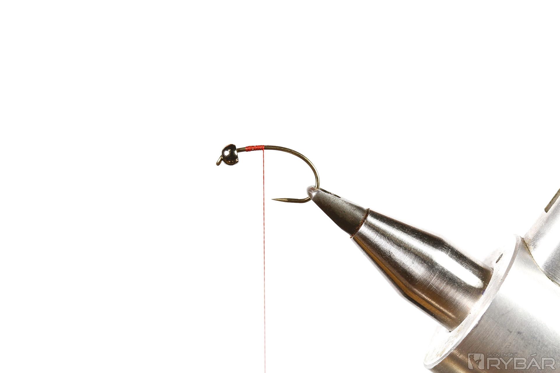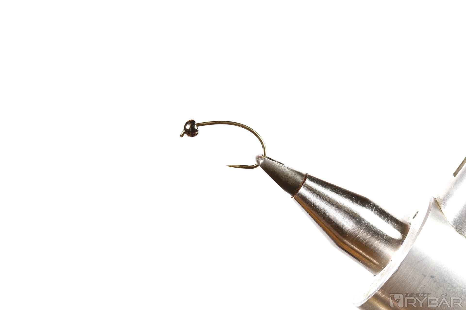 1. Na háčik navlečieme guľôčku a upneme ho do zveráčika.