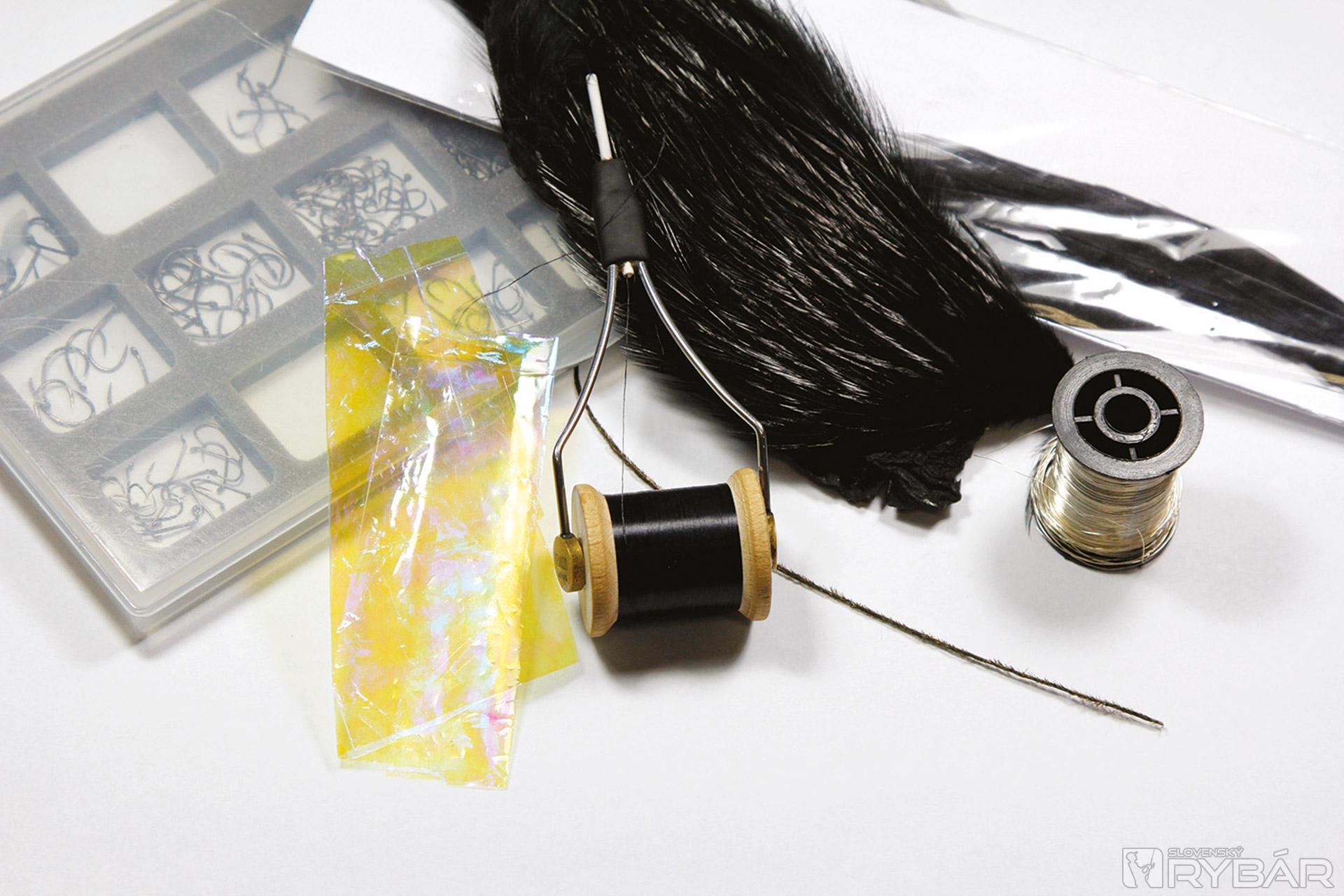 háčik s predĺženým ramienkom, čierna viazacia niť, čierne pero z bažanta, strieborný krúžkovací drôtik, čierne pierko zo sliepky, pierko z páva, perleťová fólia, alebo lametka.