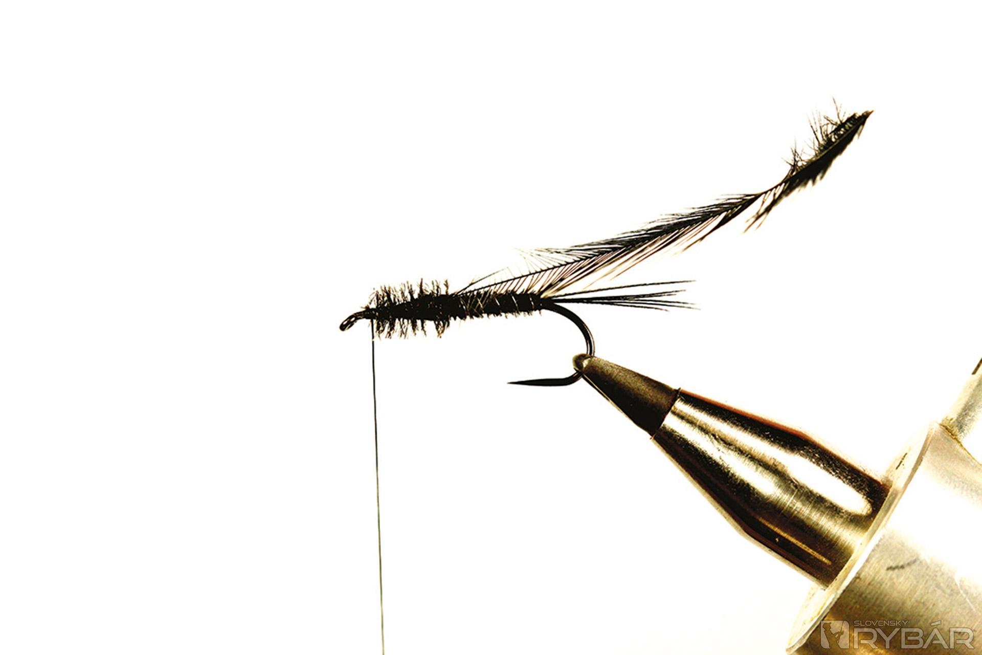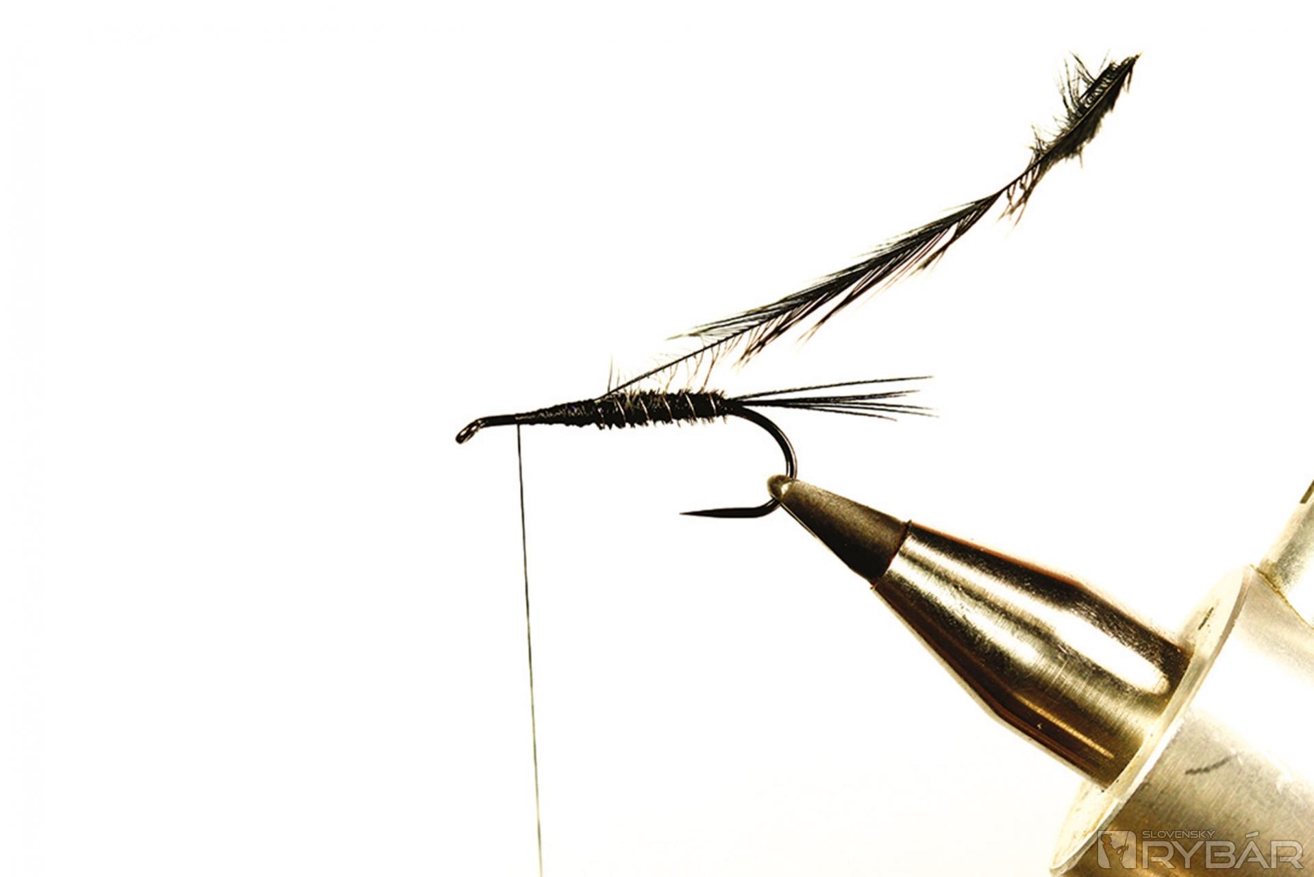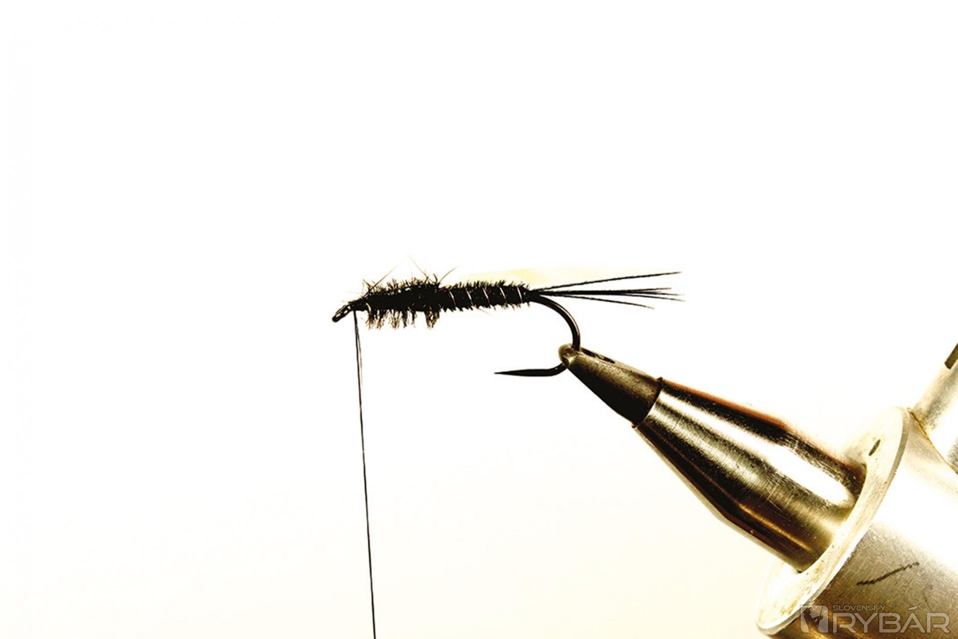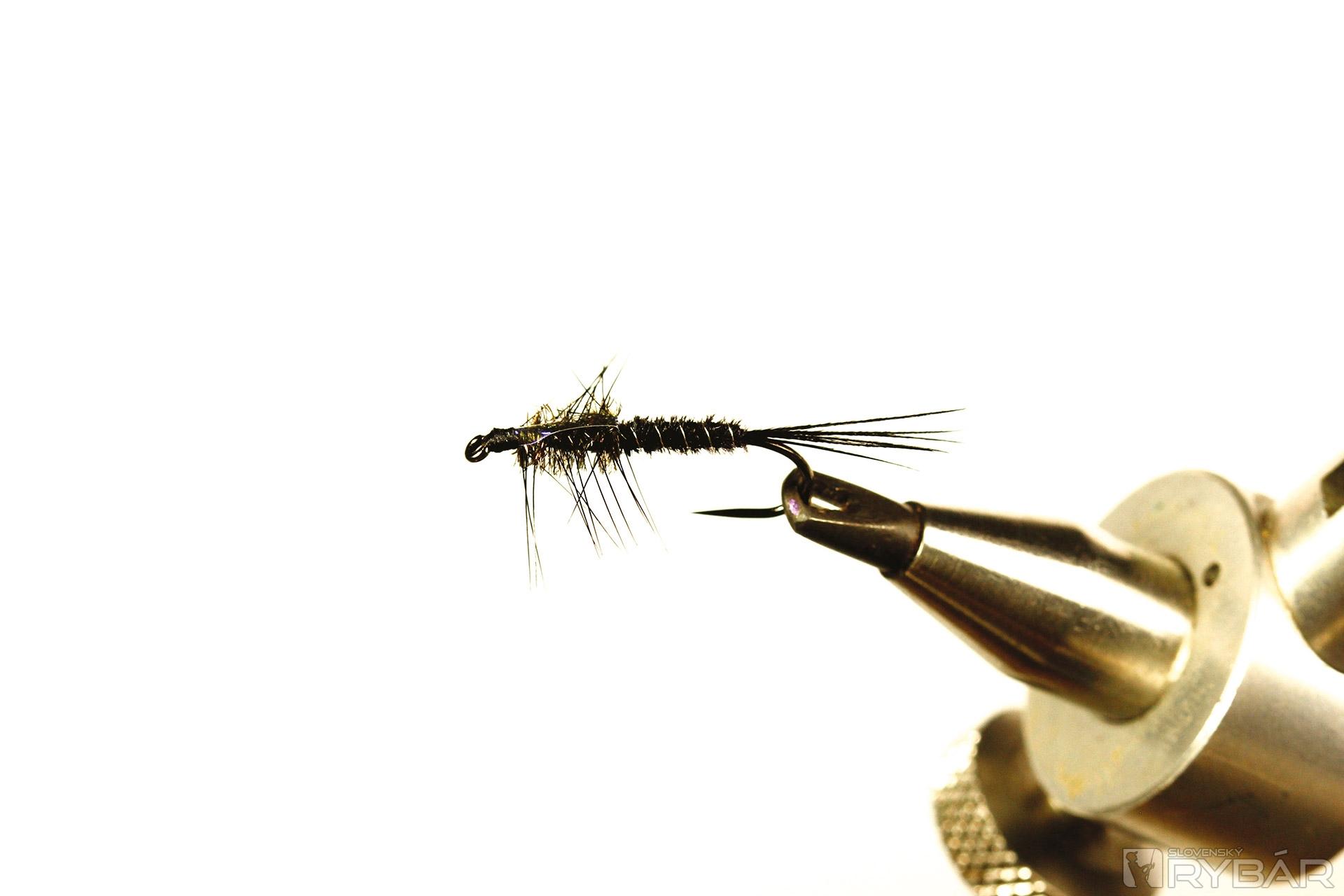 Tmavá muška vhodná do veľmi čistej vody. Ideálne je viazať ju v malých veľkostiach, najmä na zimný lov, ale pre ilustráciu som ju viazal a fotil na väčšom háčiku, preto je tento vzor trochu viac „rozťahaný“ ako by bolo vhodné. Lovíme ako s klasickou ľahkou nymfou, teda v plytkých prúdikoch, alebo v kombinácii s nejakou ťažšou nymfou. Perleťový pásik cez hlavohruď robí veľmi pekný svetelný efekt. Ako väčší vzor je to dobrá muška aj na jazero.