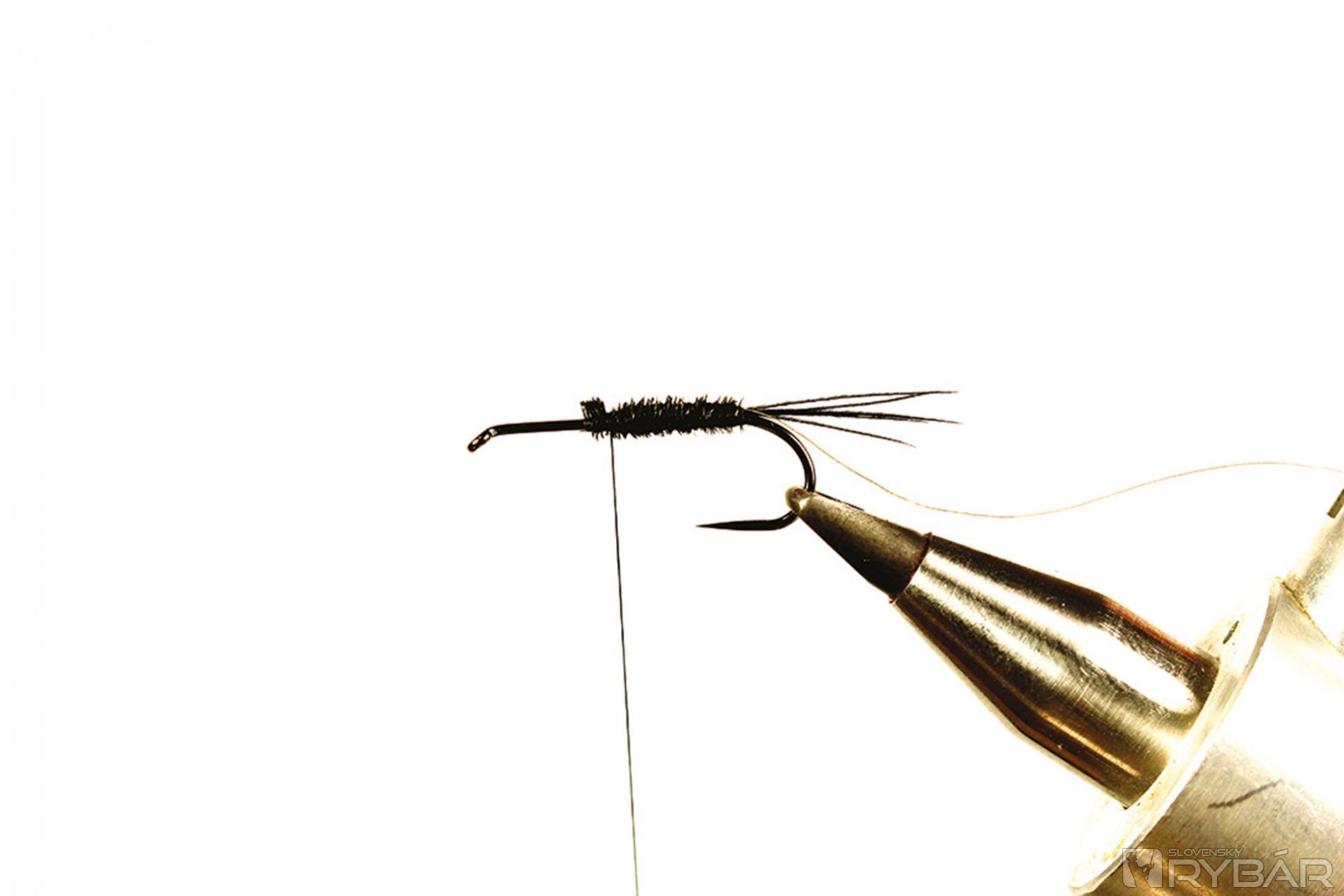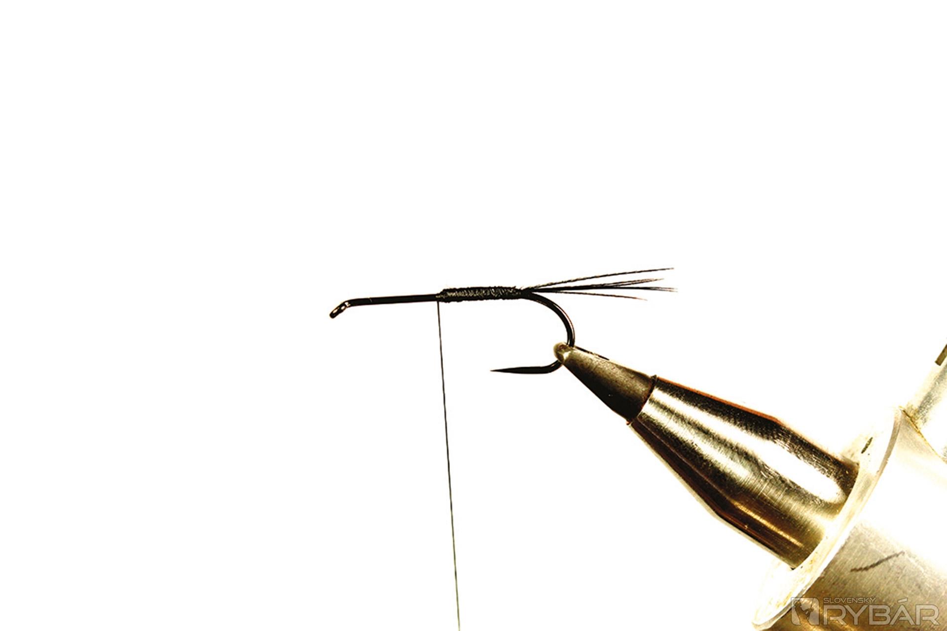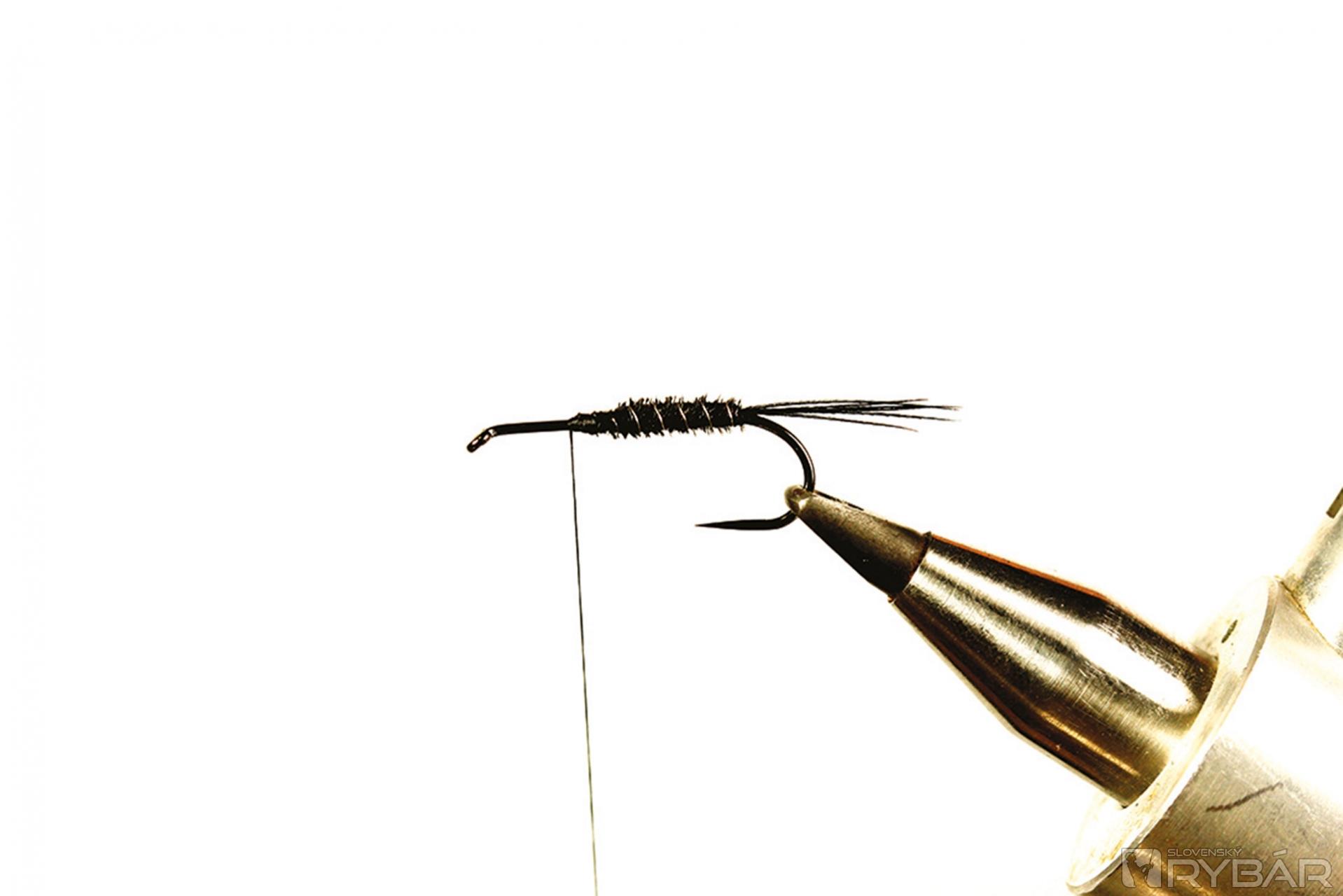 Tmavá muška vhodná do veľmi čistej vody. Ideálne je viazať ju v malých veľkostiach, najmä na zimný lov, ale pre ilustráciu som ju viazal a fotil na väčšom háčiku, preto je tento vzor trochu viac „rozťahaný“ ako by bolo vhodné. Lovíme ako s klasickou ľahkou nymfou, teda v plytkých prúdikoch, alebo v kombinácii s nejakou ťažšou nymfou. Perleťový pásik cez hlavohruď robí veľmi pekný svetelný efekt. Ako väčší vzor je to dobrá muška aj na jazero.
