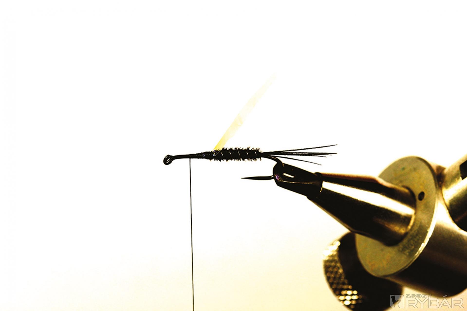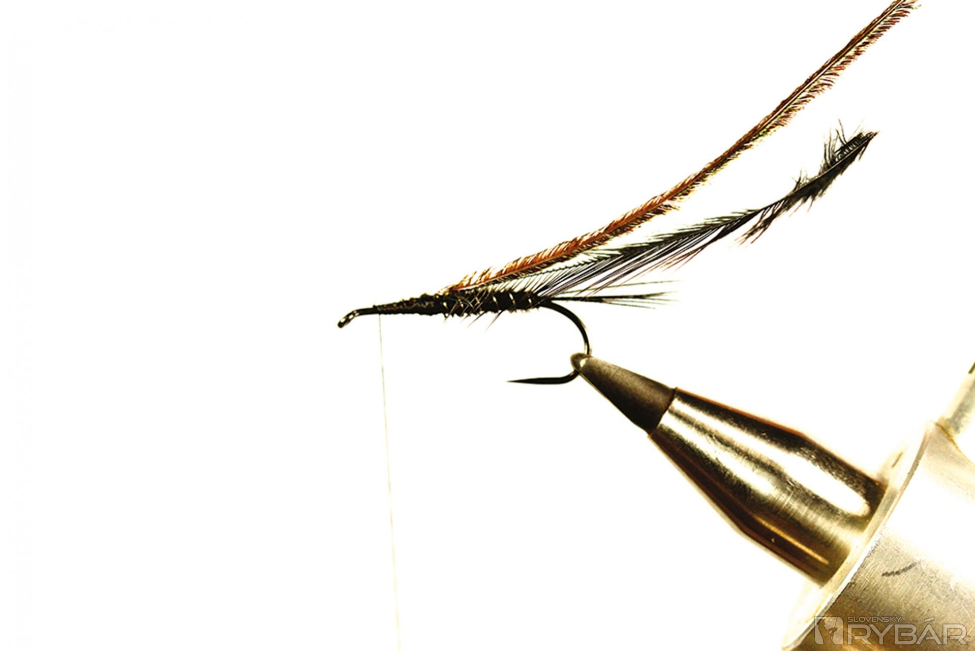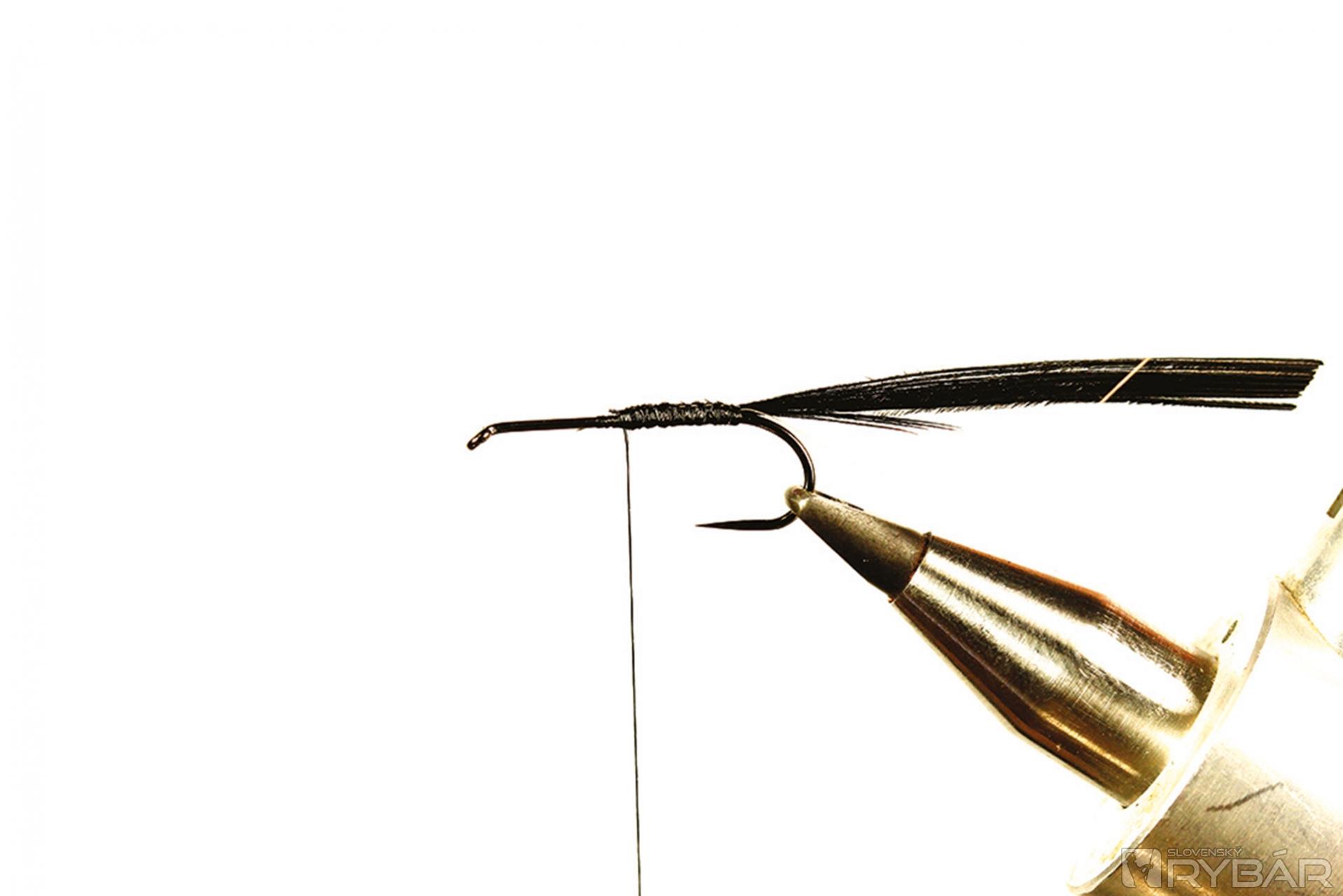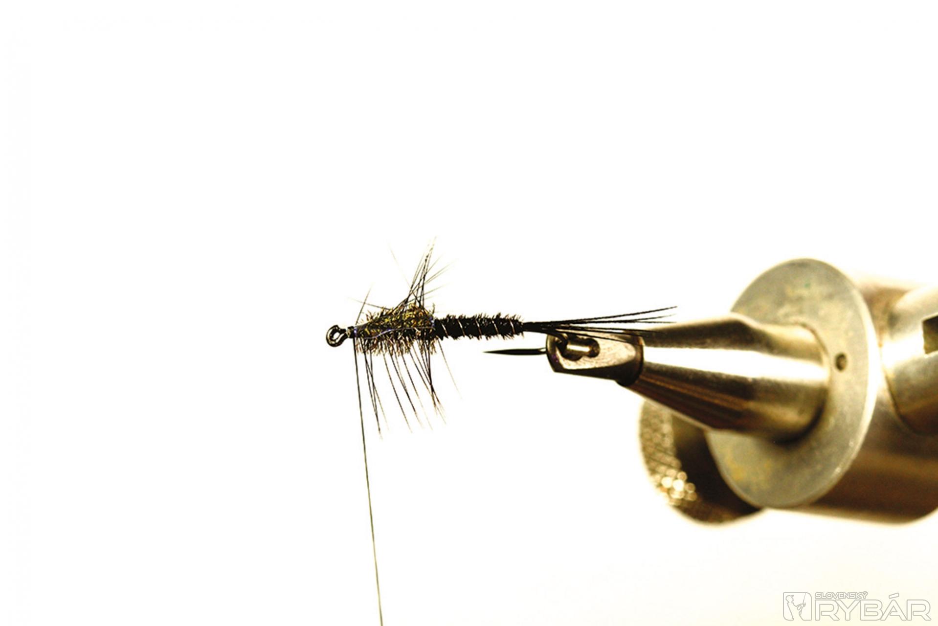 Tmavá muška vhodná do veľmi čistej vody. Ideálne je viazať ju v malých veľkostiach, najmä na zimný lov, ale pre ilustráciu som ju viazal a fotil na väčšom háčiku, preto je tento vzor trochu viac „rozťahaný“ ako by bolo vhodné. Lovíme ako s klasickou ľahkou nymfou, teda v plytkých prúdikoch, alebo v kombinácii s nejakou ťažšou nymfou. Perleťový pásik cez hlavohruď robí veľmi pekný svetelný efekt. Ako väčší vzor je to dobrá muška aj na jazero.