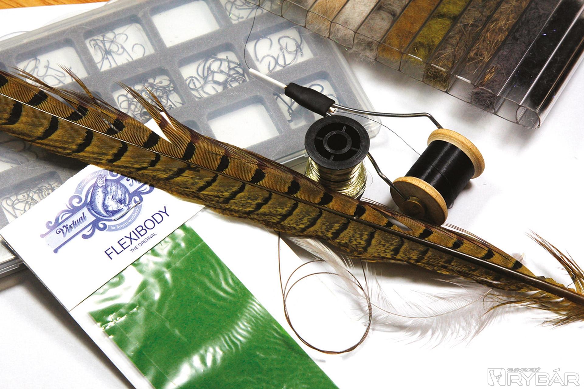 Nymfový háčik, tmavá viazacia niť, hrubší tmavý vlasec, zelená mäkká fólia, sivé pierko z kohúta, žlto-zelené pero z bažanta, zlatý krúžkovací drôtik, mix tmavého dabingu.