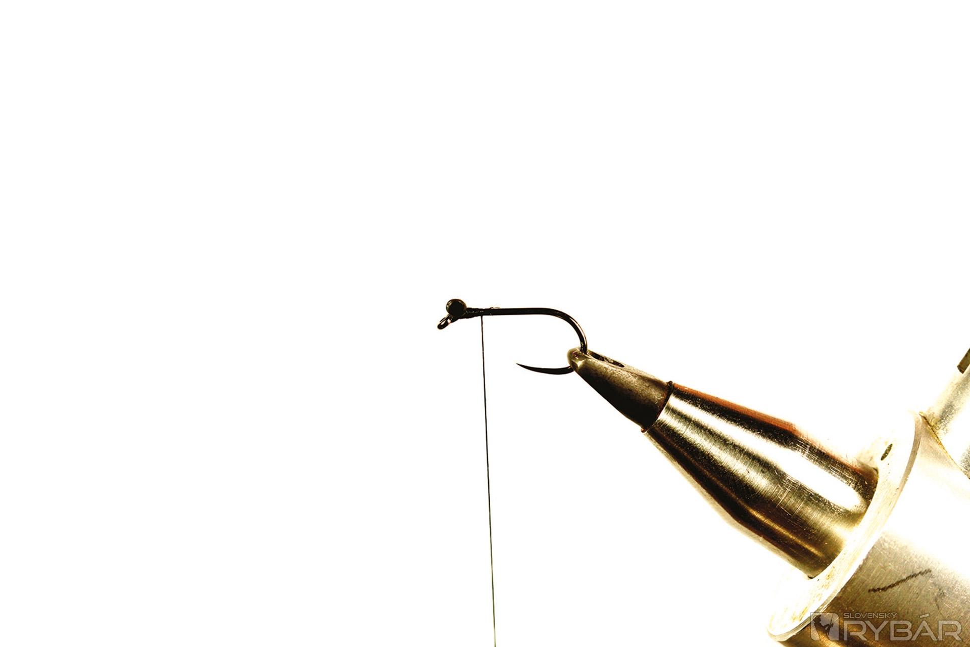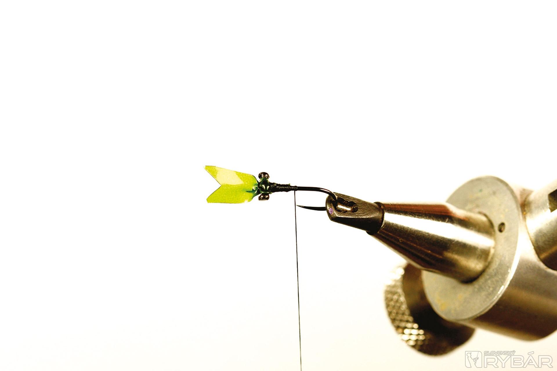 1. Opálením hrubšieho vlasca si zhotovíme „činkové“ oči a tie upevníme na háčik.