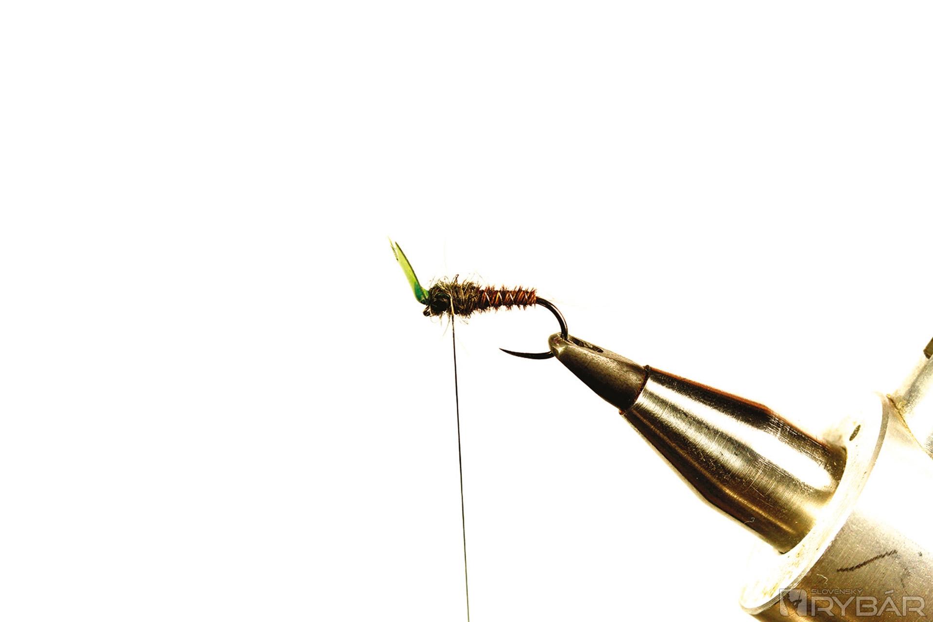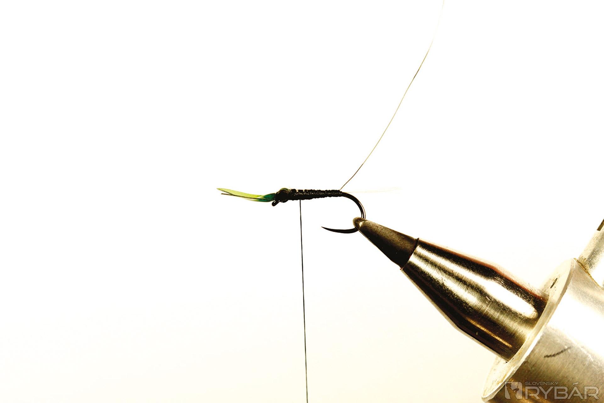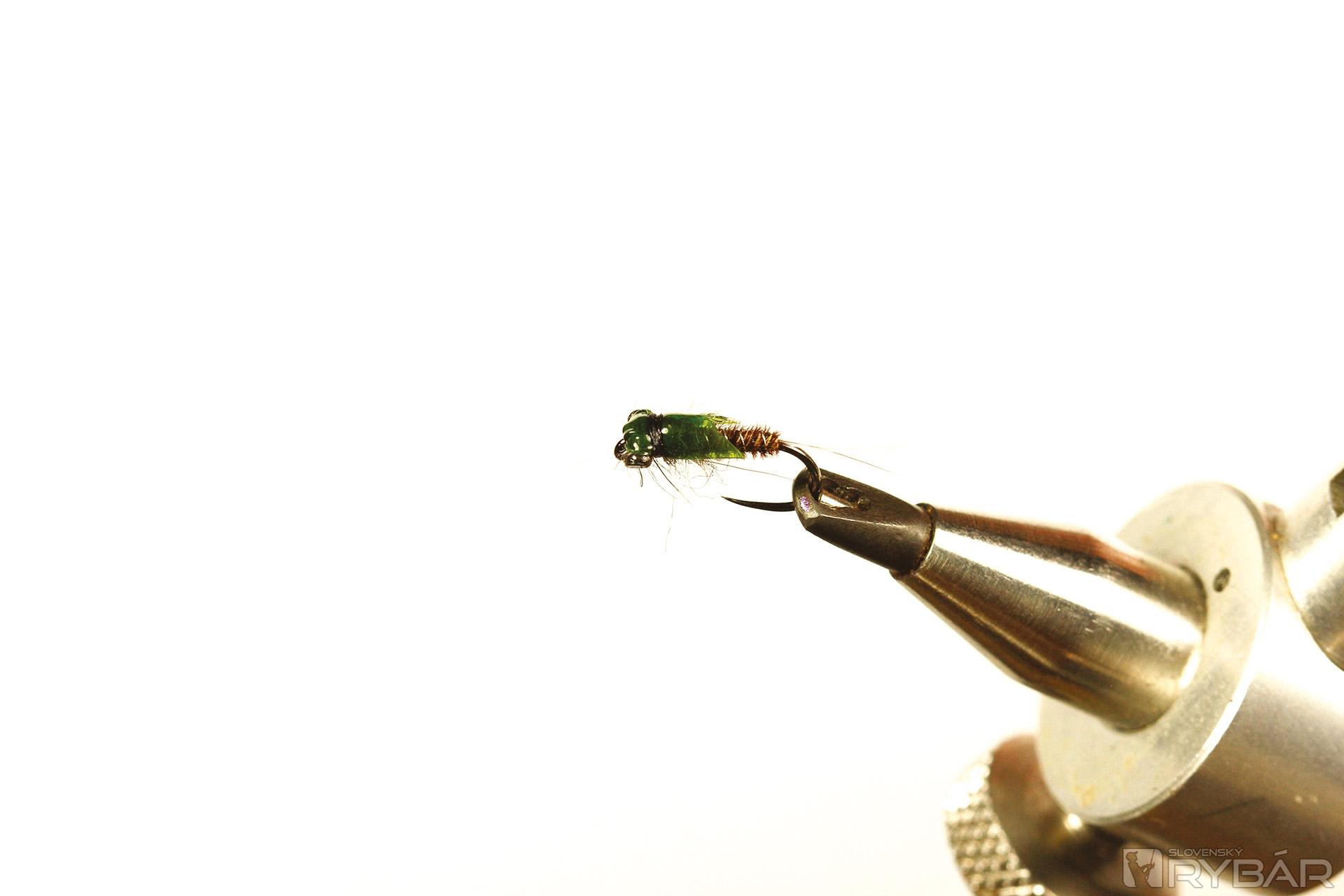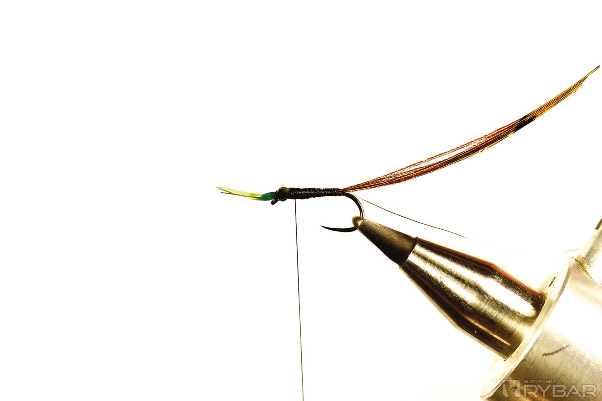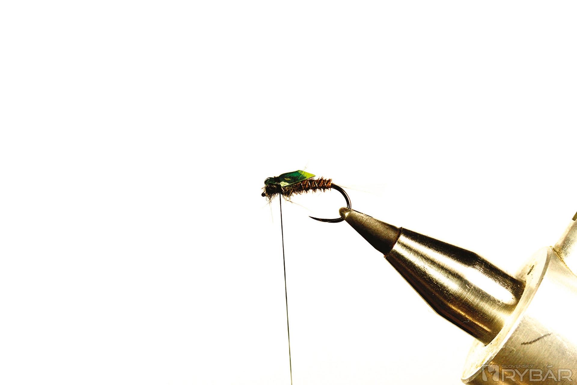Mierne zložitejší vzor nymfy, ale vo výsledku celkom pekná polo-reálna muška. Hodí sa do málo prúdivých úsekov, kde má ryba dosť času prezrieť si ju. Preto som použil výrez z mäkkej fólie, ktorý verne imituje, nazvem to „pancier“, ktorý chráni hlavohruď veľmi zraniteľnej nymfy. Pre ešte realistickejšie vyhotovenie môžete mušku mierne vyzdobiť tmavšou fixkou. Lovíme na dlhú nymfu, možno v kombinácii s podobnou ľahkou muškou, aby sme nevyplašili ryby nachádzajúce sa v plytčine.