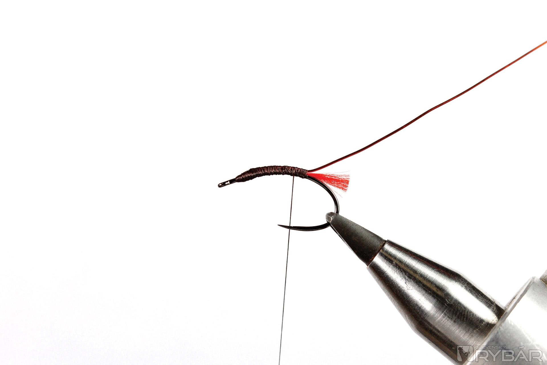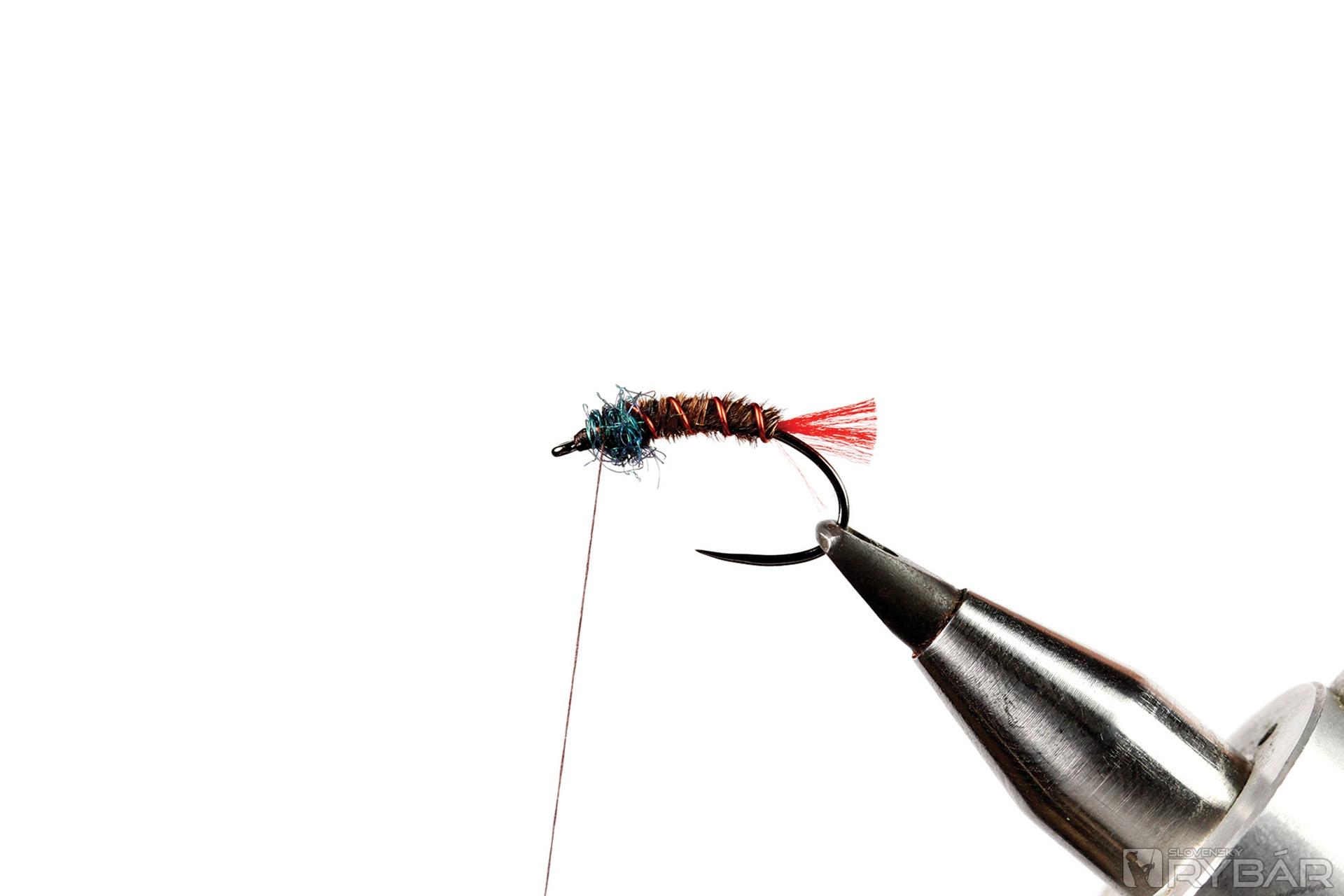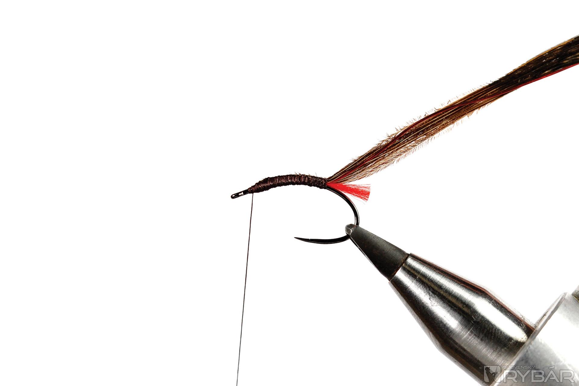 Tmavohnedá viazacia niť, nymfový háčik, červená niť, medený drôtik, výrez z pera bažanta, páví dabing, pierko z jarabice.