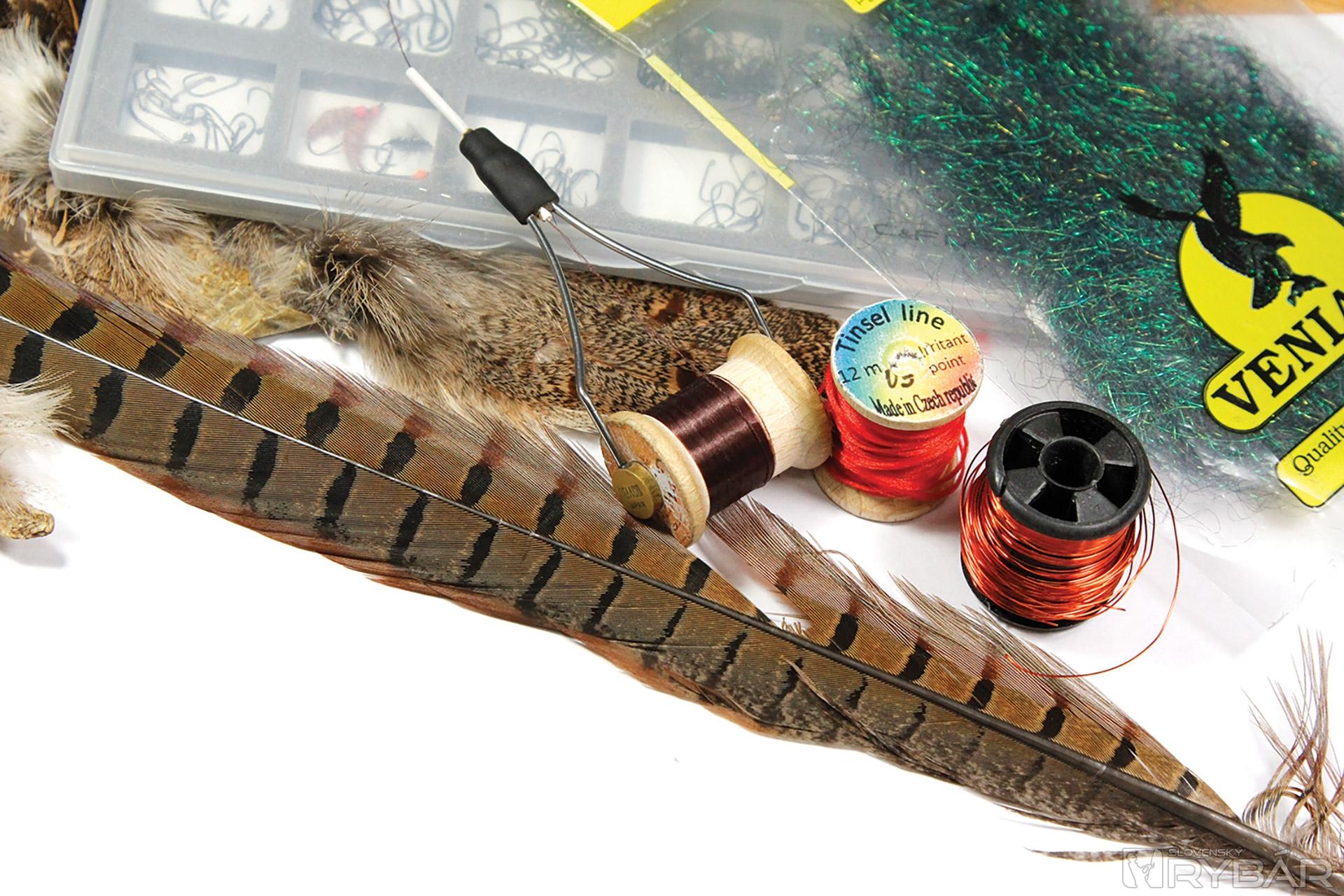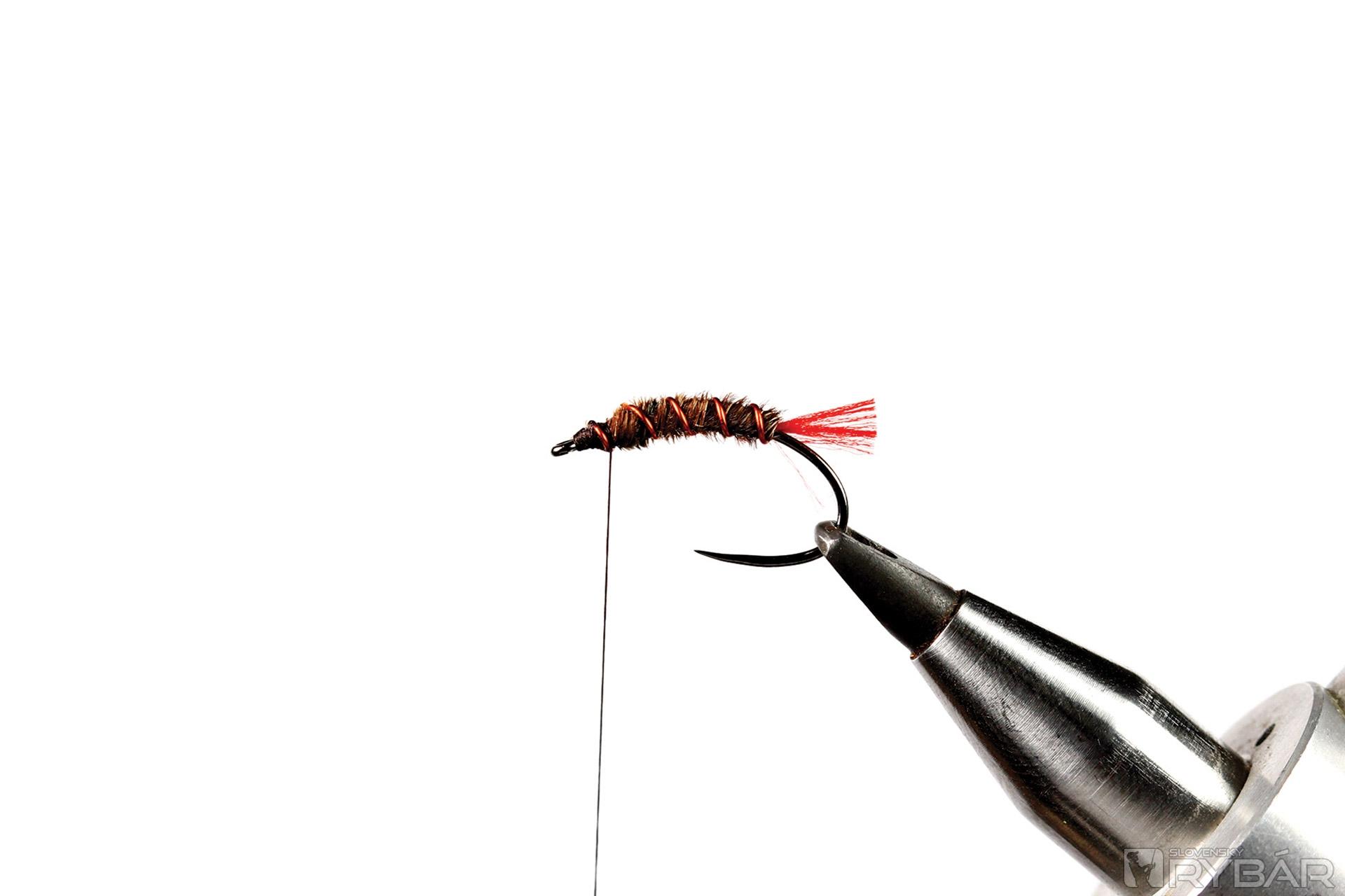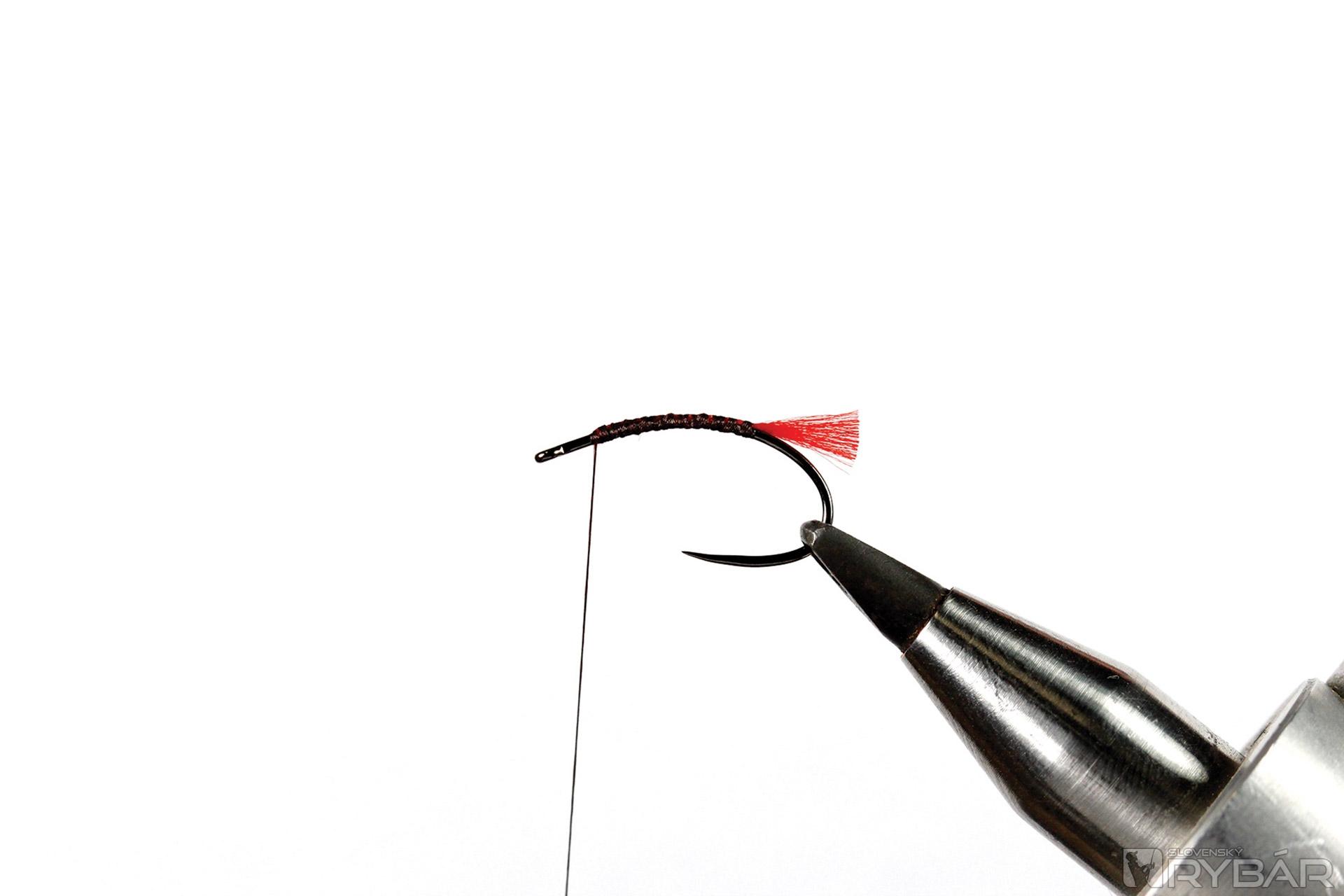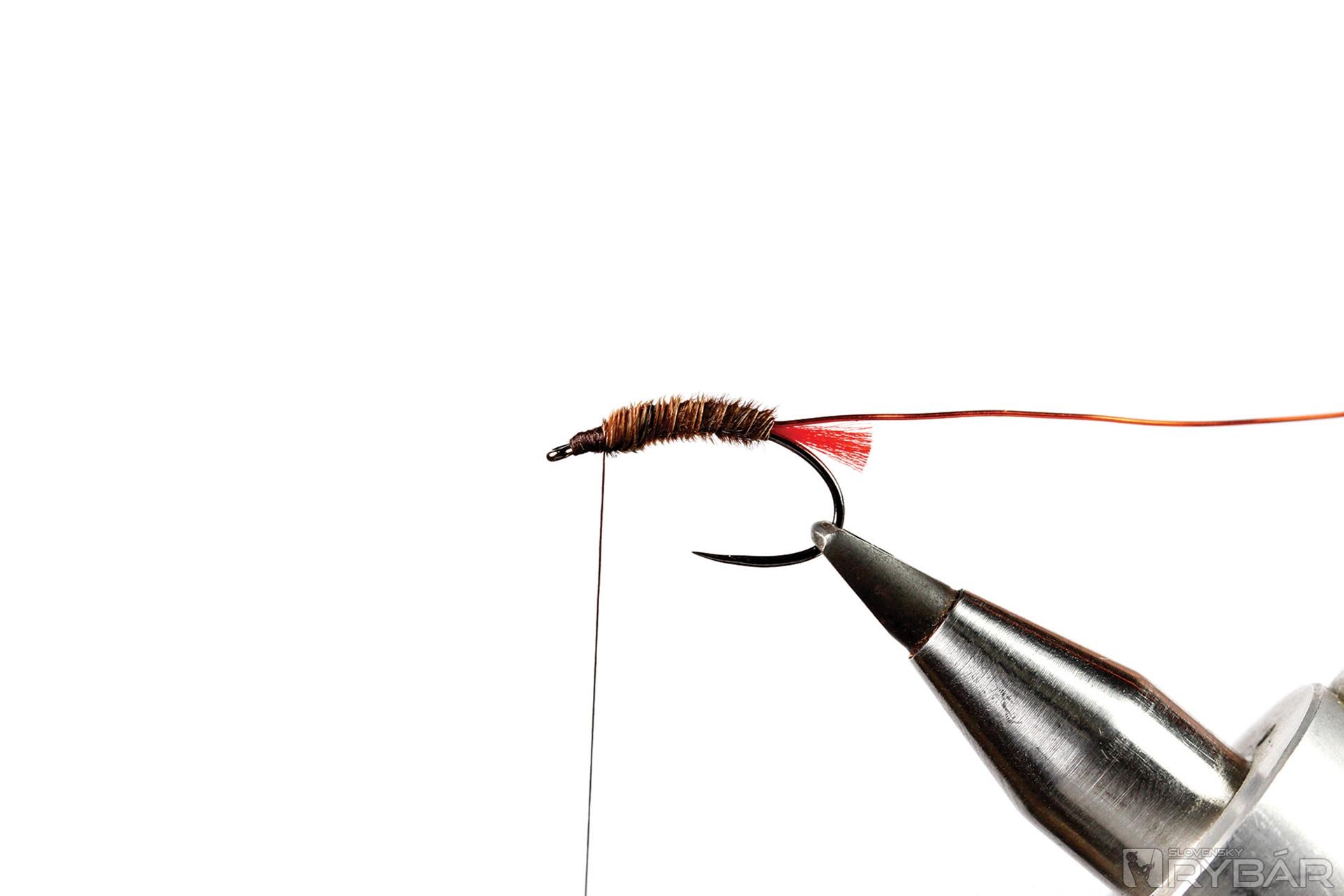 Tmavohnedá viazacia niť, nymfový háčik, červená niť, medený drôtik, výrez z pera bažanta, páví dabing, pierko z jarabice.