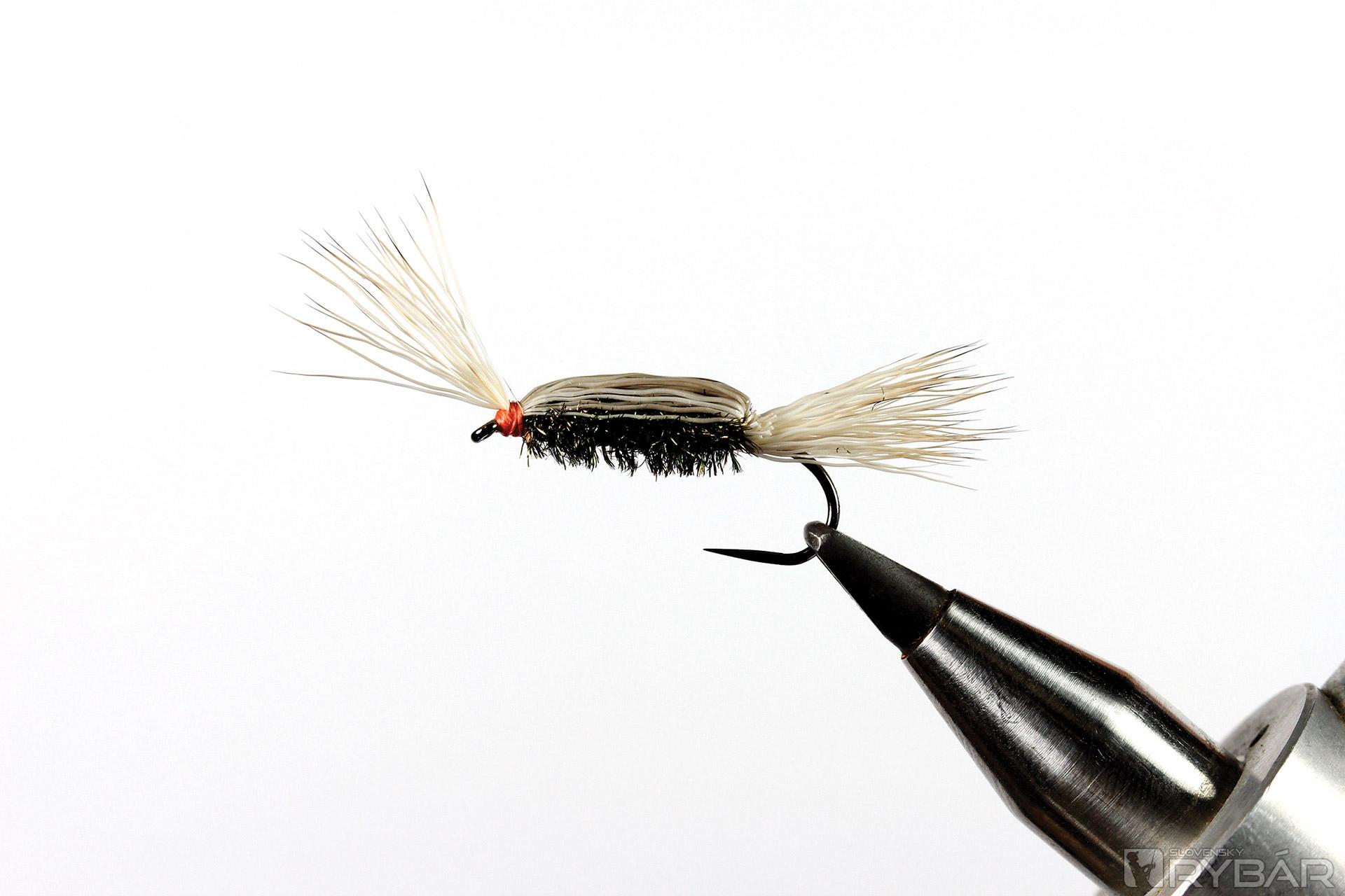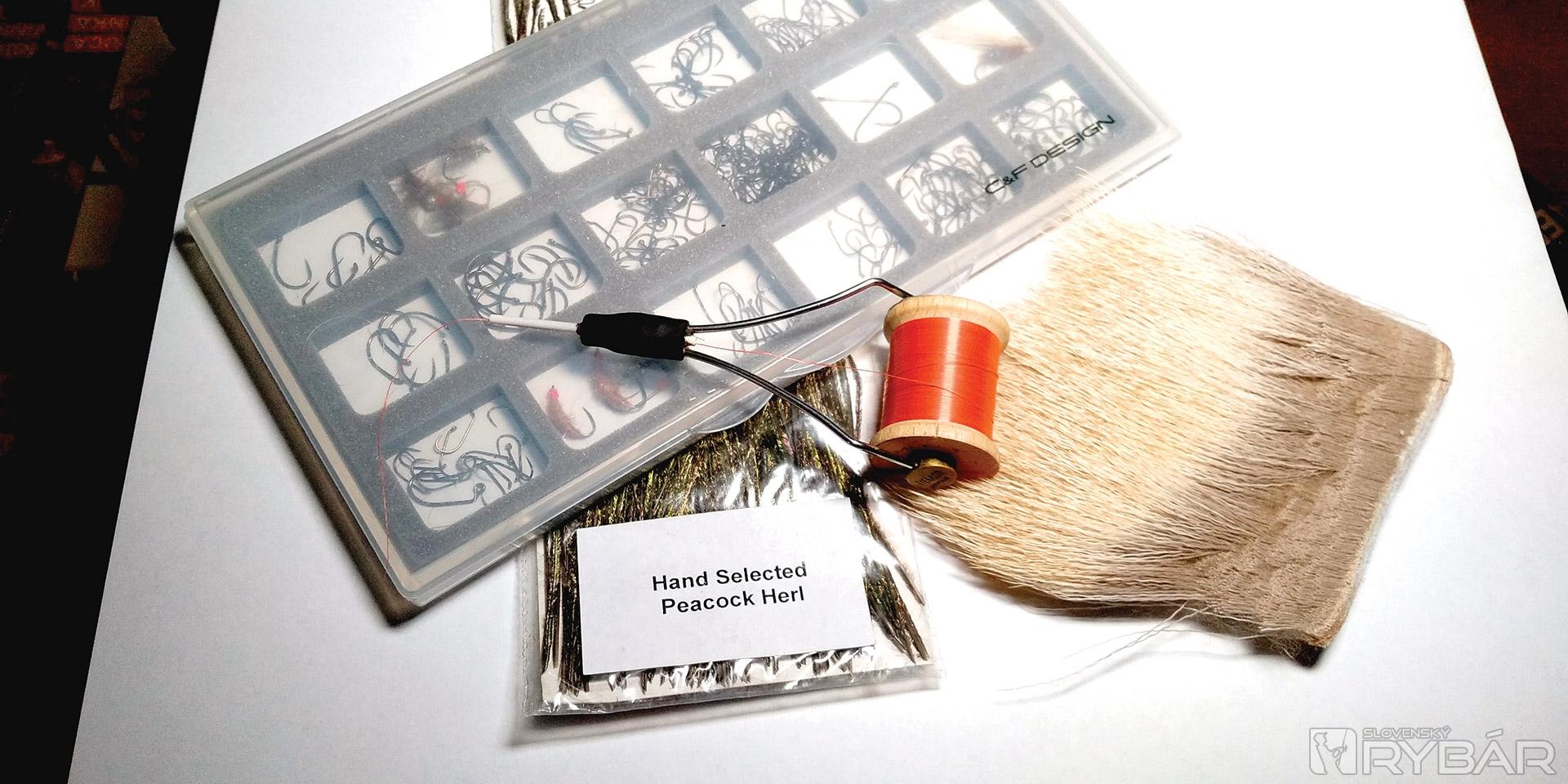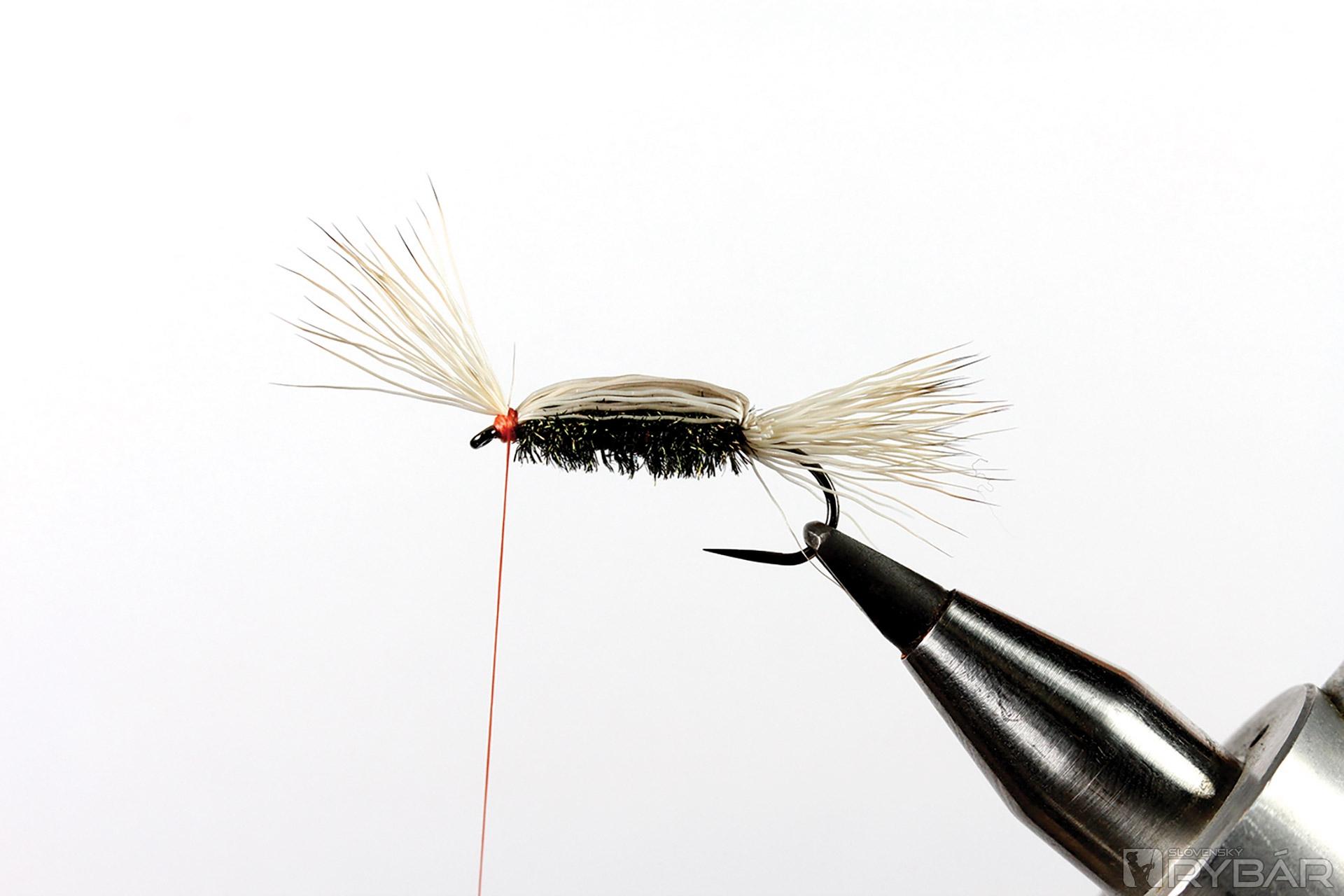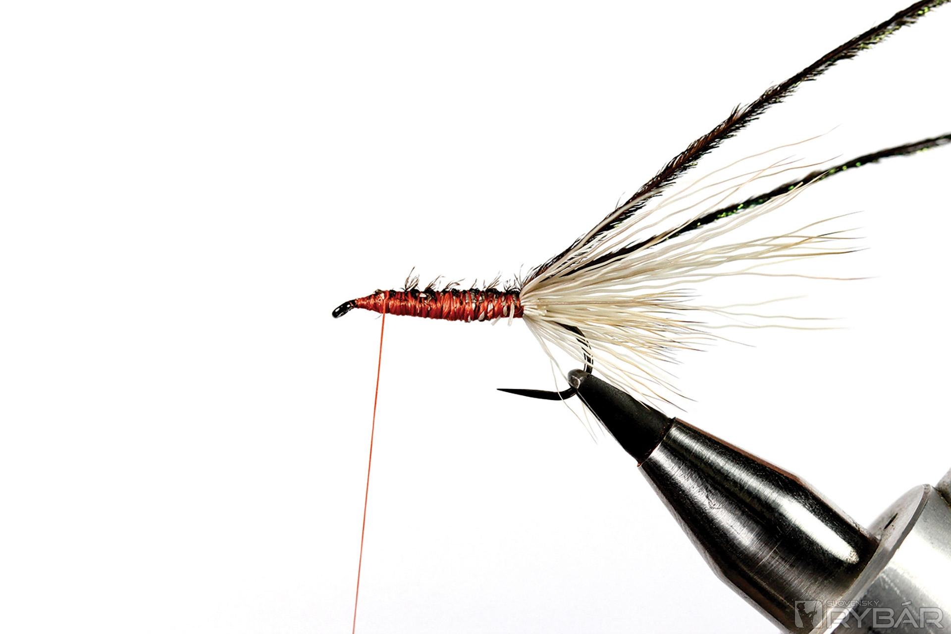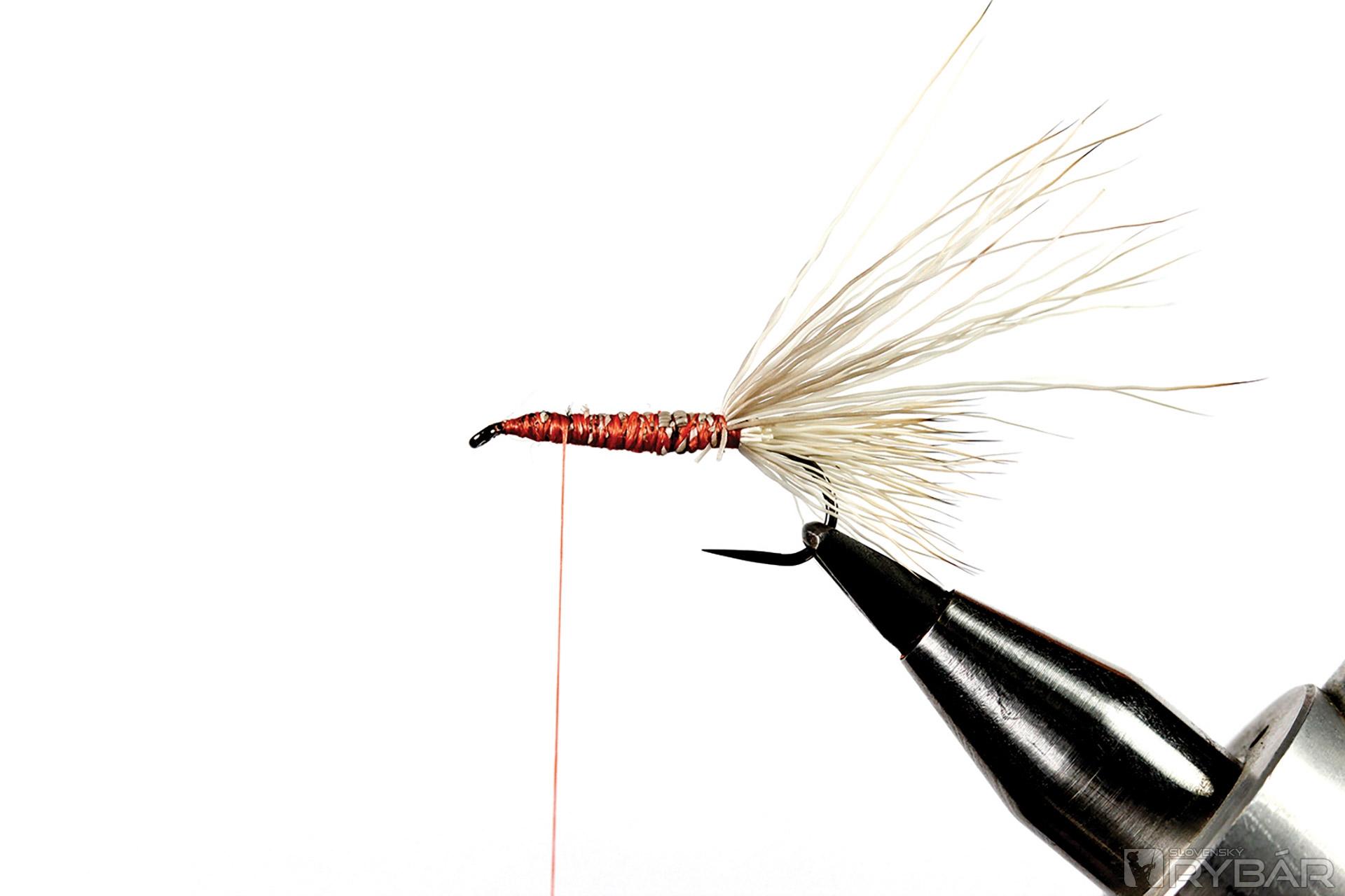 suchý háčik s dlhším ramienkom, zimná srsť z jeleňa, pierka z chvosta páva, hrdzavá viazacia niť.