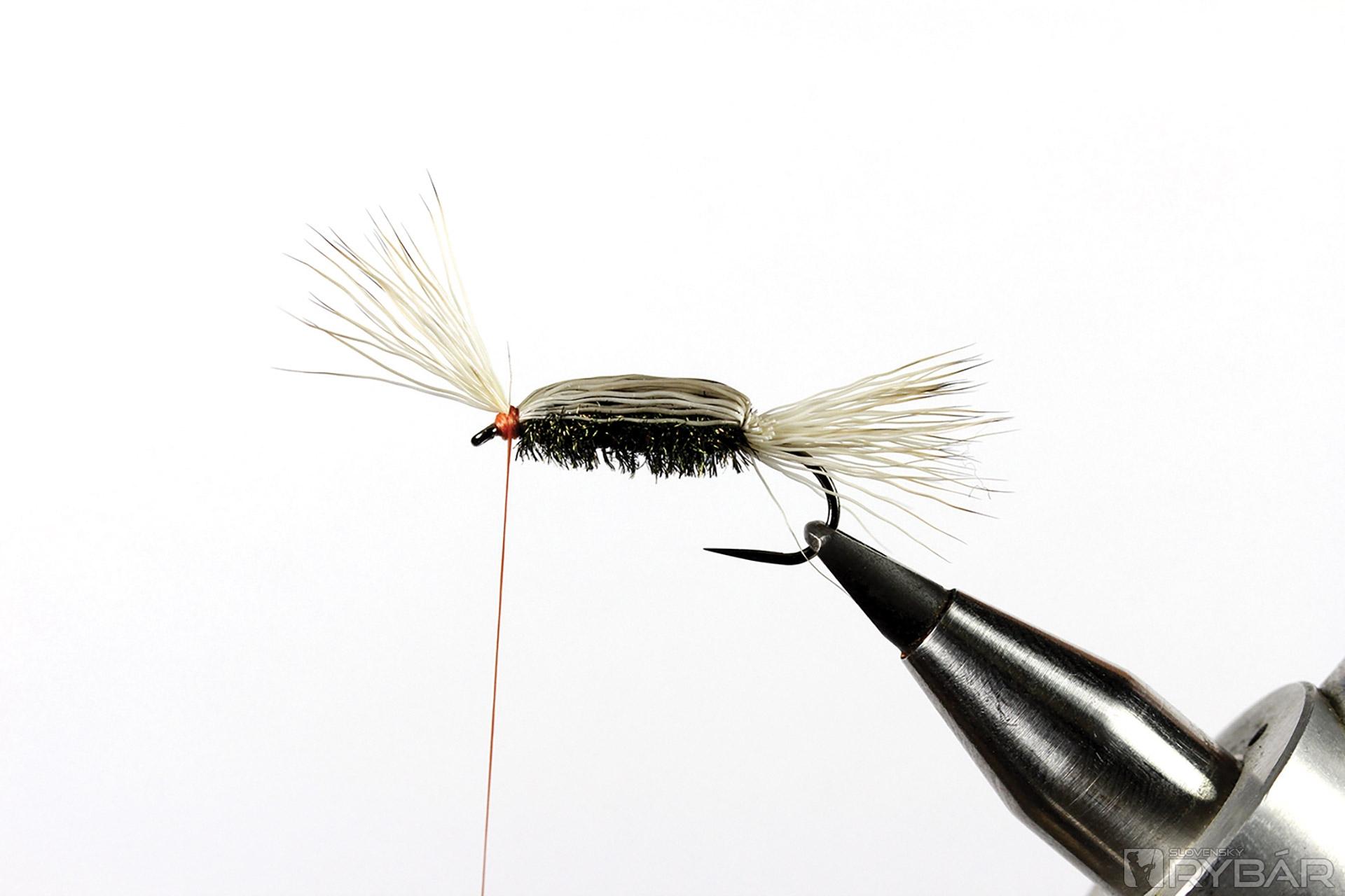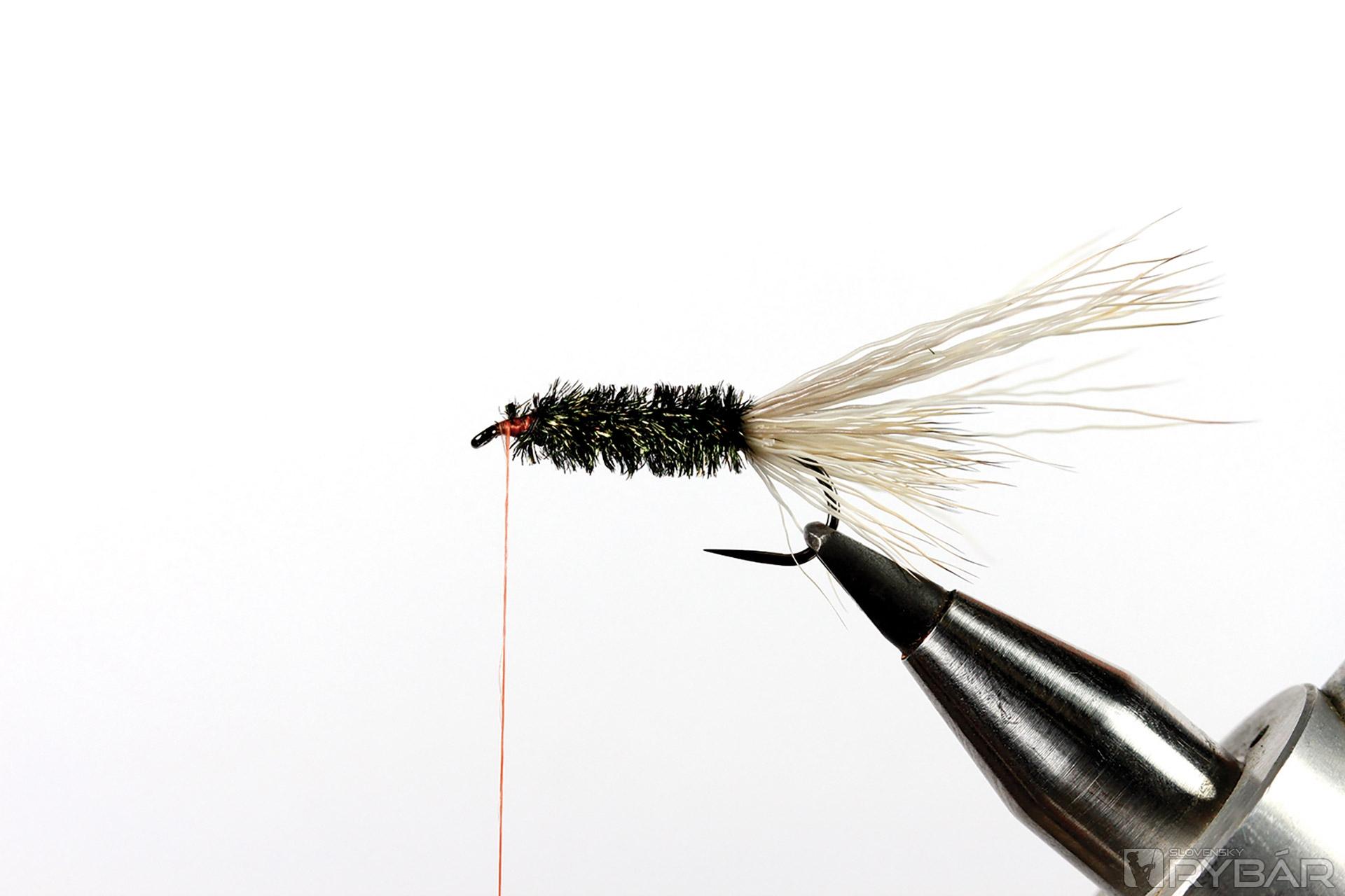 1. Háčik upneme do zveráčika a naviažeme si srsť z jeleňa. Kratšiu časť zospodu.