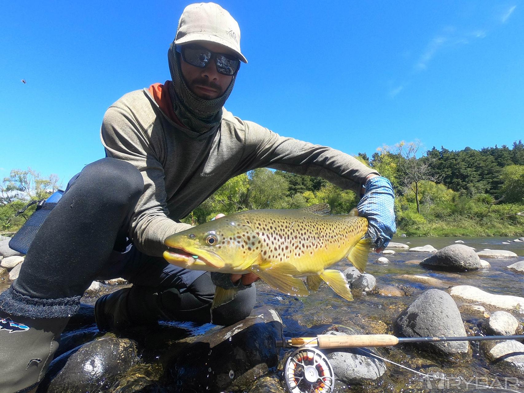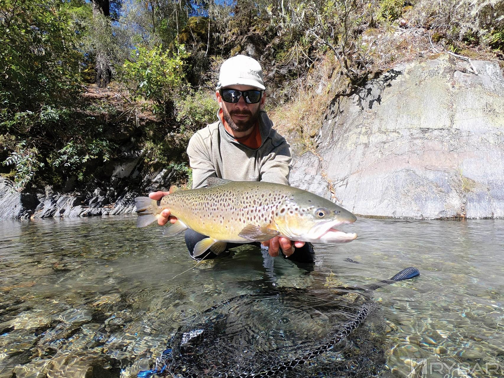 Tongariro sme si užili, a tak prechádzame inam. Na tejto rieke som ešte nechytal. Cikády sú počuť všade okolo, a preto začínam suchou muchou. Peter nymfou. Ako inak, že? Začiatok je skvelý a prvý dúhak slušne bojuje. Potom už to ide z kopca. V hlbokej tôni prichádza kolega o celý nadväzec. O kus nižšie vidím zo skaly veľkú rybu uprostred rieky. Nie je však šanca sa k nej dostať.