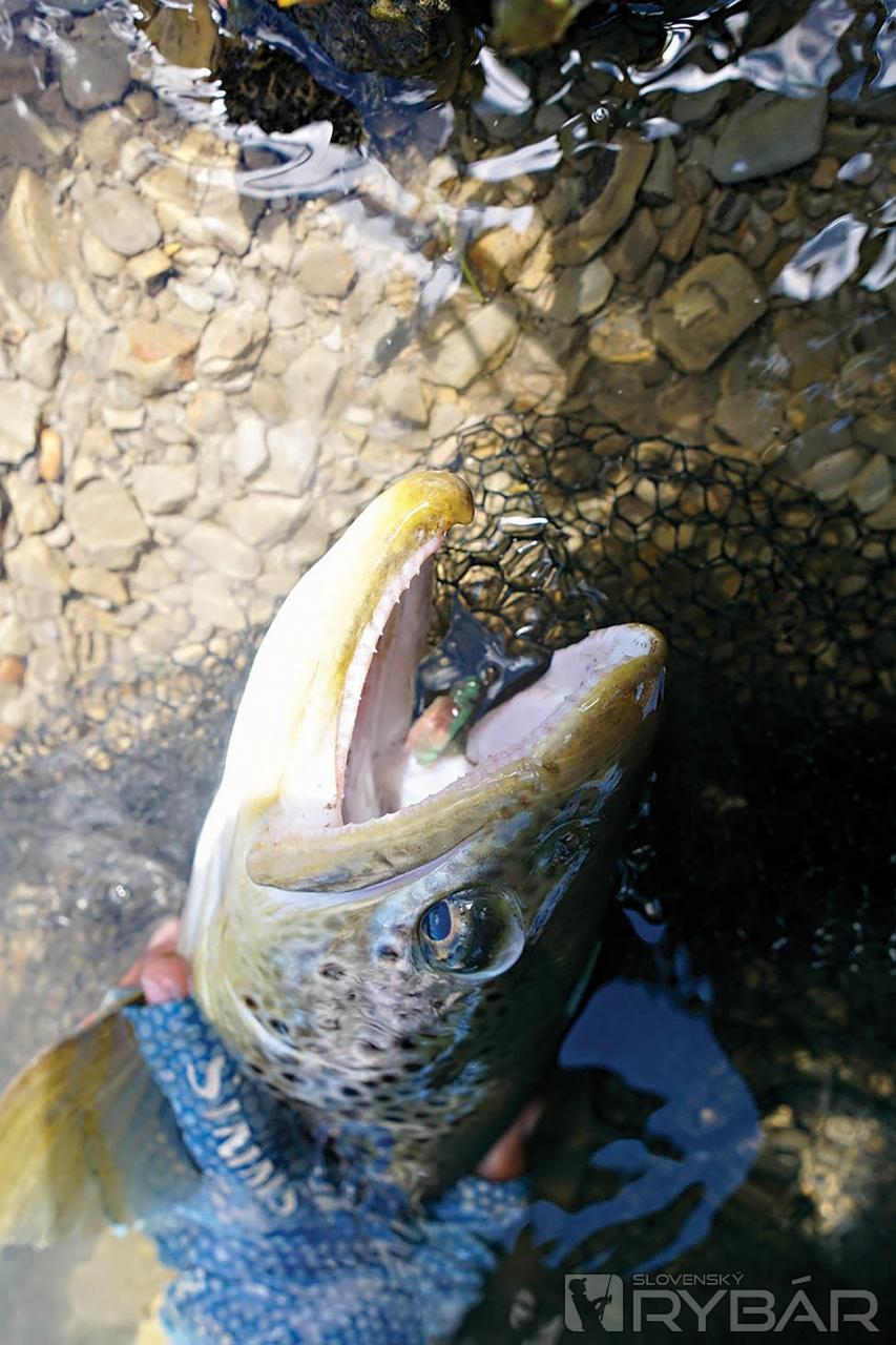 Čakám na kolegu a ten postupne na nymfu dostáva niekoľko rýb. Opäť mu nechávam prúdy a som na ďalšej pláni. Lokalizujem 4 slušné potočáky. Všetky sa mi darí presvedčiť, zdolávam dvoch z nich. Zvyšok padá chvíľu po záseku. Aj tak je to neskutočné divadlo sledovať v krištáľovo čistej vode záber. Na mieste, kde som včera končil, opäť stoja veľké ryby na zlome. Tentoraz ich je snáď desať. Moju pozornosť však púta potočák, ktorý pomaly krúži v slepom ramene. Skúšam mu ponúkať cikádu, potom prírodnú nymfičku v závese ale nič. Vždy hádžem keď ide odo mňa a len čo sa vracia, trochu mušku oživím. Nakoniec radikálne nasadzujem nie úplne prírodný vzor s oranžovým tipom a pávím telom. Berie na prvú dobrú.