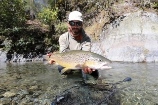 Ráno sa nikam neženieme. Tentoraz ideme obaja spoločne. Nechávam kolegu s nymfou ísť ako prvého. Ja z druhého brehu púšťam cikádu okolo skaly. Ryby reagujú z pomerne veľkej hĺbky a behom chvíle mám dvoch potočákov. V prúde na začiatku pláne je obrovský kameň, za ktorým sa voda točí a vytvára pás tichej vody. A v nej ryba! Suchú mušku ignoruje, a tak mu pod ňu pridávam malú nymfičku. Zaberie to pomerne dosť času než sa mi podarí valivým hodom dostať mušku na správne miesto. Berie okamžite! Ďalší krásny potočák. Ďalej je breh zarastený a konáre siahajú až do vody. Občas medzi nimi stojí slušný potočák. Nie je však šanca tam nahodiť. Prichádzam k Petrovi práve keď zdoláva pekného potočáka, a tak mu aspoň robím fotku na pamiatku.