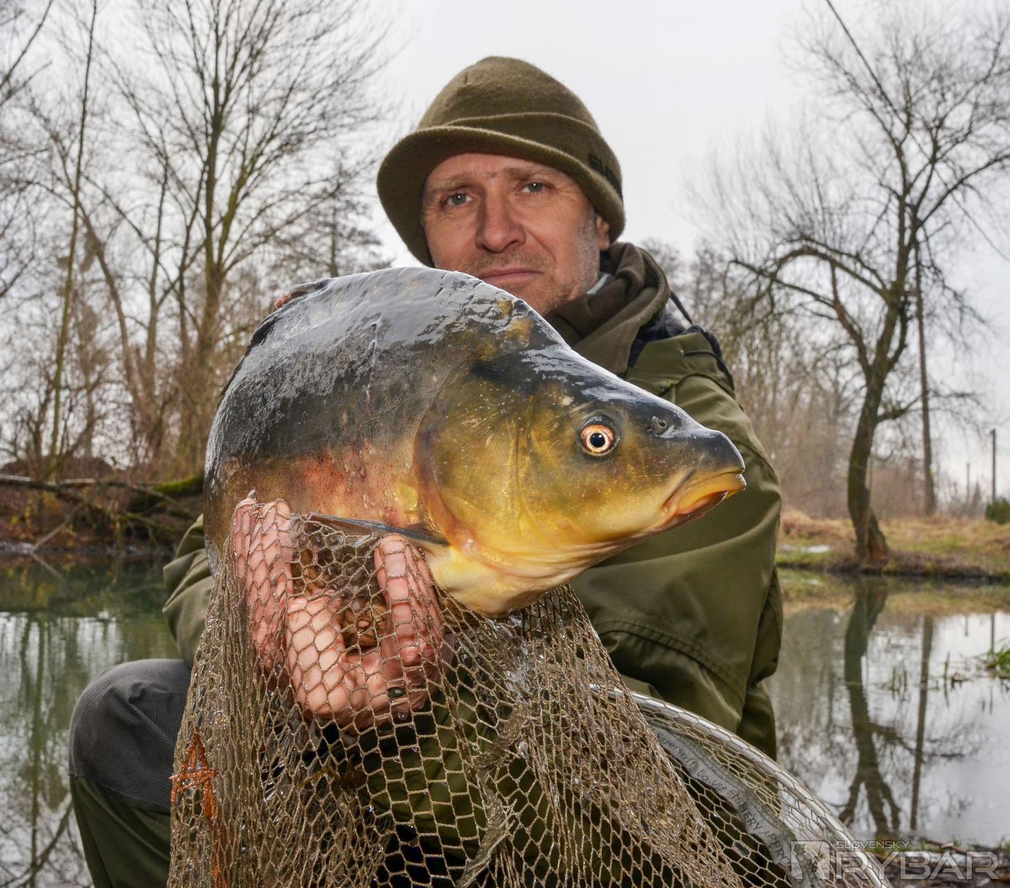 Nahodím a sledujem špičku. Po hodinke zisťujem, že moje plány vzhľadom na počasie boli možno trochu smelé. Zatiaľ ani ťuk. Vari, aby som to rovno zabalil. A ako sa tak nudím, sledujem skôr okolie ako prút, zrazu vidím, že prút poskočí vo vidličkách. Ryba ho ťahá rovno do vody. Je to veľmi rýchle, ale našťastie sa prútik zachytáva na vidličke za nôžku navijaka. Skokom som pri ňom a v premrznutých mokrých rukách cítim ťah ryby. Ryba tvrdo a dlho vzdoruje. Chvíľkami z toho mám divný pocit, ako keby som s rybou ťahal ešte niečo iné. Potom predsa podlieha ťahu prúta a nechá sa zdvihnúť k hladine. Zrazu je to jasné. Je to celkom pekný kapor, lenže podseknutý za prsnú plutvu. Záberu som sa teda naozaj nedočkal, ale zdá sa, že voľba miesta bola naozaj správna. Skrehnutými rukami nastavujem clonu fotoaparátu a robím niekoľko fotiek. Potom kapra púšťam a nahadzujem znova. Táto ryba dokazuje, že ryby tu sú, pohybujú sa, a tak je hádam šanca aj na záber.
