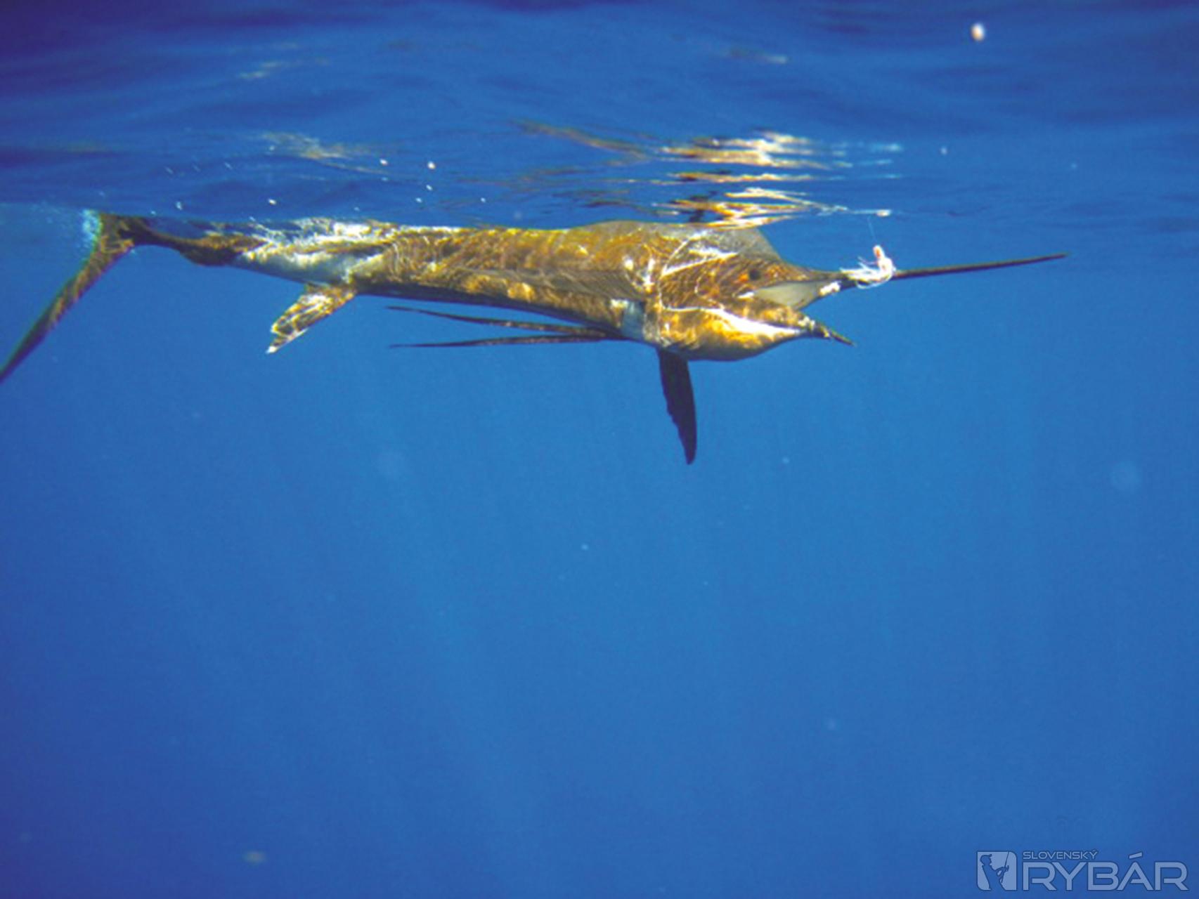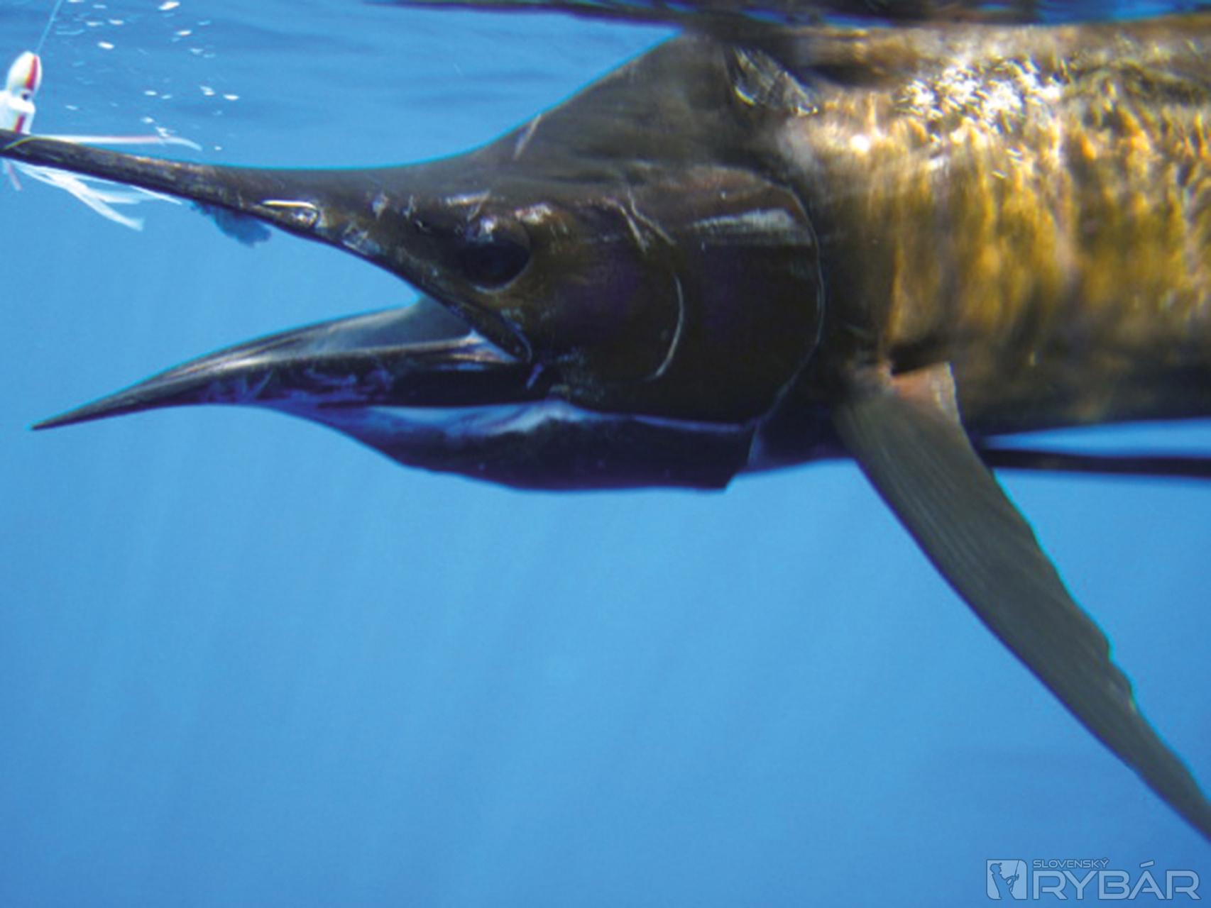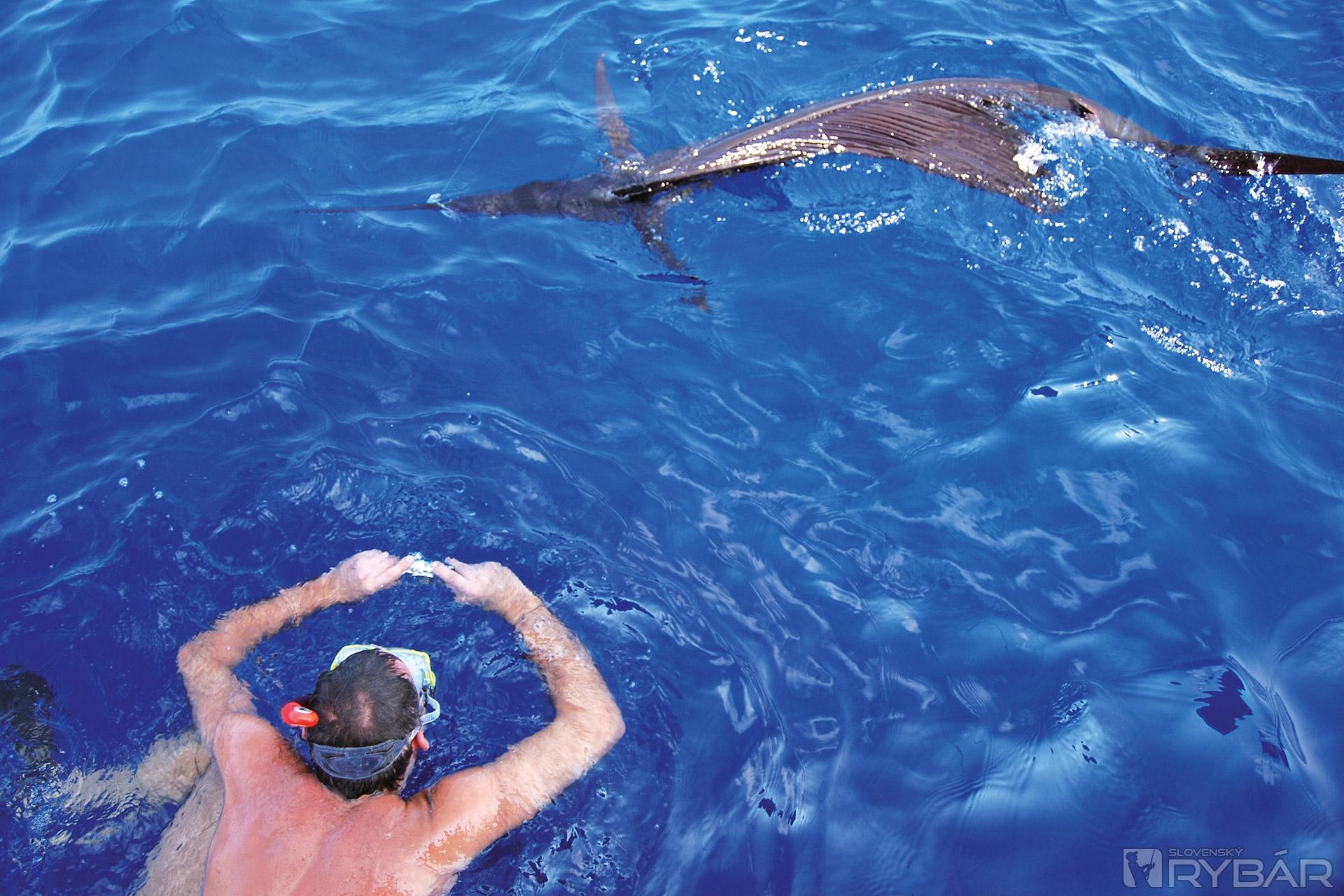 Ryba po dopade ostáva nepohnute ležať na boku s vejárovito roztiahnutou chrbtovou plutvou. Jasne vidím omotaný chemlonový príčesok na konci jej špicatého meča. Dvaja členovia posádky si kľakli do medzery v zábradlí na okraji paluby. Snažia sa šnúrou pritiahnuť unaveného plachetníka k sebe, aby ho mohli chytiť za jeho nos. Všetci sa natlačia za chrbty našich pomocníkov a ja vidím v hľadáčiku kamery iba mätež tiel.