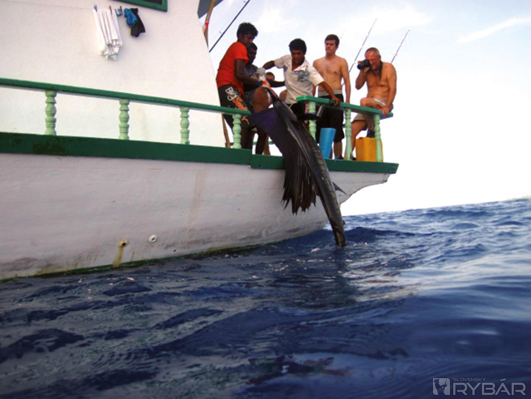 „Sailfish, sailfish“ – kričí náš kučeravý kuchár a ukazuje prstom do diaľky. Skutočne, asi päťsto metrov pred nami vyskakujú nad vodou obrovské ryby. Sú to plachetníky. Skáčeme na rovné nohy a staviame sa pred udice. Vyzeráme ako šprintéri na štarte. Telo prikrčené a napnuté ruky pripravené vyraziť po prúte.