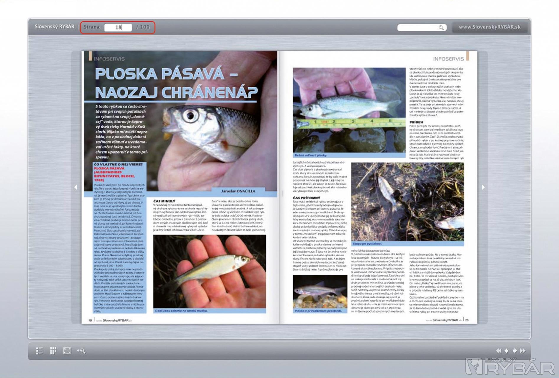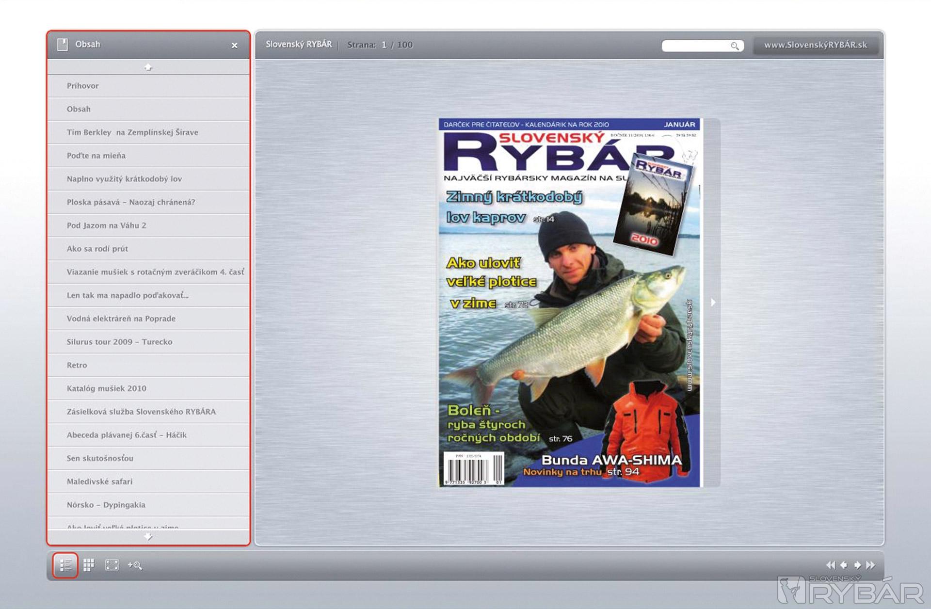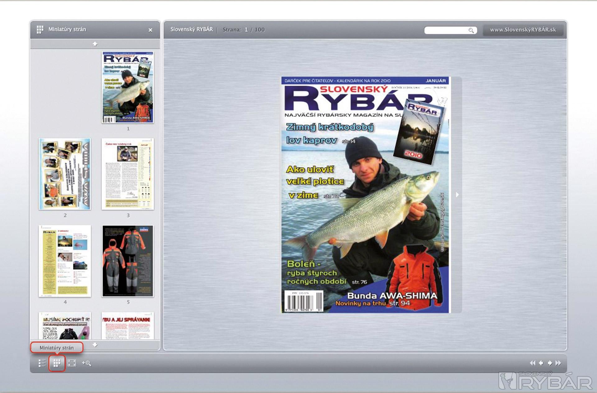 Ovládacie menu v ľavej časti obrazovky je možné vypnúť kliknutím na krížik. Zobrazí sa vám iba stránka prehliadania časopisu. Opätovné zobrazenie ovládacích prvkov v ľavej časti obrazovky je možné vyvolať kliknutím na tlačidlá Obsah, Miniatúry strán. Menu je v slovenčine.
