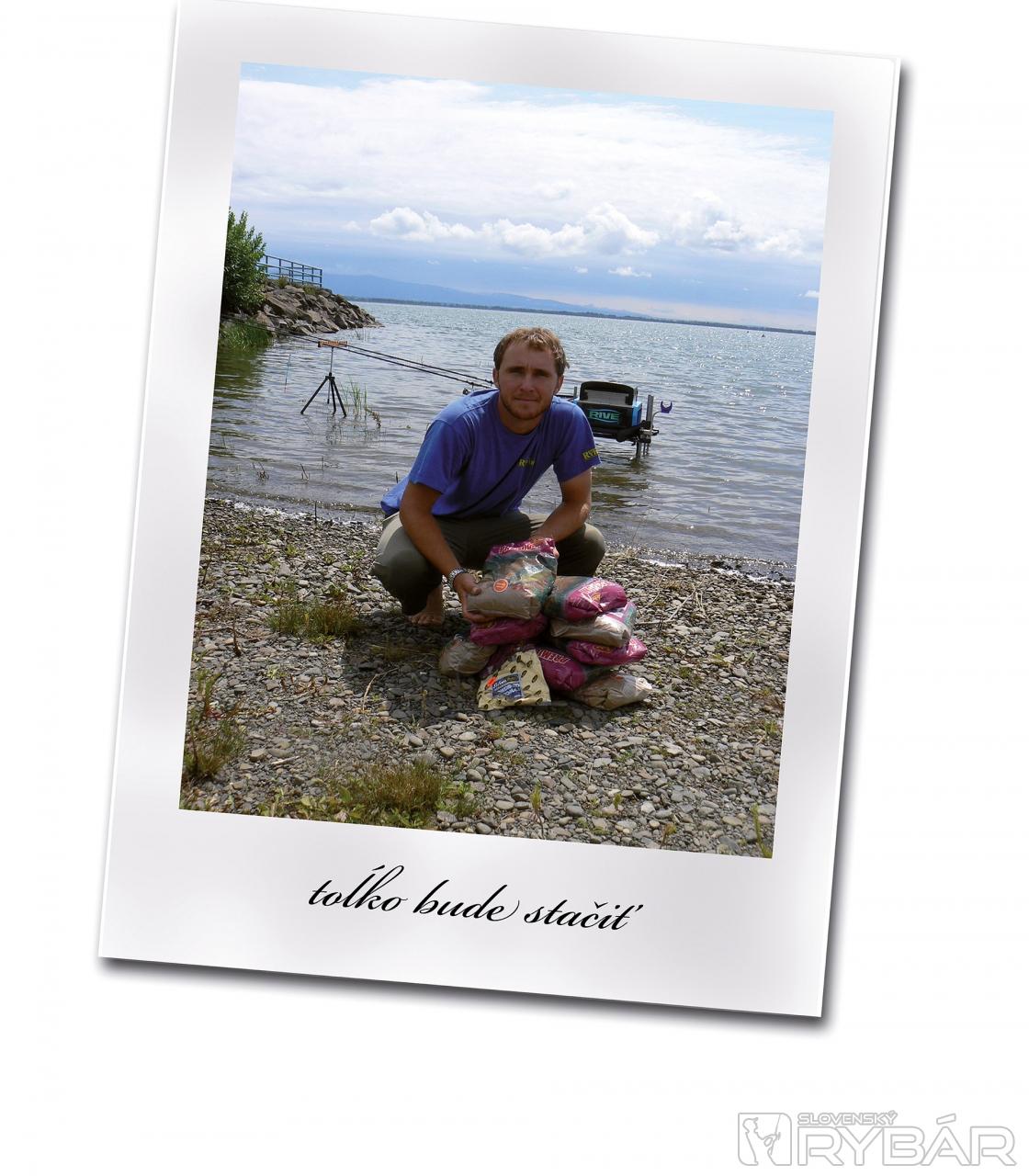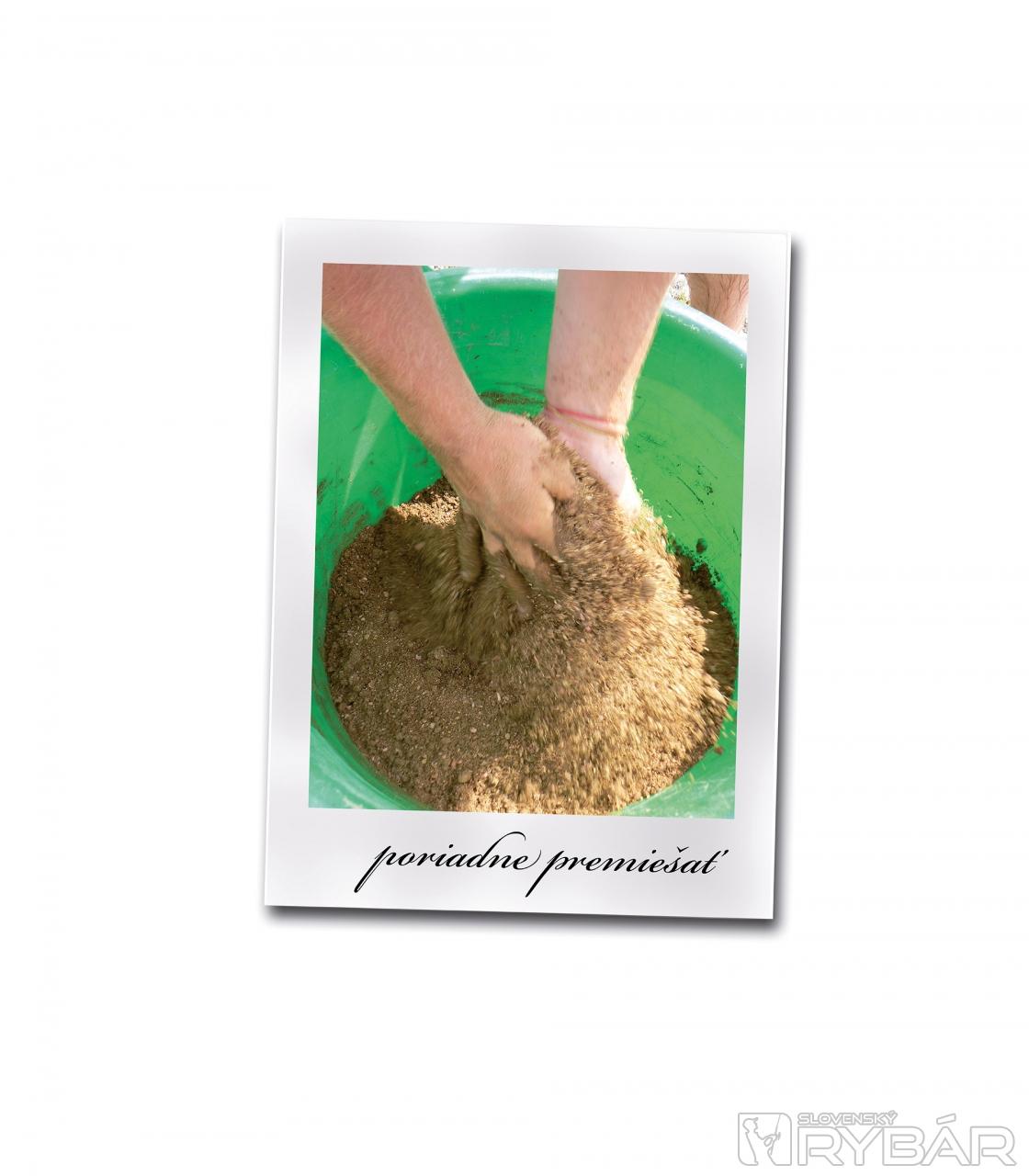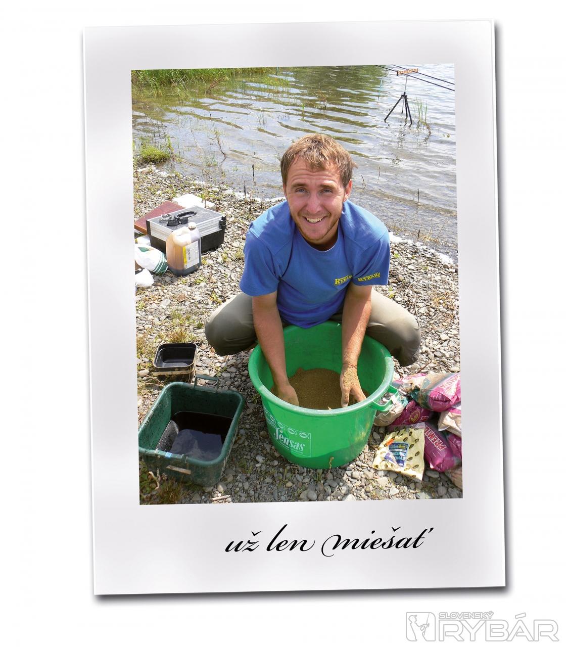 Otec si chystá jednu 2,5 kg Capuccinu. Nedáva do nej hlinu, ale skôr ju pripravuje mierne suchšiu. Do oboch zmesí primiešavame ešte vločku - asi po štvrť vrecka, aby mali ryby čo vyberať. Taktiež nesmie chýbať kukurica. Tú však pridám len do úvodného kŕmenia, aby som nepresycoval ryby. Živú nástrahu predstavujú hnojové červy - asi zo 5 kg na dva dni a 2 litre kostných červov. Viem, môže sa vám to zdať veľa, ale nie je. Pri desaťhodinovom maratóne sa toto číslo pokojne môže zdvojnásobiť, plus ešte zo 3 kg patentky. Ryba totiž jednoznačne preferuje živú nástrahu.