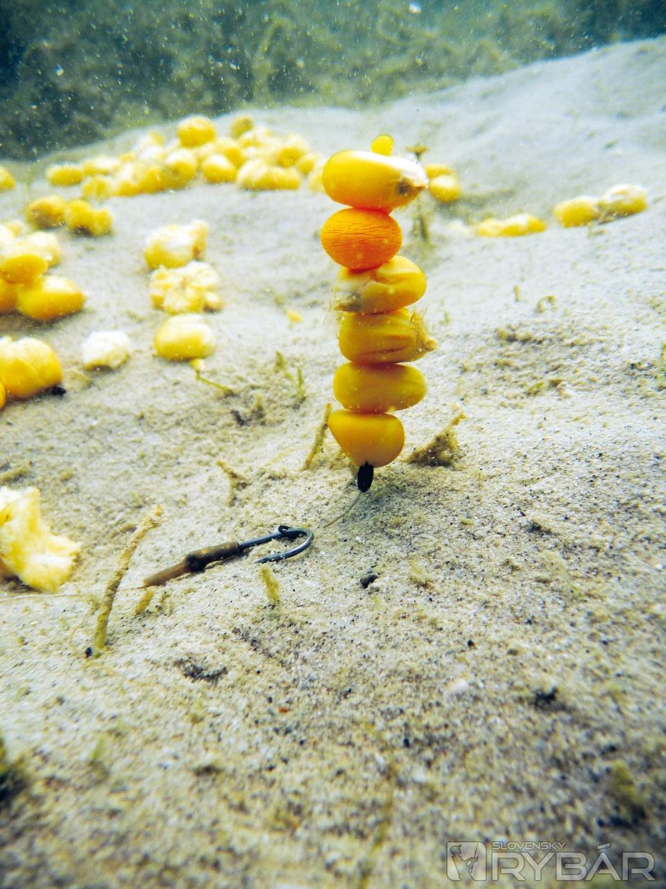 Moja prezentácia nástrahy pozostáva zväčša z 2-3 zrniek klasickej uvarenej kukurice plus 1 zrnko kupovanej medovej kukurice. Všetko nadľahčím jednou až dvoma polystyrénovými guľôčkami a zakončím buď klasickou, alebo mega kukuricou. Takáto „retiazka“ kukurice je pre amura hodne lákavá a zároveň dostatočne veľká na to, aby sme sa aspoň čiastočne dokázali ubrániť záberu od nežiaducich bielych rýb.