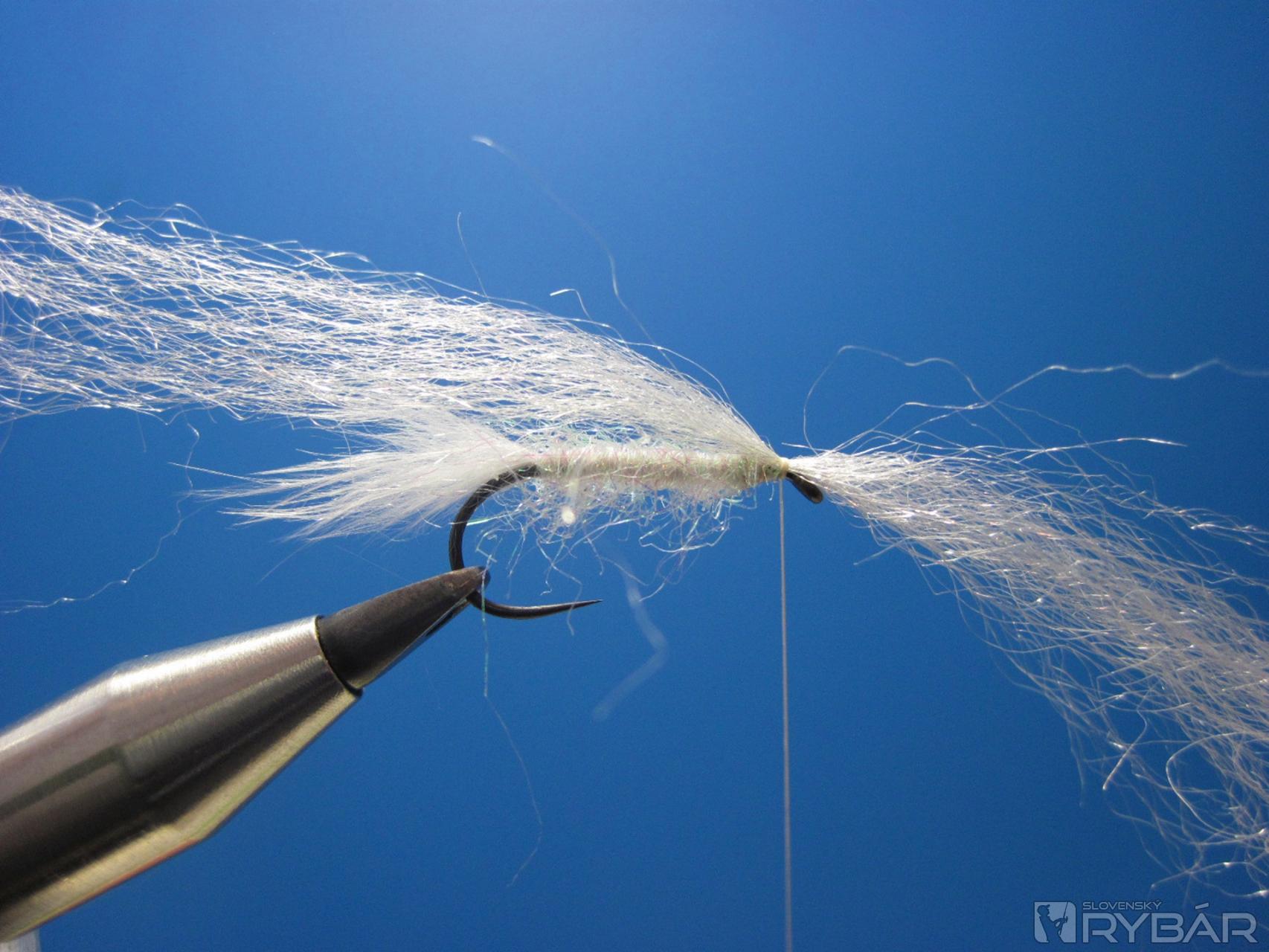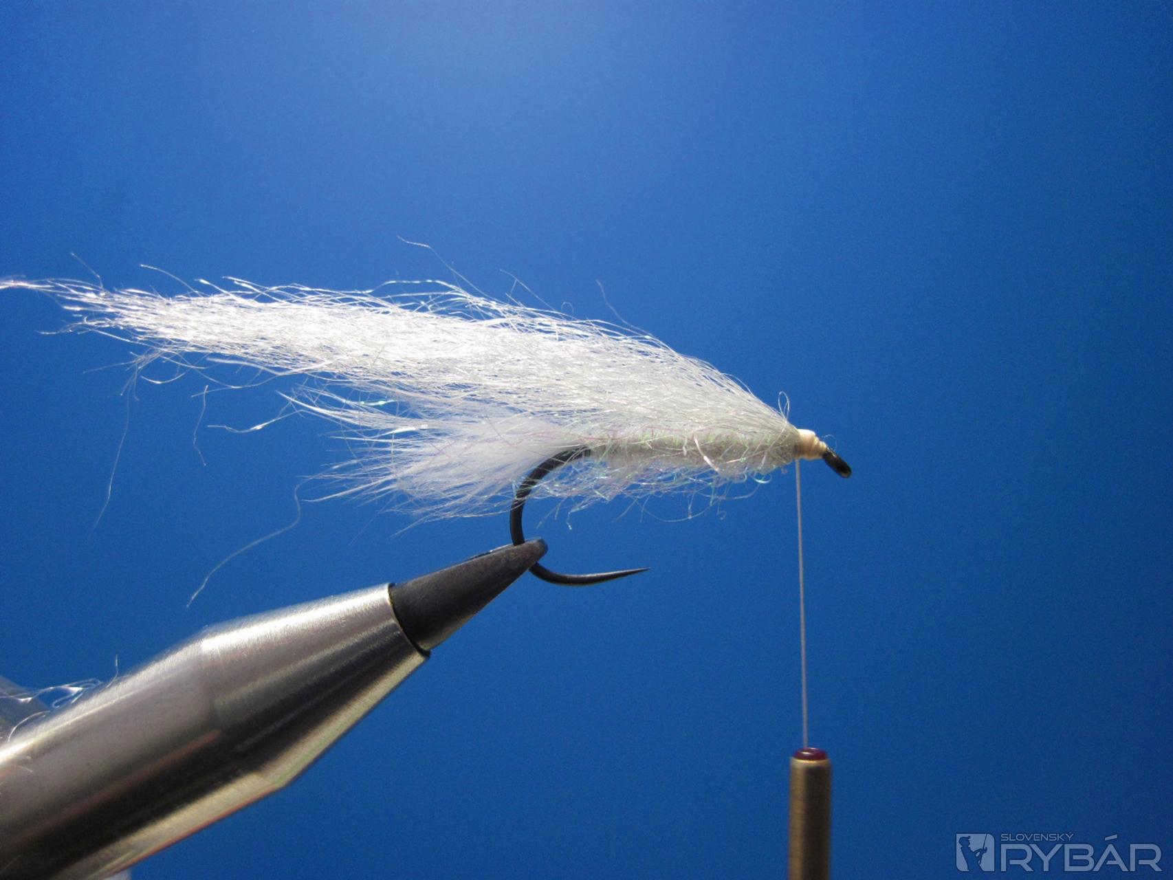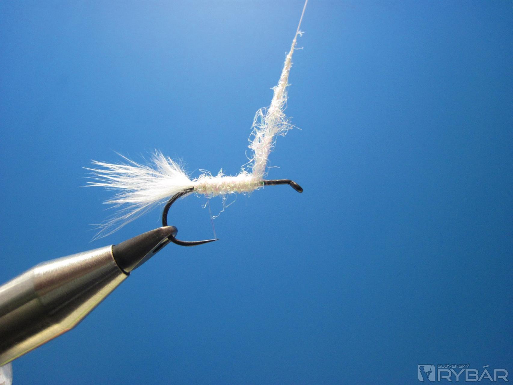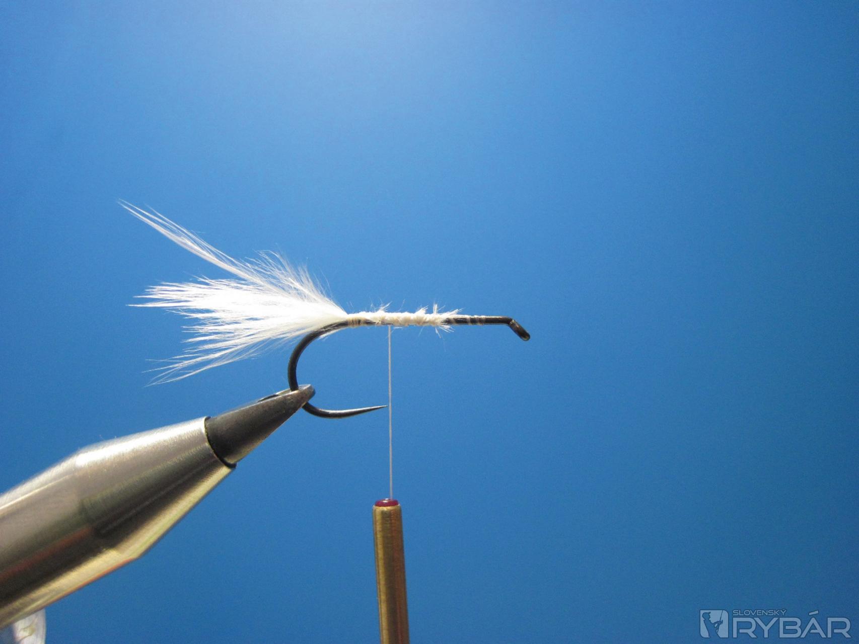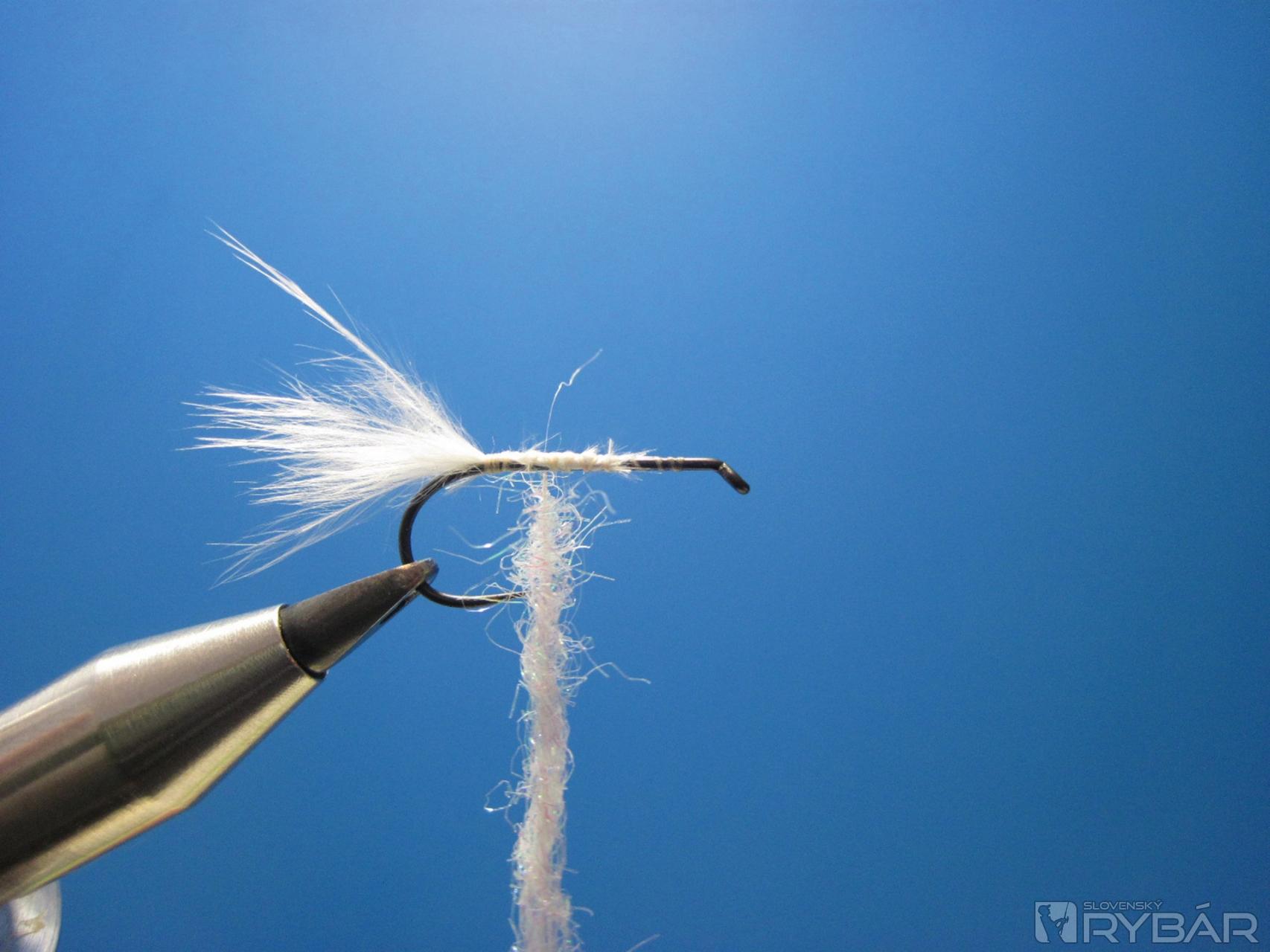 „Krídla“ mušky sú naviazané z bieleho káčera, ale môžeme použiť aj biele SLF alebo marabou perie, poprípade bielu srsť lamy, či iné materiály, s ktorými sa vám dobre pracuje. Rybička by mala byť po namočení tenká a úzka.