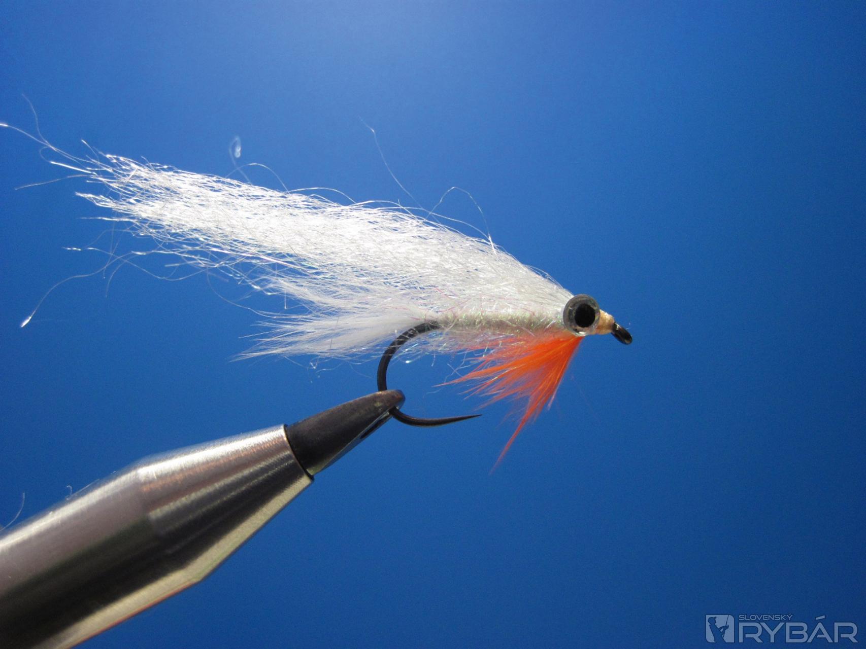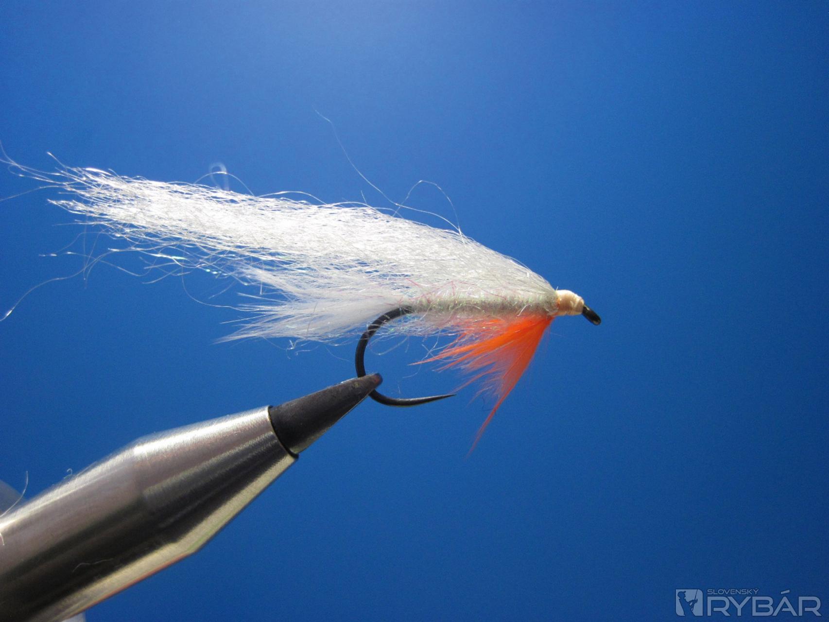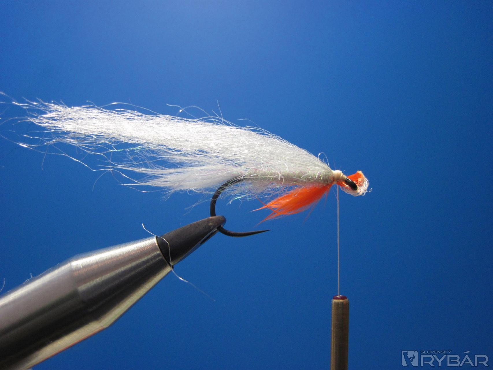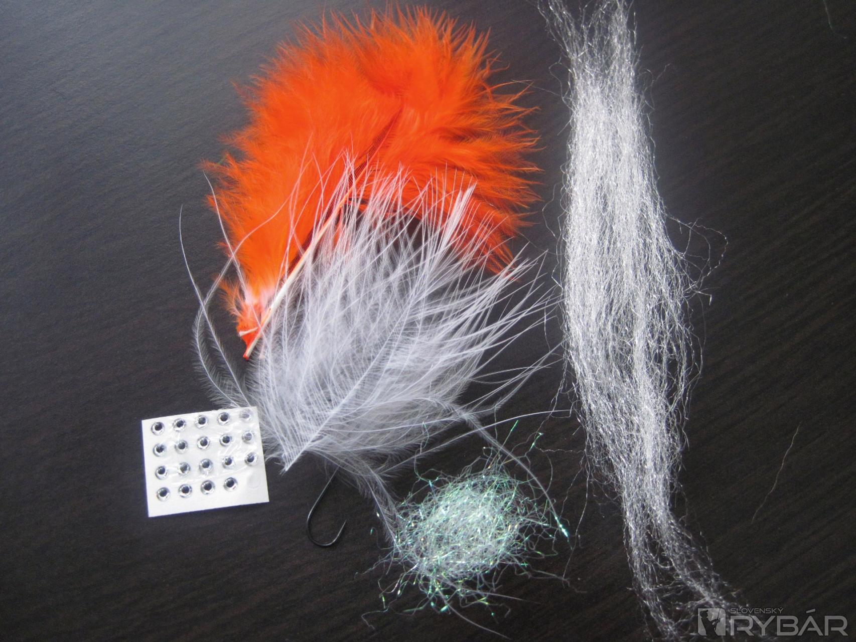 Viazacie materiály: háčik č. 8, biele SLF, biele perie marabou, perleťový dabing, oranžové perie marabou.