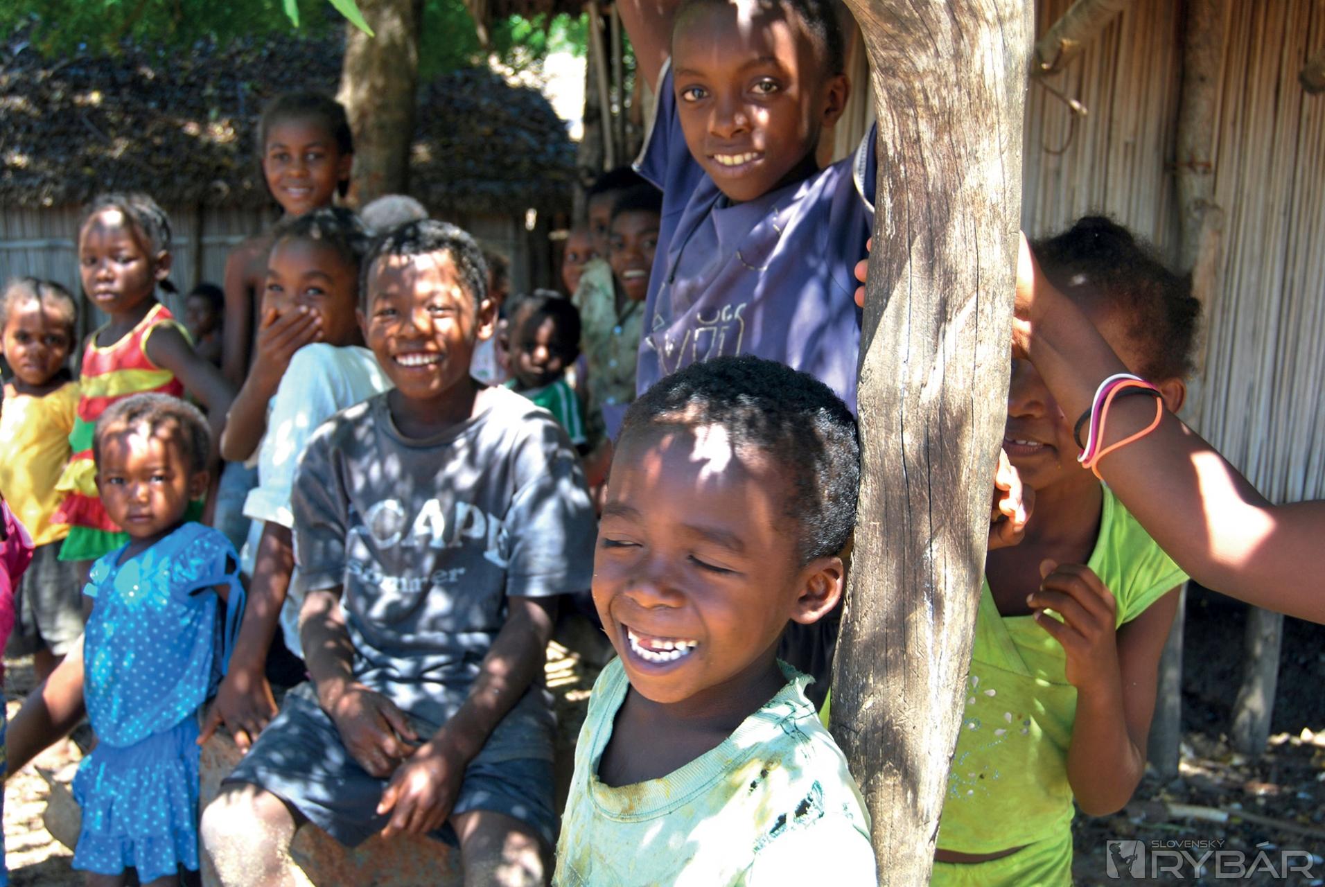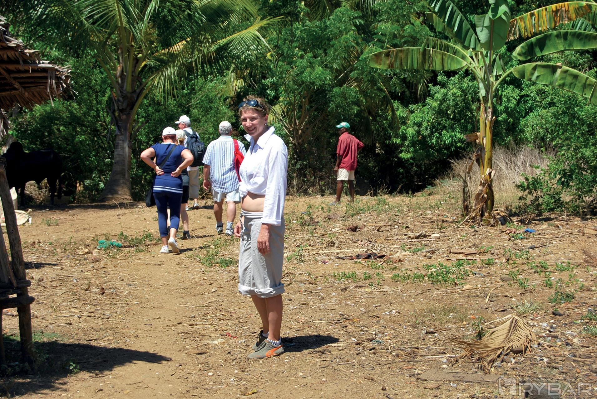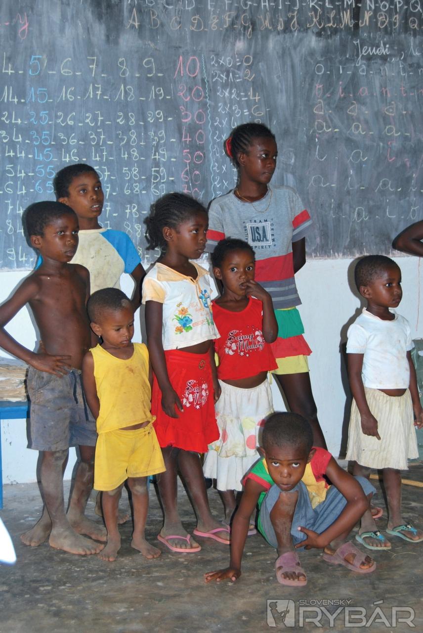 Prechádzame okrajom mangrového porastu, kde sa musíme vyzuť aby sme mohli pokračovať po plytkom zálive, ktorý je priechodný iba pri odlive. Čľapkajúc bosými nohami ženieme pred sebou kraby a v diaľke na pobreží sú vidieť prvé domorodé príbytky. Z chatrčí ukrytých pod stromami vychádzajú deti. Smejú sa a čakajú nás ukryté v tieni. Tu sme hostia, preto veľmi opatrne vyťahujem foťák a s úsmevom naznačujem čo chcem robiť. Pravdepodobne mám viac odvahy ako slušnosti, a tak fotím a fotím. Nikto sa neodvracia a dokonca mi niektorí malí nezbedníci aj pózujú. Cez maličkú dedinku prechádzame veľmi rýchlo a pokračujeme do hôr. Po hodine cesty sa nám ukázala jedinú murovaná budova v širokom okolí. Je to miestna škola postavená za peniaze organizácie Unicef. Triedy sú prázdne, tabuľa popísaná násobilkou a pred dverami stojí neoholený a ufúľaný riaditeľ Fransoá, ktorý nás víta až veľmi prehnanou radosťou. Stále dookola melie tú istú vetu a podľa jeho nie celkom koordinovaných pohybov neskôr konštatujeme, že okrem pedagóga je určite aj hlavným technológom - ochutnávačom výrobne liehu, ktorú sme našli ukrytú v pralese.