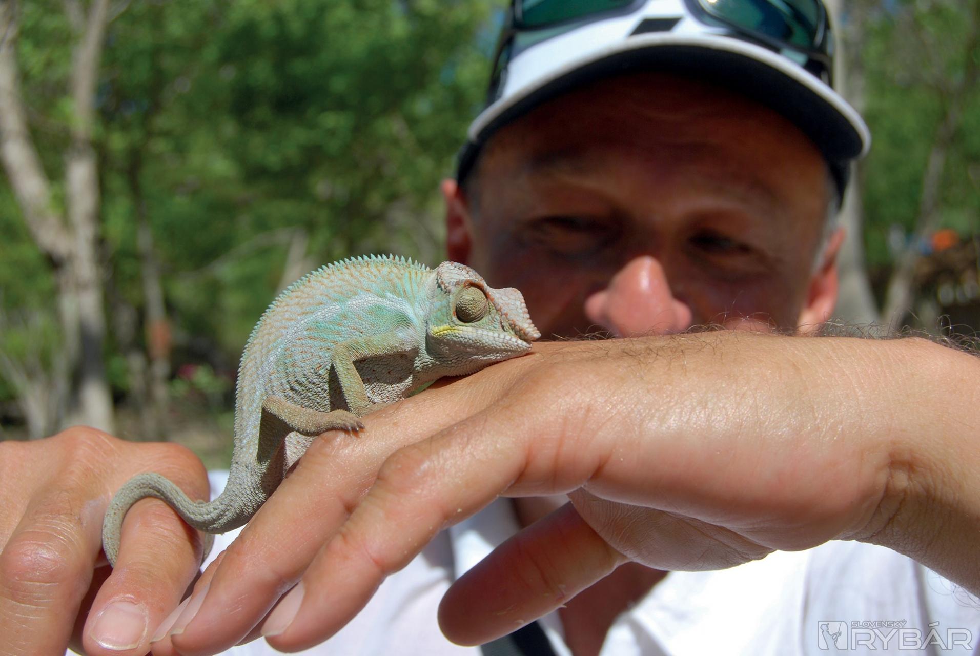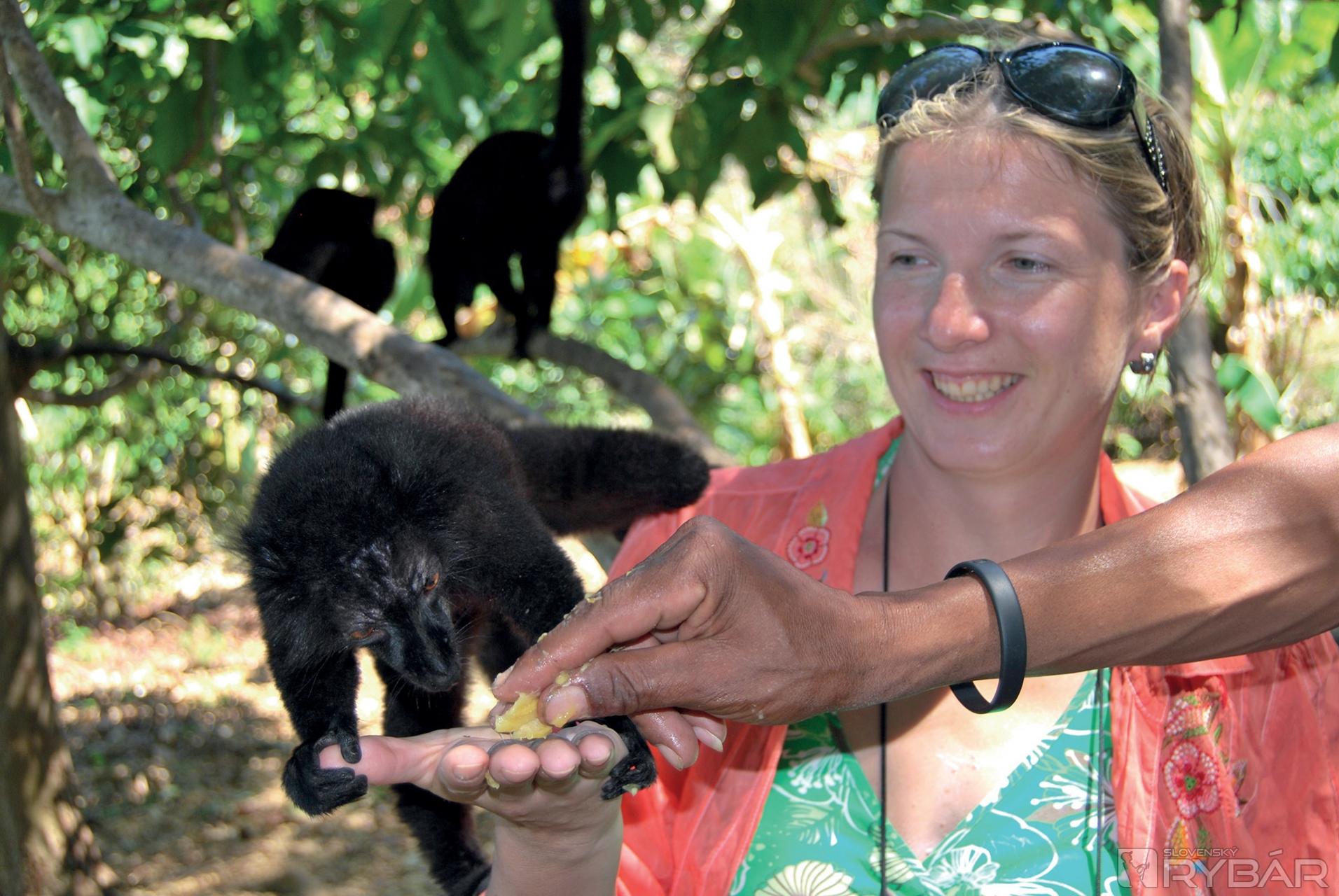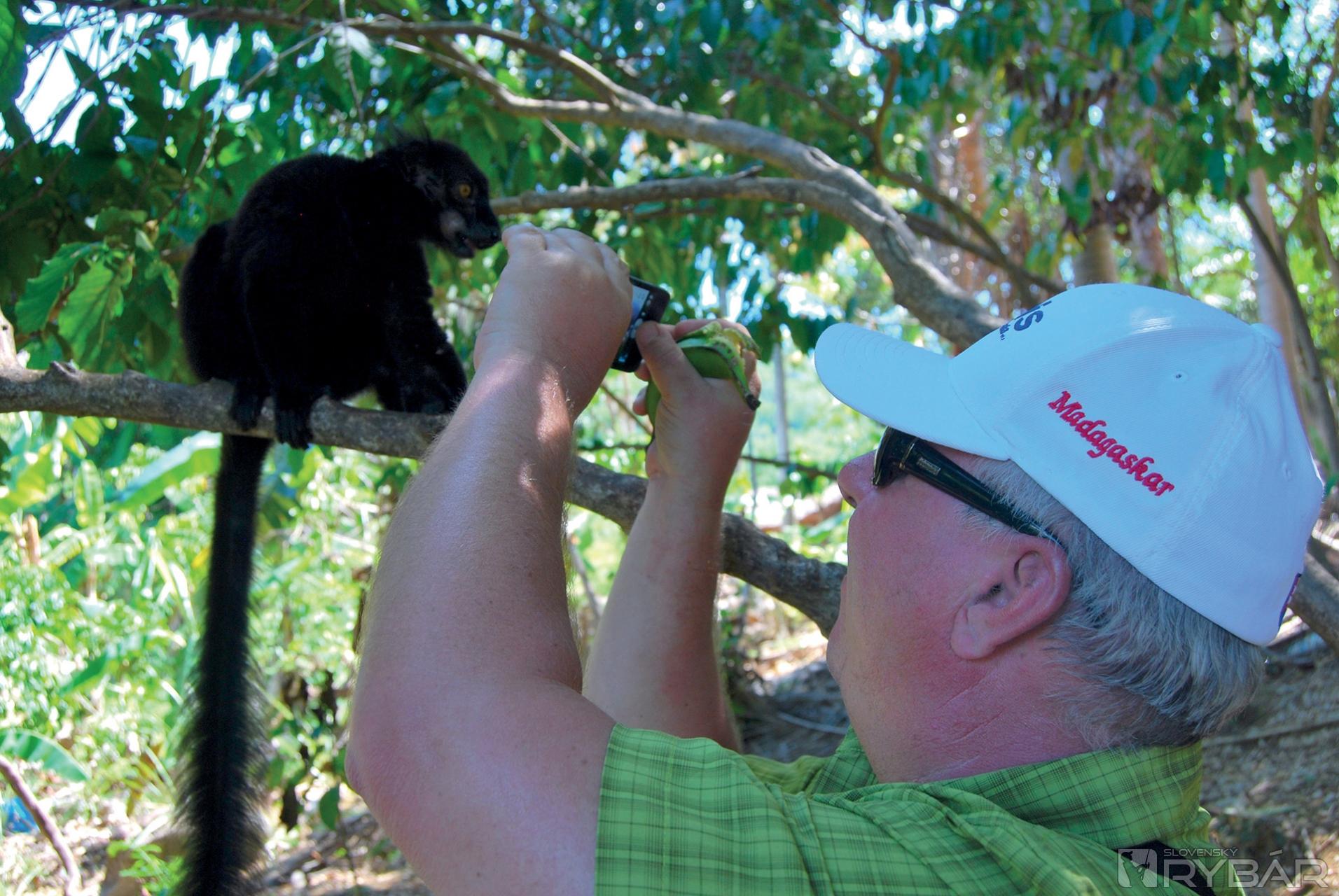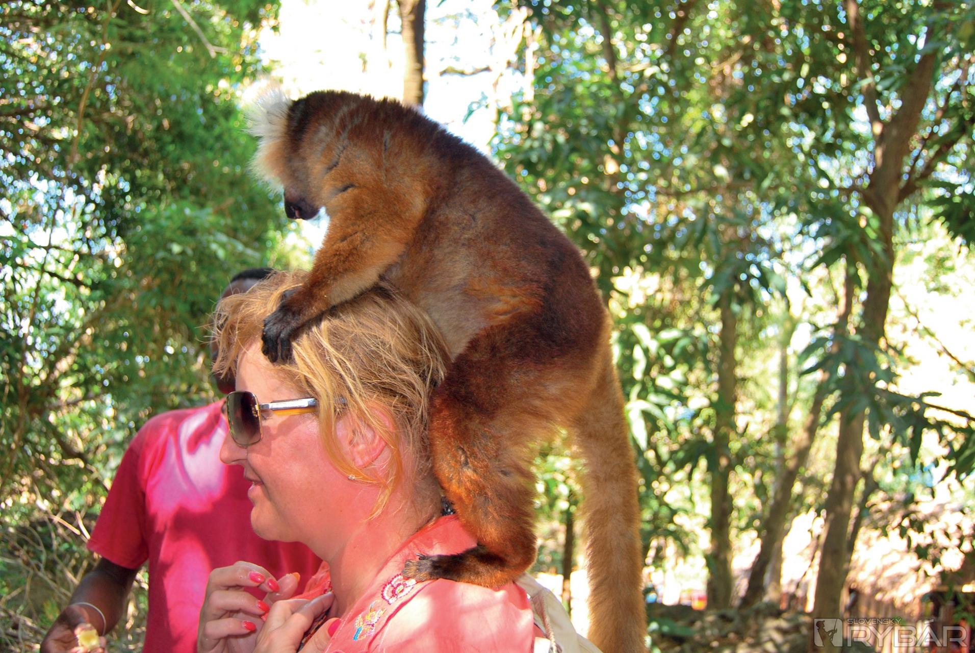 Opäť nasledovalo búchanie po stromoch a my sme natŕčali ruky s banánmi do vetiev stromu. Z ničoho nič sa na nás spustila skupina lemurov. Čierne samce naťahovali paprčky po banánoch a hnedé samice s pricucnutými mláďatami viseli hneď za nimi. O chvíľu ich máme všade. Sedia nám na pleciach, lozia po rukách a skáču nám po hlavách. Kto neverí nech tam beží. O kúsok ďalej miestny chalan vyhrabával z lístia veľhada kráľovského a ponúkal ho ako dekoráciu krku a dekoltu našim dievčatám. Nechceli. Ani ja som nechcel, lenže mňa sa nepýtal, a tak som tam stál s omotaným hadom a tváril sa, že mi to nevadí. Pohladenie korytnačky a smutného chameleóna sa odo mňa bralo ako samozrejmosť.