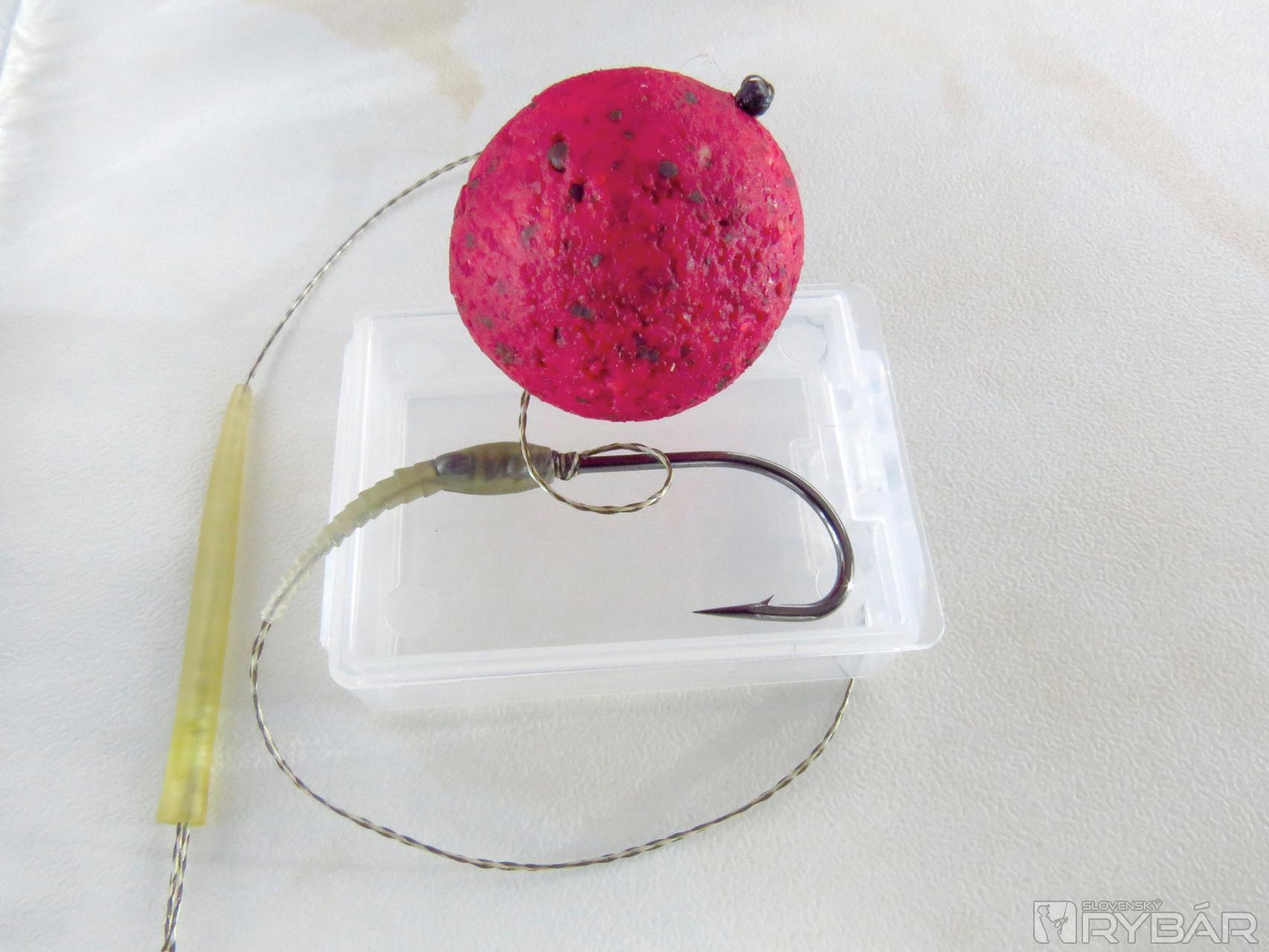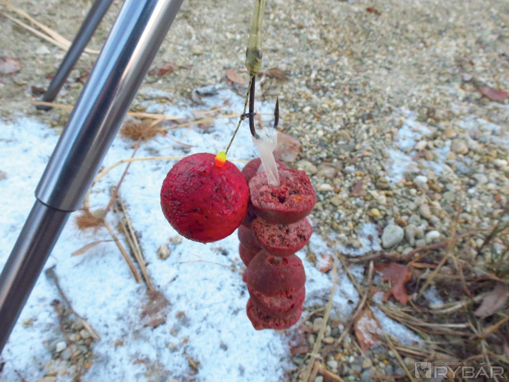 Máme už vyskúšané, že aj v zimných mesiacoch ryba zoberie väčšiu nástrahu, a tak s tým nemáme problém. Pali dáva svojho obľúbeného Squid Craba vo veľkosti 24 mm s poriadnym háčikom 1/0 od Solaru. Ja šijem kombináciu polovičky 24 mm boilies Plum a polovičky 24 mm boilies Chilli con Carne na dvojku háčik tiež od Solaru.