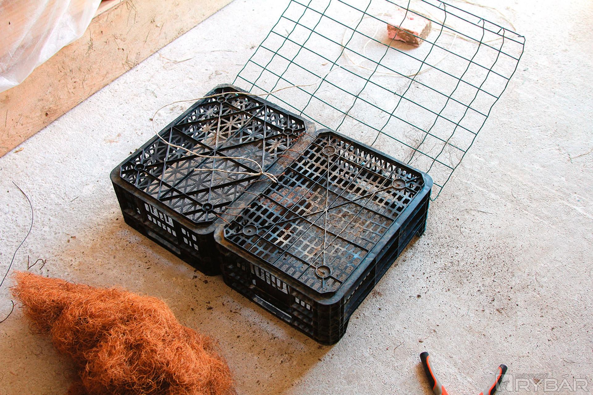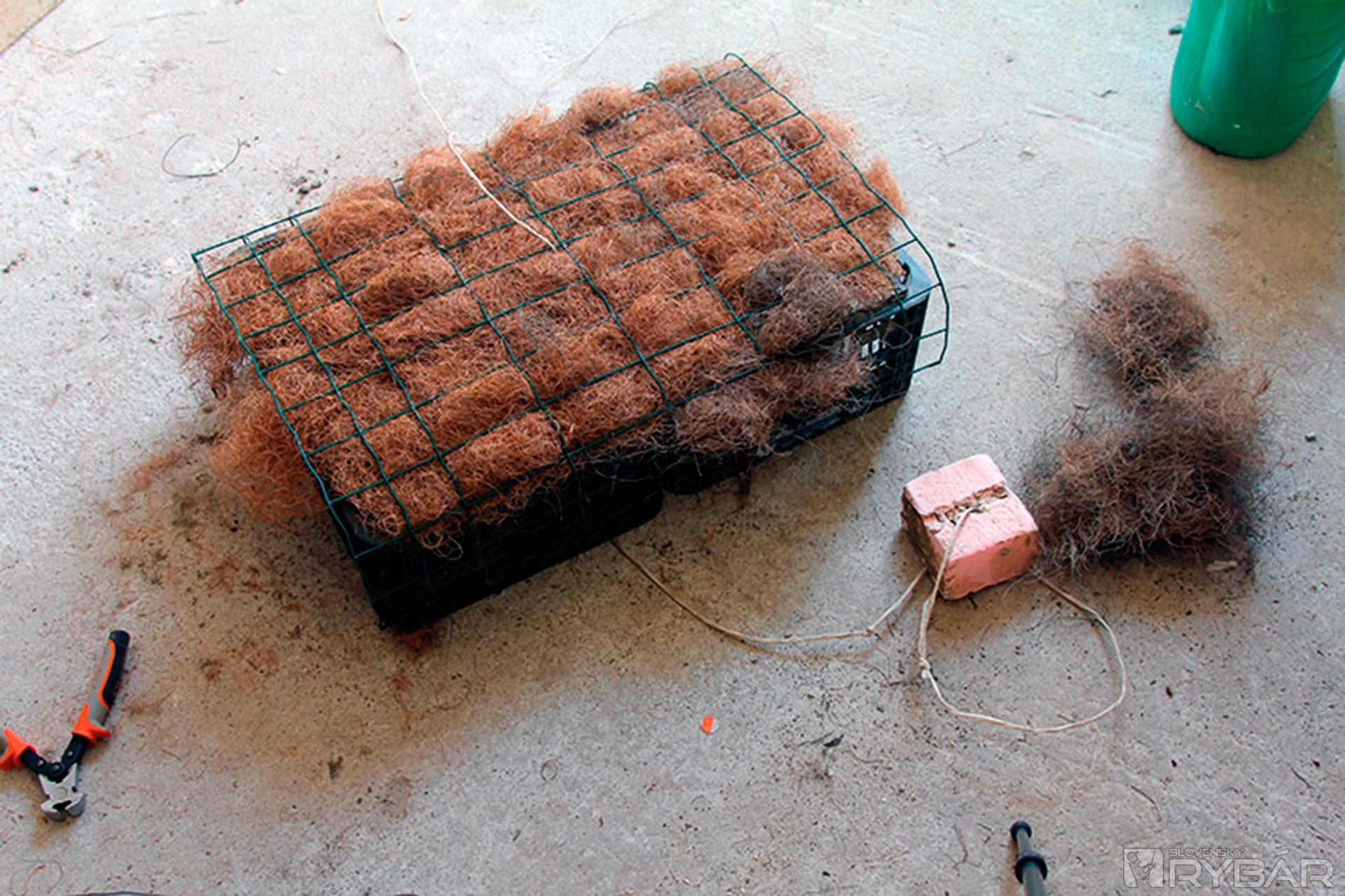 6. Kraje dopcháme vláknom a fixujeme rýchlopáskami alebo drôtom. Boky prepravky môžeme obaliť konárikmi čečiny.
