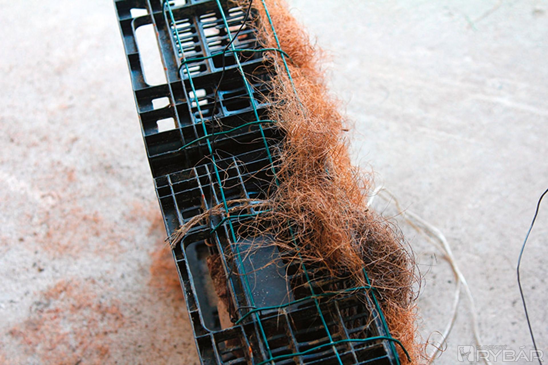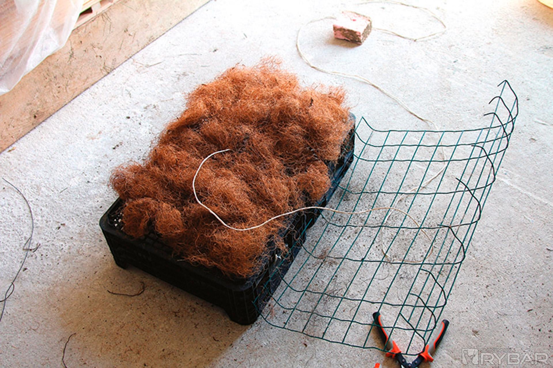 2. Z jednej strany drôtom pripevnite hrubšie poplastované pletivo. Pletivo na kokosové vlákno treba s menšími okami ako je na fotke. Najlepšie je zajačie.