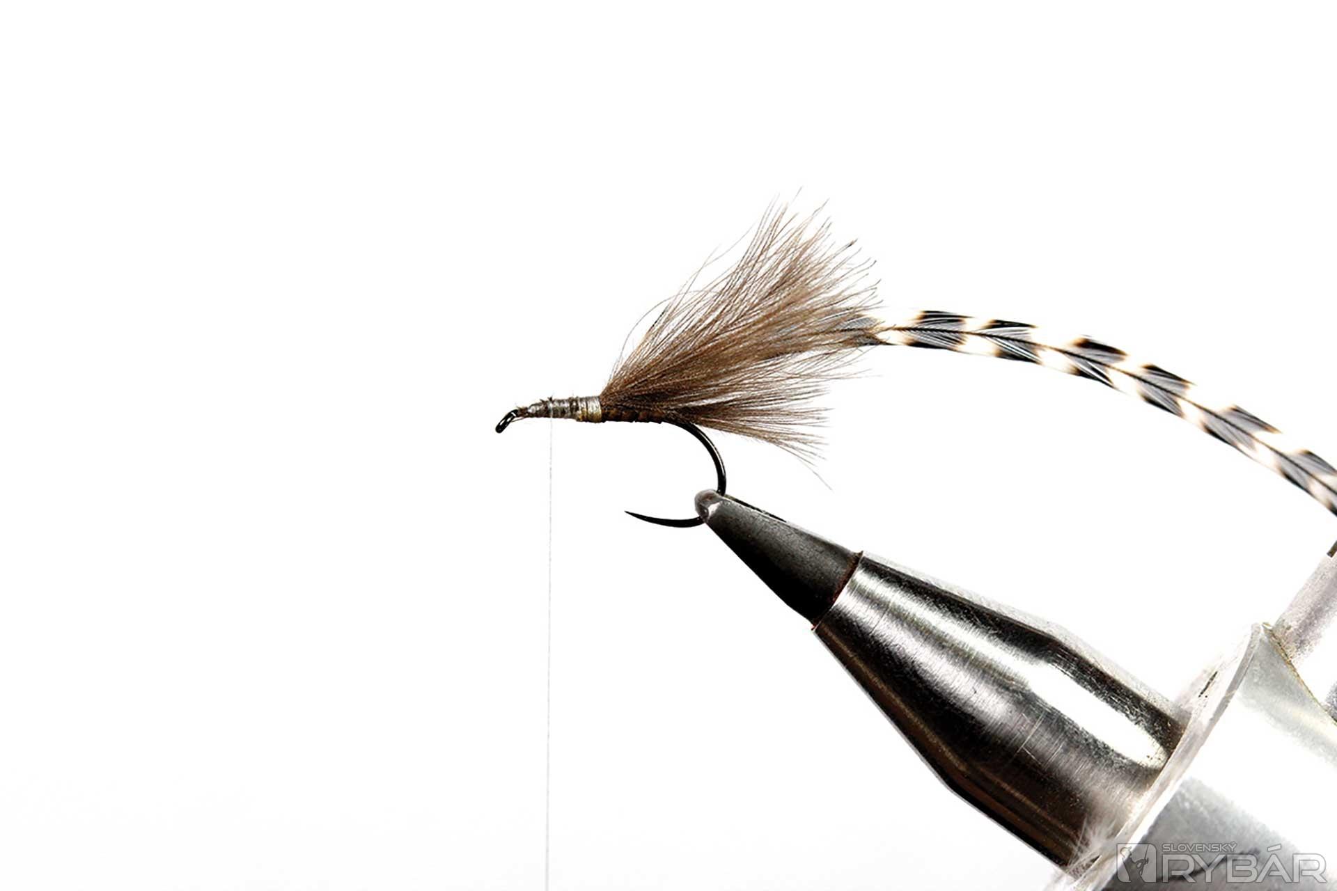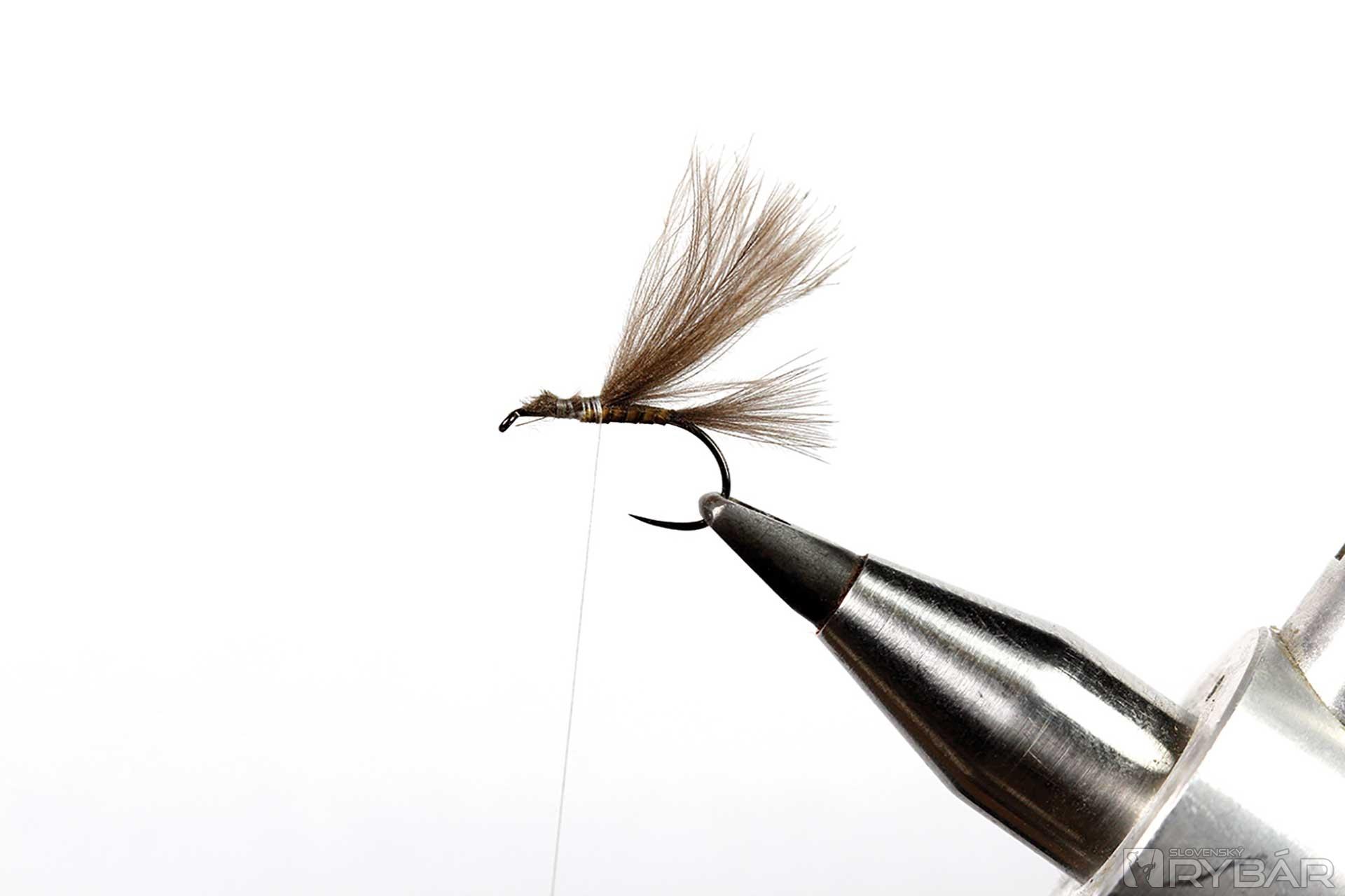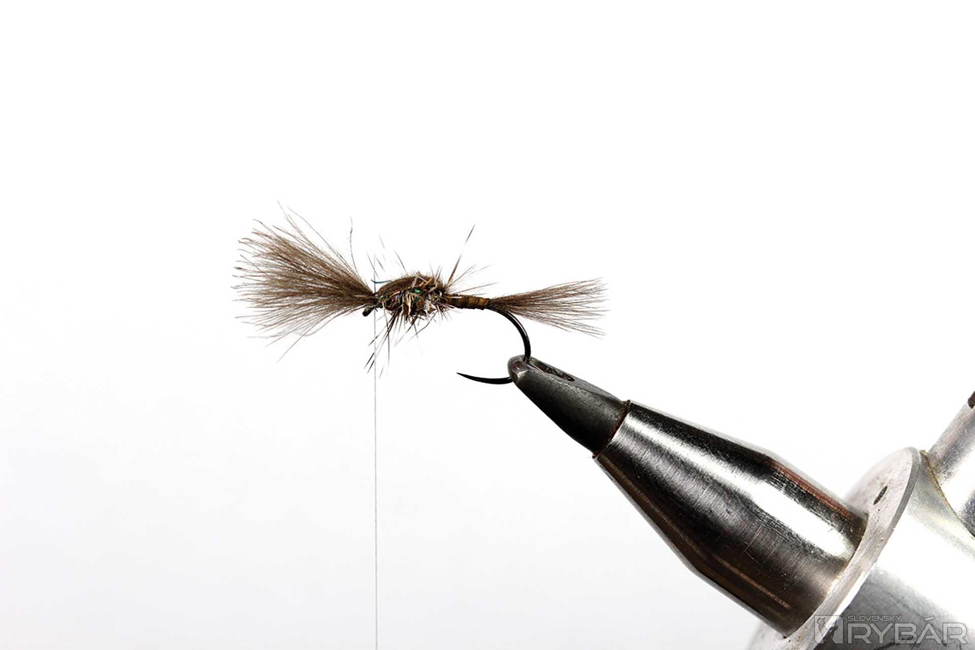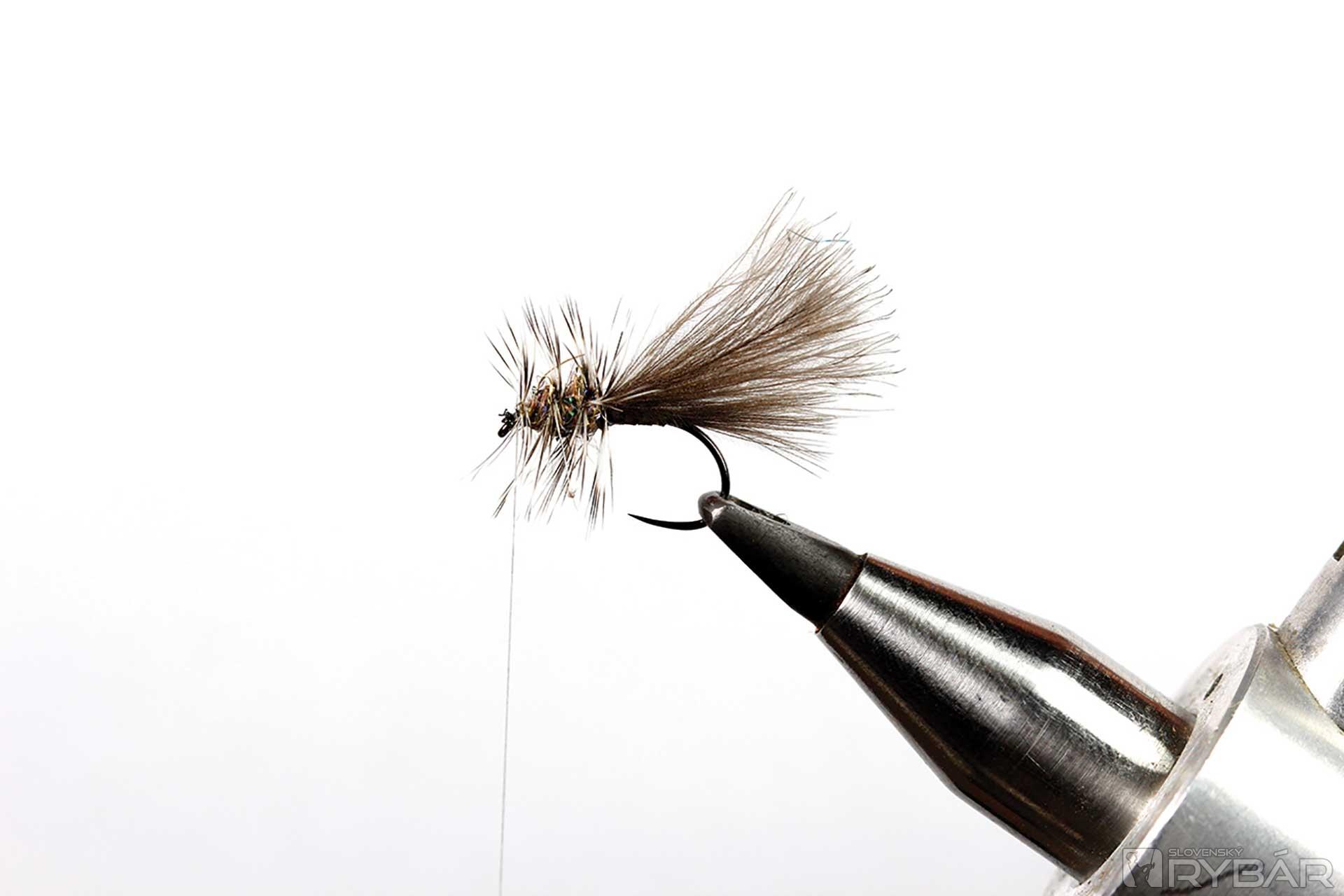 Suchý háčik, tenká viazacia niť, CDC perie, odriapaný lúč z pera páva, dabing, grizzly pierko.