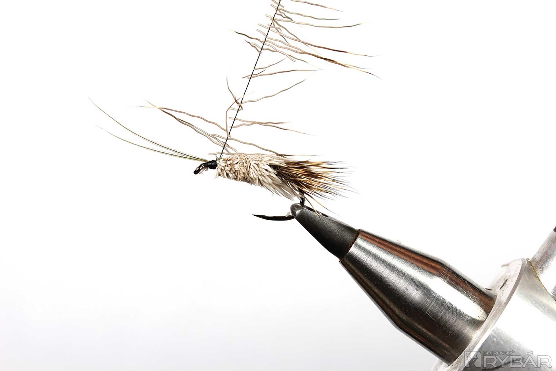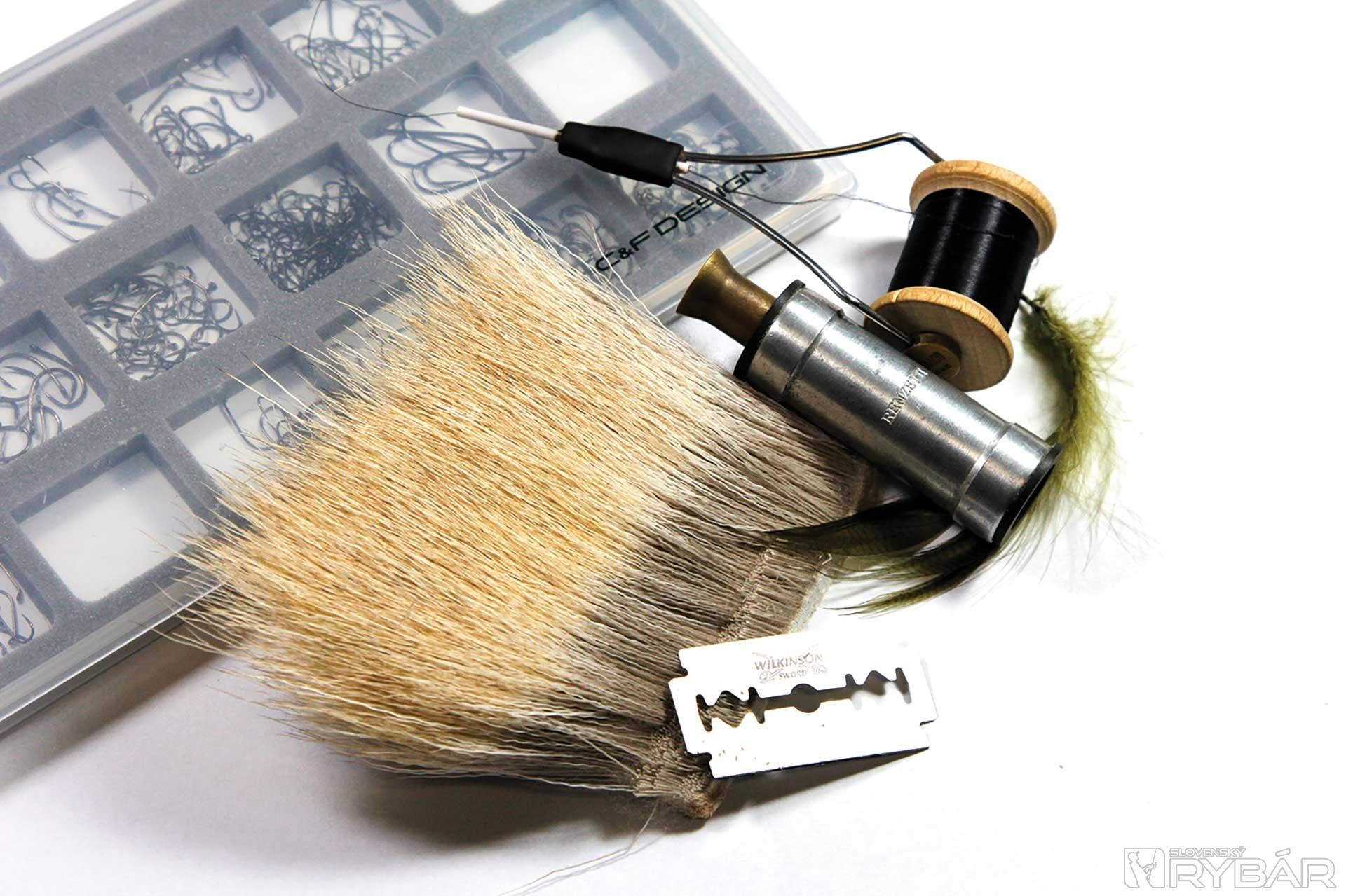 1. Háčik upneme do zveráčika a naviažeme snopček jelenej srsti.