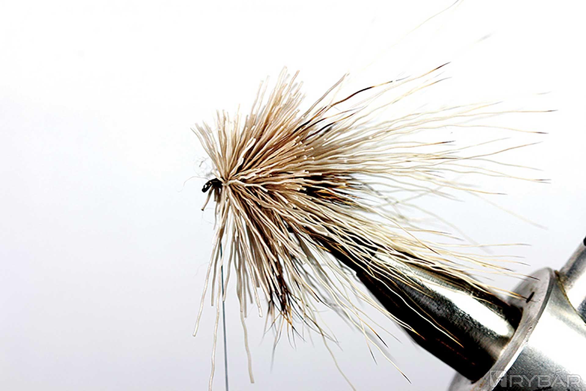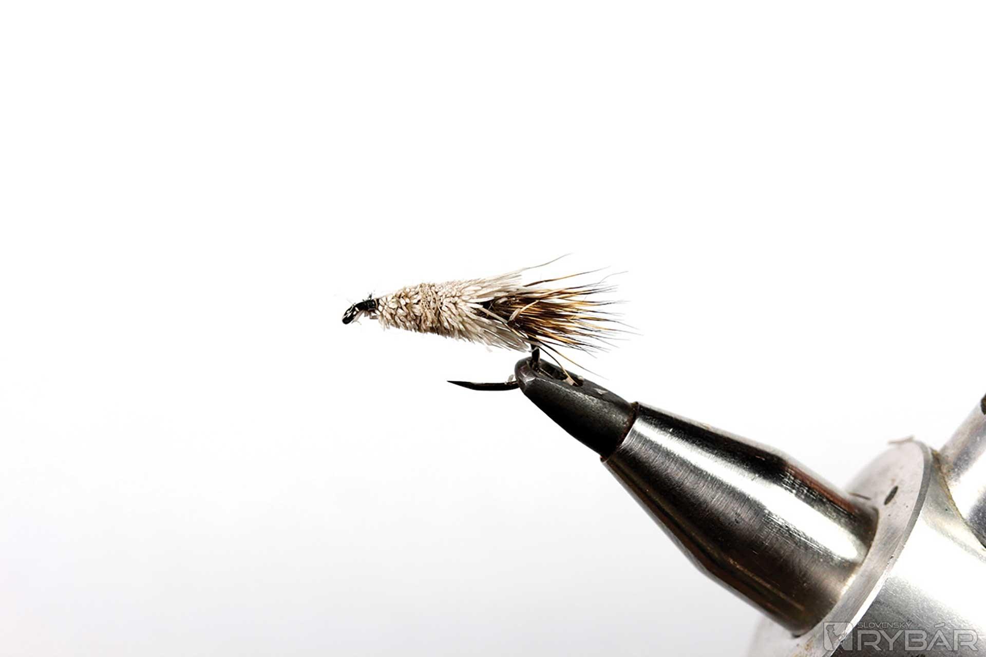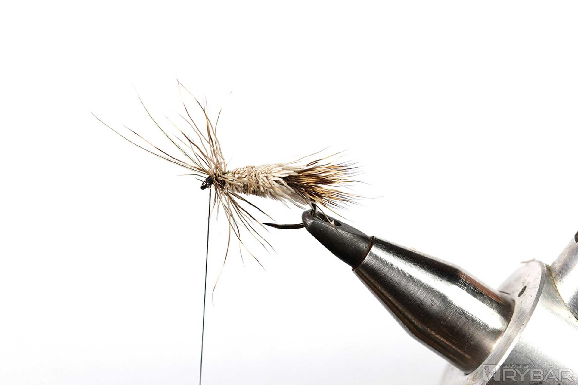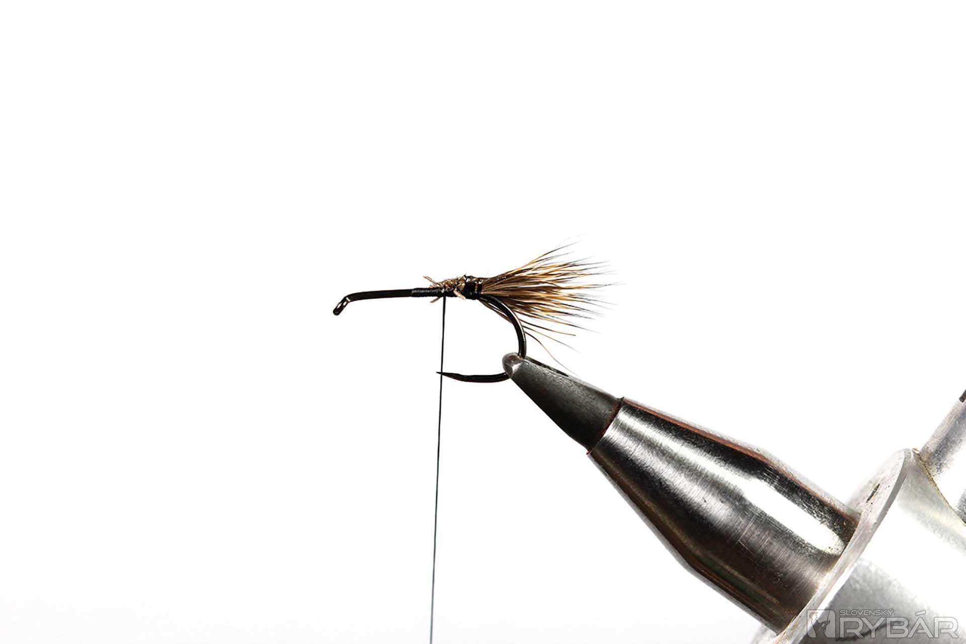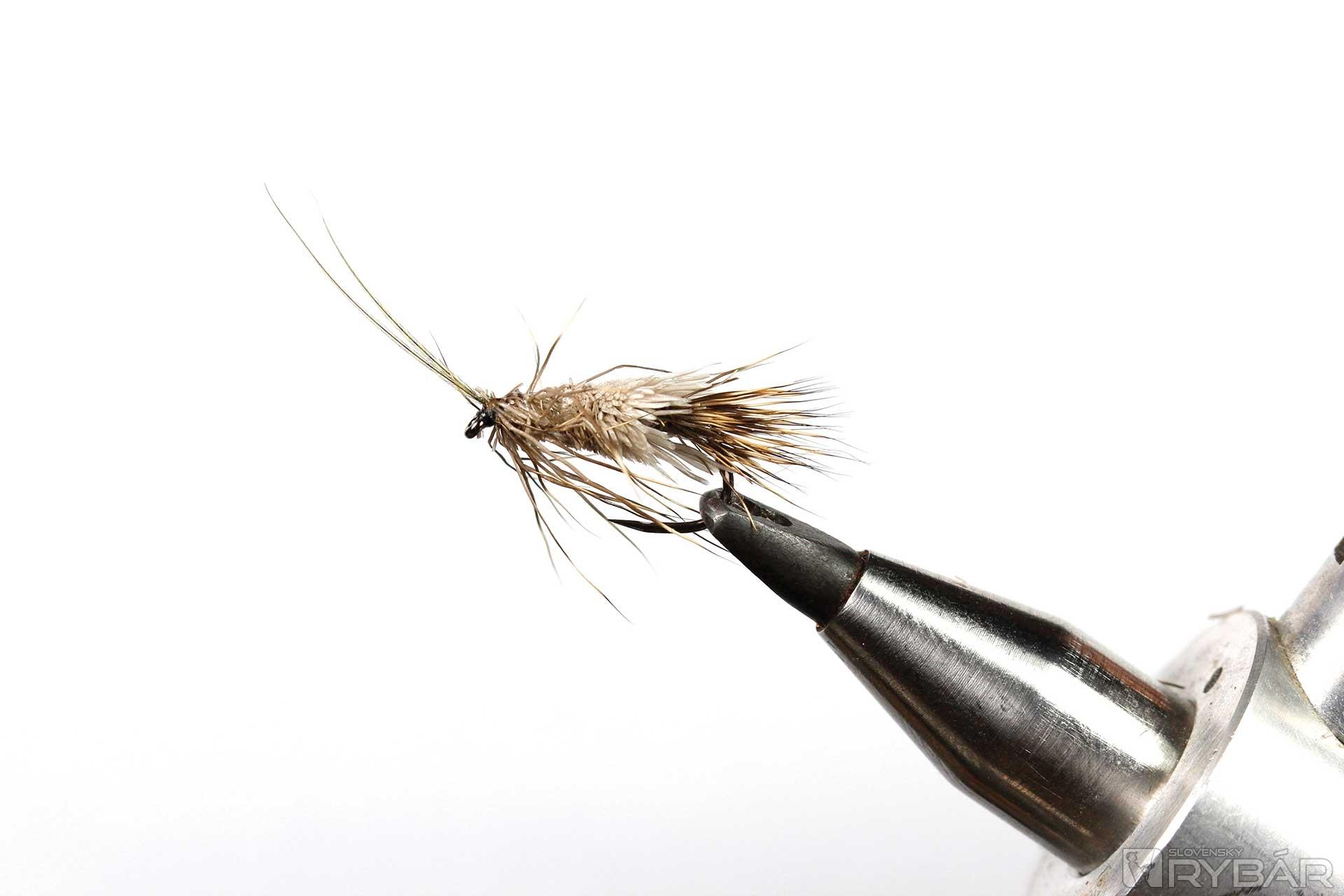 suchý háčik, zimná srsť z jeleňa, tmavá viazacia niť, perie z káčera.