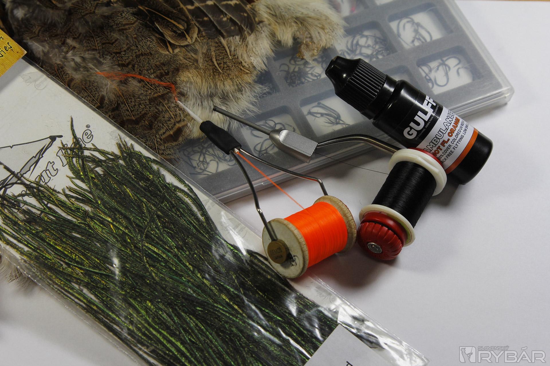 pupový háčik, pierka z jarabice, čierna viazacia niť, oranžová viazacia niť, pierko z chvosta páva, oranžový UV lak.