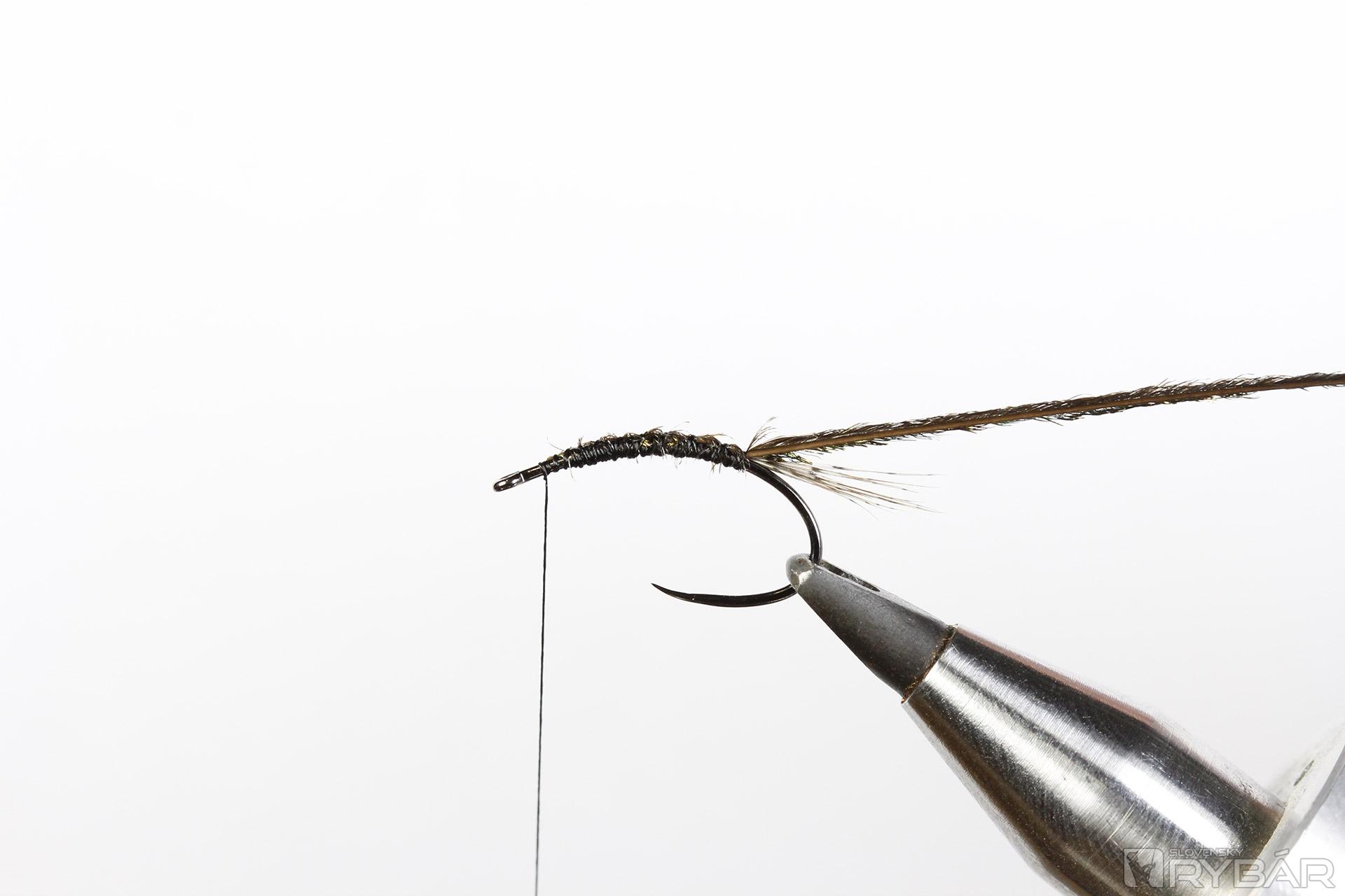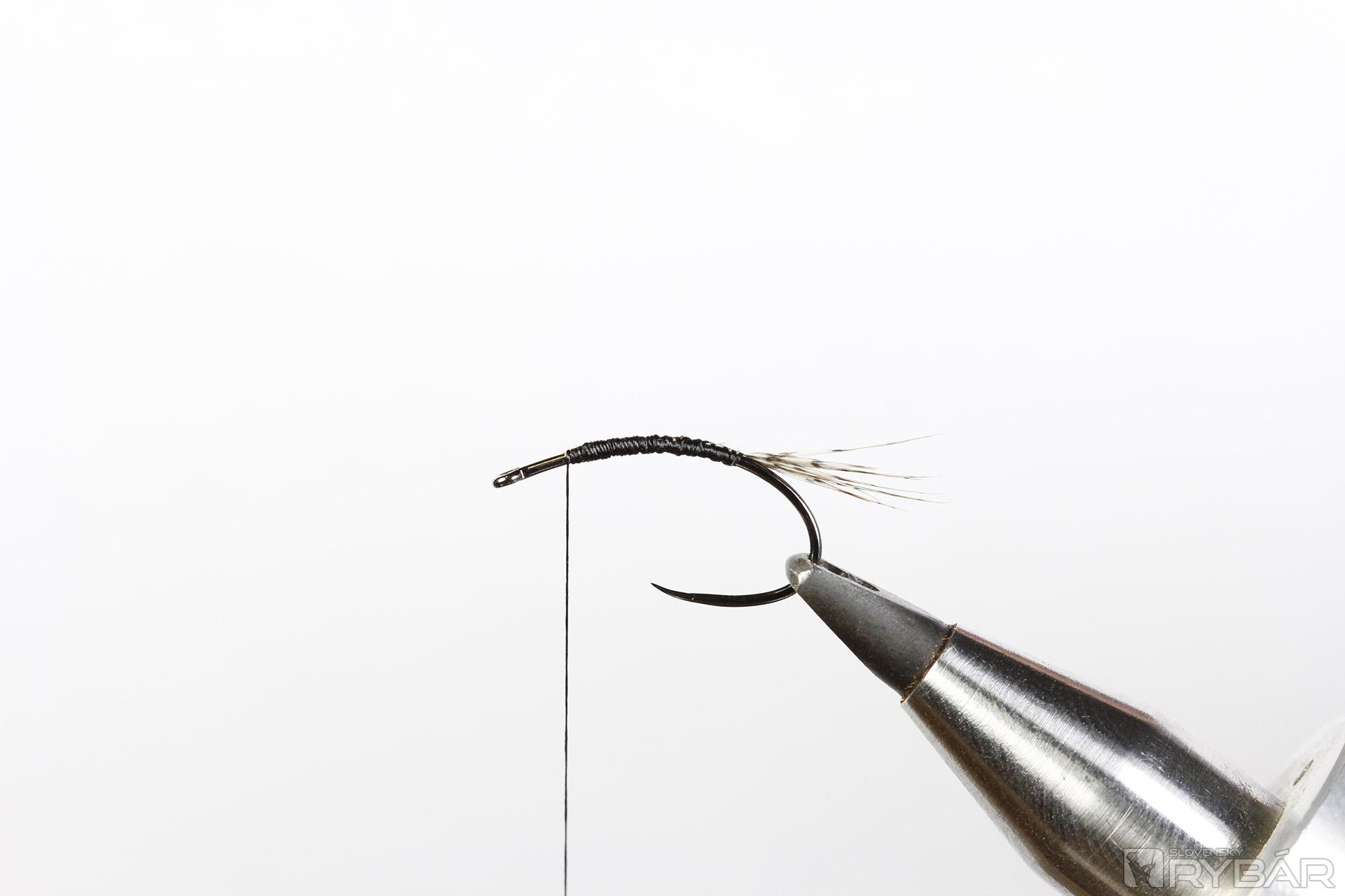 8. Opäť si naviažeme čiernu niť a prichytíme pierko z jarabice.
