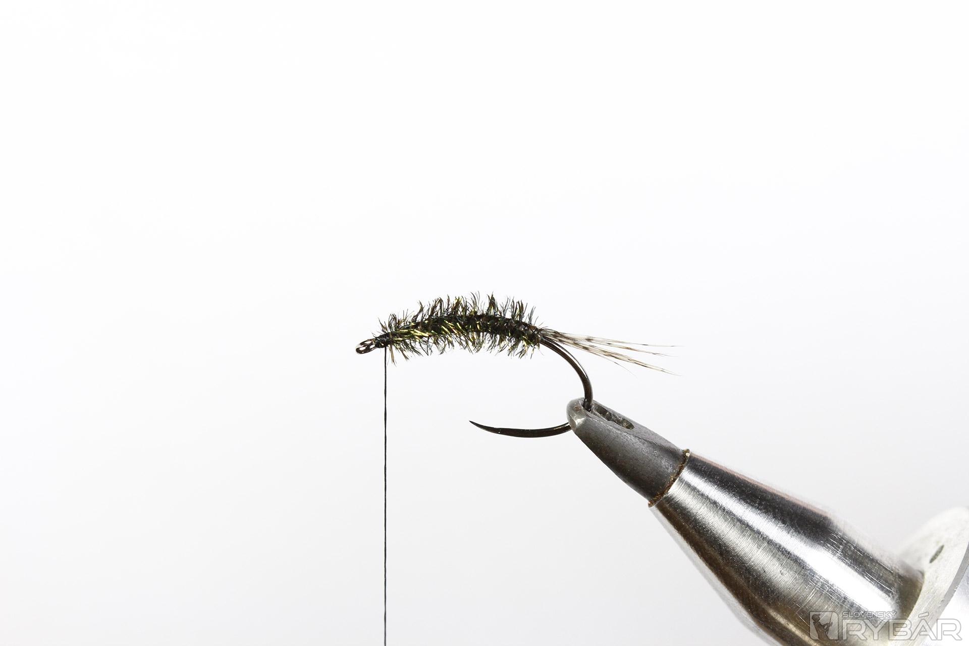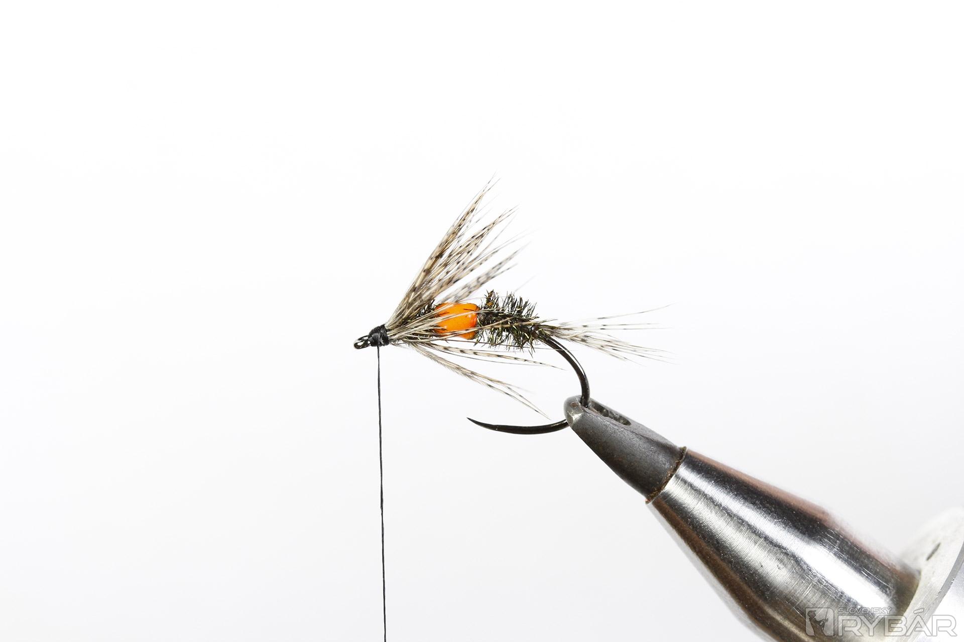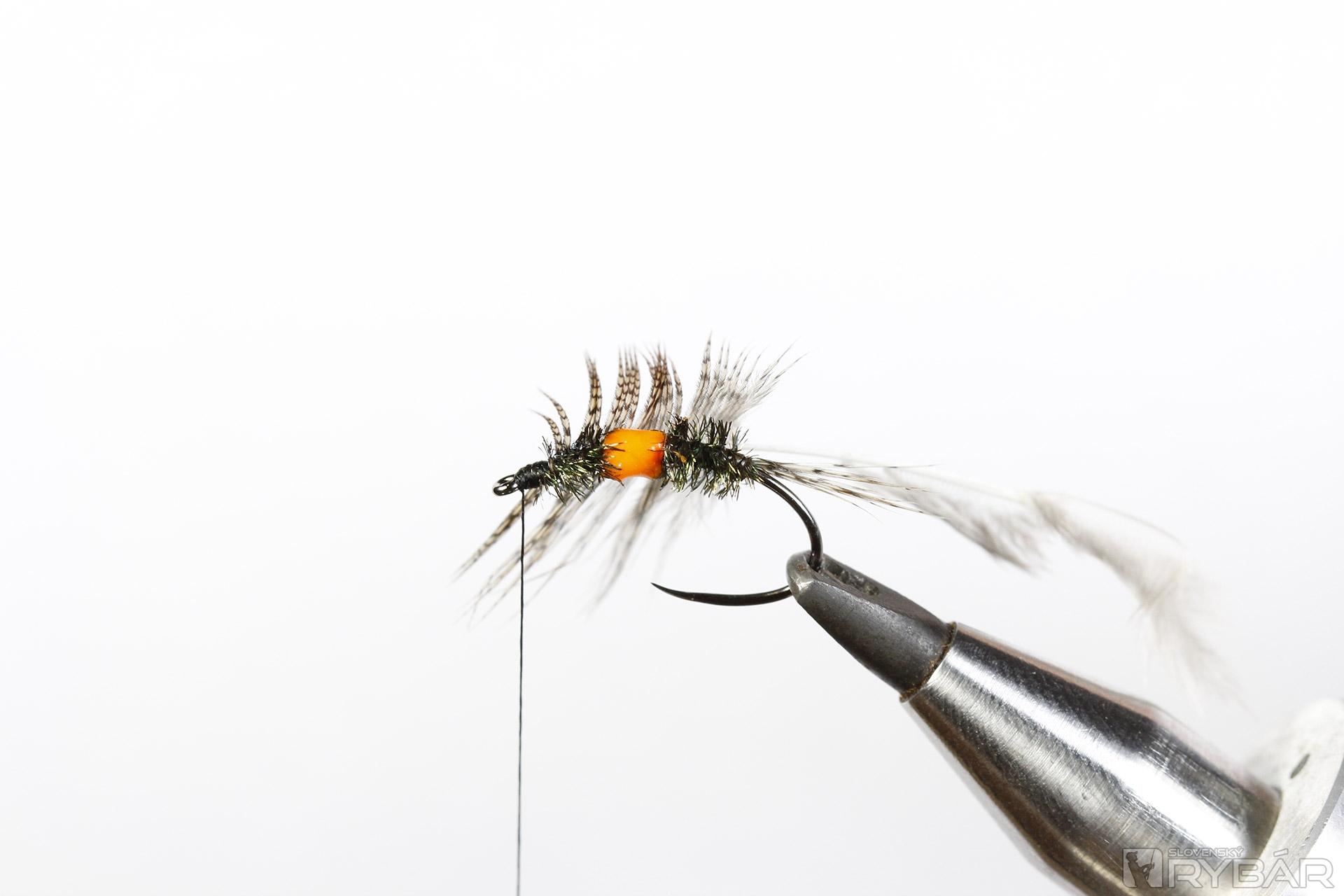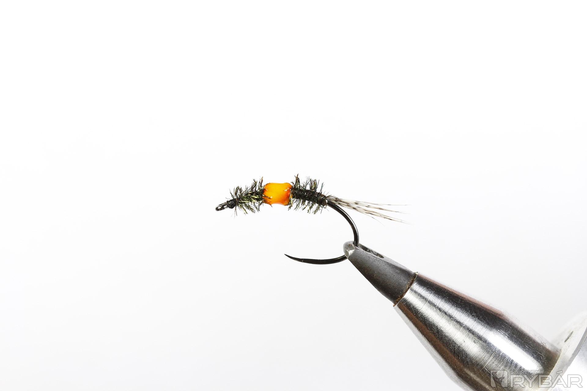 Materiály: pupový háčik, pierka z jarabice, čierna viazacia niť, oranžová viazacia niť, pierko z chvosta páva, oranžový UV lak.