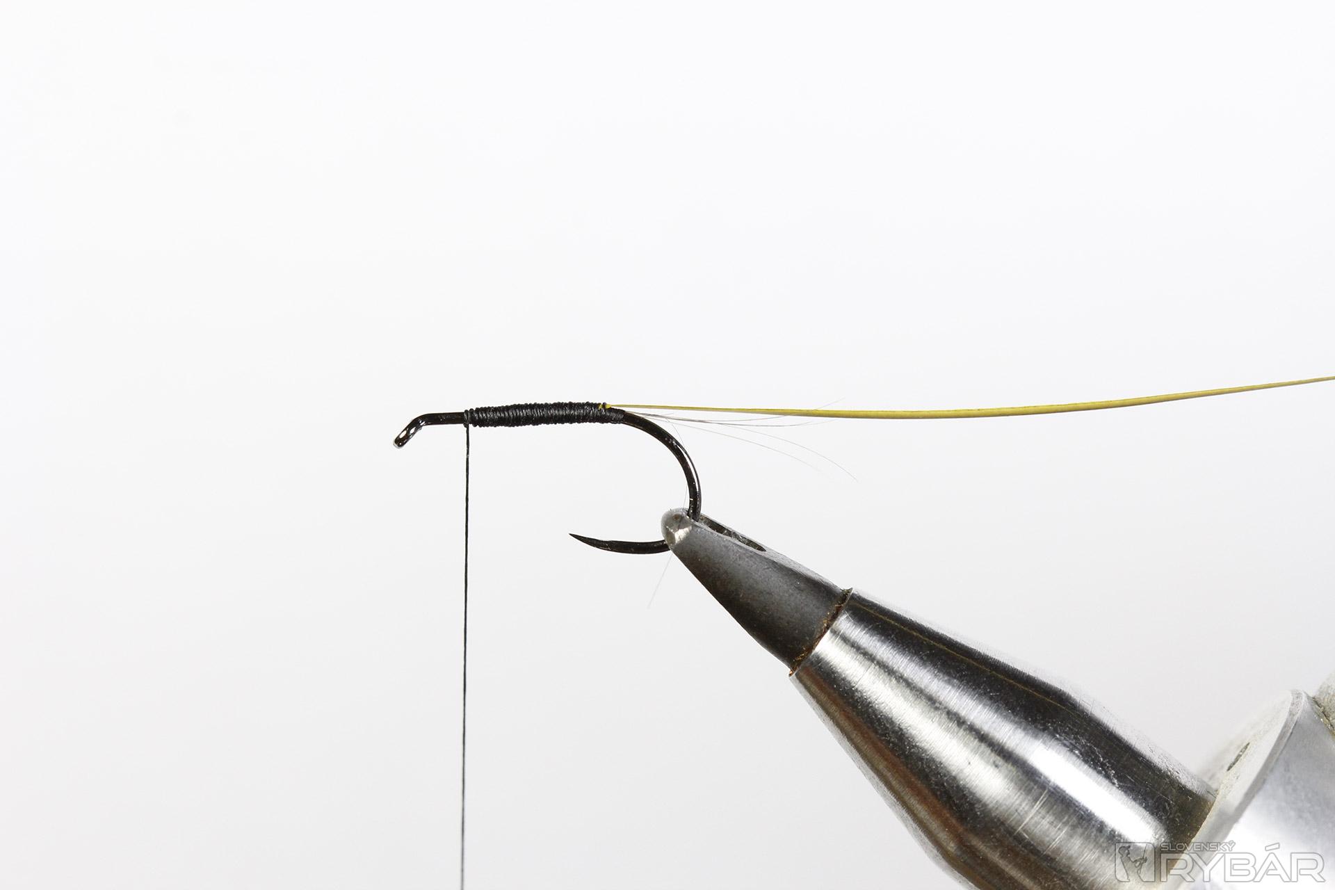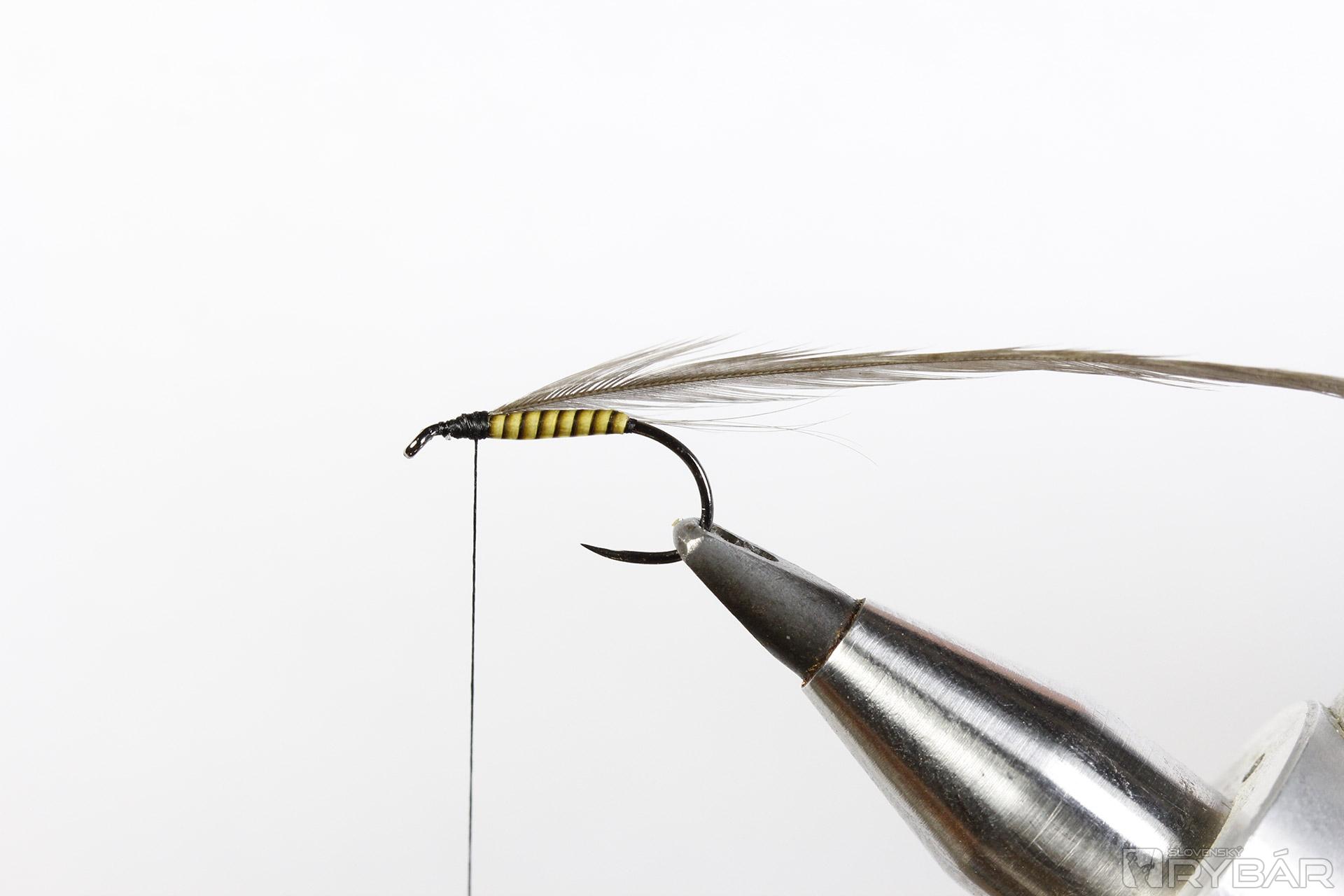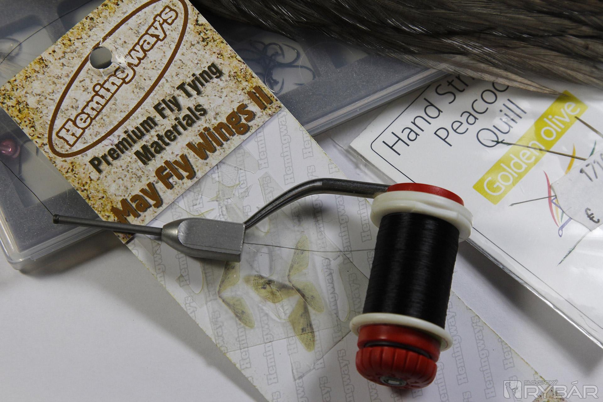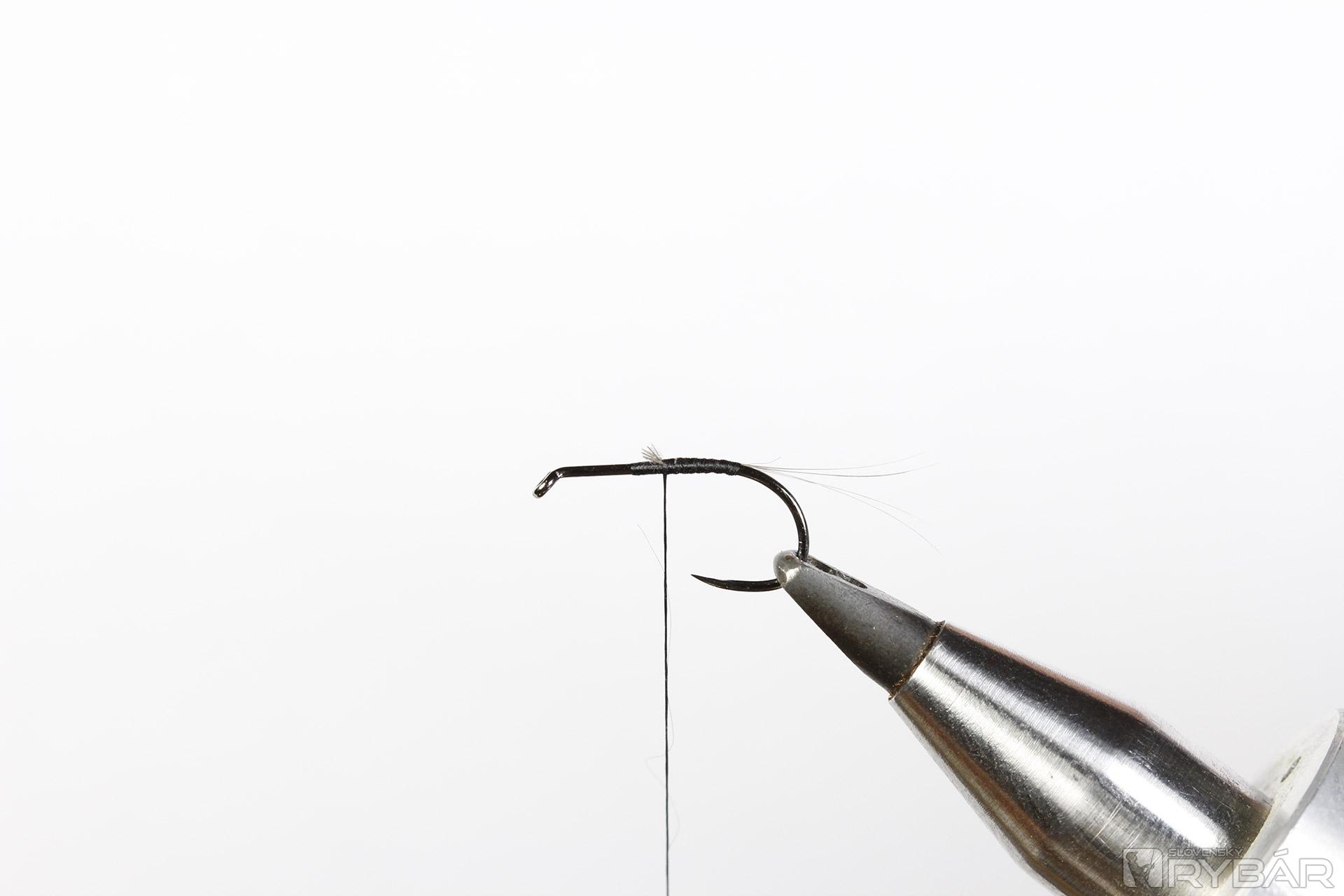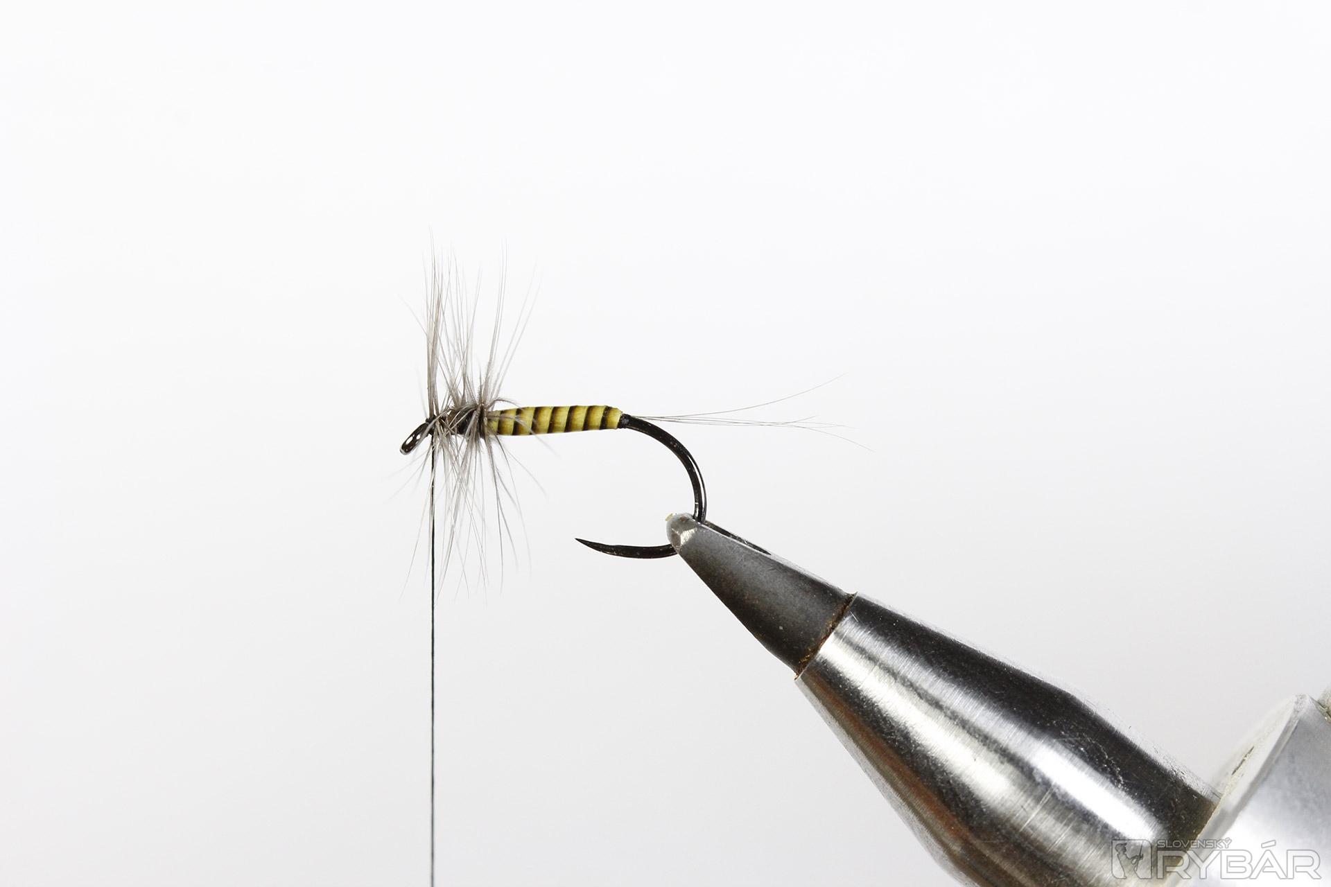 Materiály: suchý háčik, čierna viazacia niť, prírodný body quill, sivé pierko z kohúta, umelé podenkové krídla.