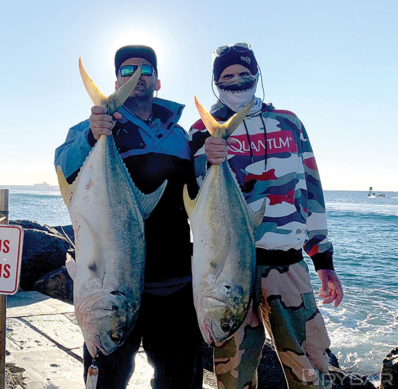 Medzitým vyšlo slnko, pofukuje, vlny sa trochu zdvihli. Hádžem súbežne s vlnami, ryby rady využívajú pri love vlny na nenápadné priblíženie k úlovku bez vynaloženia námahy. Bežne je vidieť z brehu, ako sa lovci mihnú tesne pod vrcholom vlny a nechajú sa unášať. Pomaly mi tŕpne ruka od hádzania takýchto hmotnostných extrémov, no vzápätí som v strehu, len čo zbadám kosákovitú plutvu vedľa nástrahy… Tvrdý úder, ale zaseknem do prázdna. Ryba veľmi energicky zaútočila, ale odtlačila nástrahu a nechytila sa. Rýchlo hodím naspäť, jack sa zavesí tesne pri brehu, druhý sa mihne pri ňom a chňapne po popíku. Rýchlo ho vymanévrujem k piesočnej pláži, skáčem dolu, vlny mi rybu položenú na bok dopravia k nohám… Je o niečo menší, ale rovnako zdatný.
