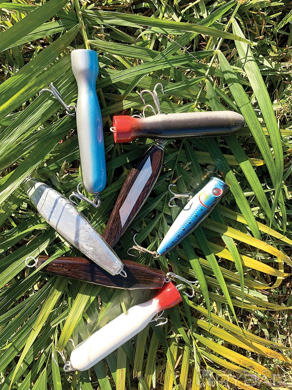 Výbava je klasický prívlačový prút, 120 g - 150 g, 330 cm, dávam prednosť robeným na mieru na zákazku. Pre tento veľmi namáhavý spôsob prívlače sa to jednoznačne oplatí. Navijak DAIWA SALTIGA, 5000, 8000, šnúra 0,36 mm, fluorocarbon 1 mm, popper vlastnej výroby, klasika z tvrdého dreva, jednoduchá konštrukcia, farba hlavne redhead alebo čisto biela. Občas, keď zbadám, pre inšpiráciu, použijem dáky zaujímavý z obchodu.