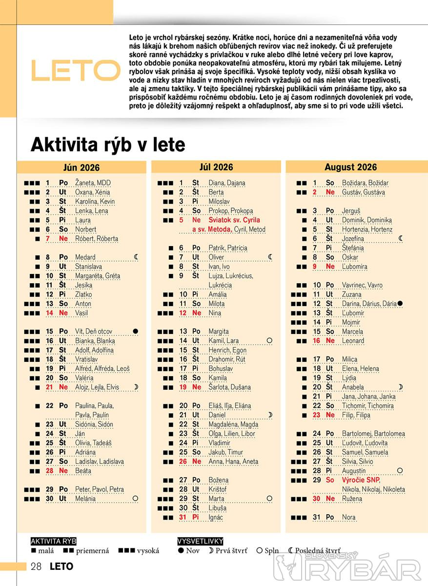Leto je vrchol rybárskej sezóny. Krátke noci, horúce dni a nezameniteľná vôňa vody nás lákajú k brehom našich obľúbených revírov viac než inokedy. Či už preferujete skoré ranné vychádzky s prívlačkou v ruke alebo dlhé letné večery pri love kaprov, toto obdobie ponúka neopakovateľnú atmosféru, ktorú my rybári tak milujeme. Letný rybolov však prináša aj svoje špecifiká. Vysoké teploty vody, nižší obsah kyslíka vo vode a nízky stav hladín v mnohých revíroch vyžadujú od nás nielen viac trpezlivosti, ale aj zmenu taktiky. V tejto špeciálnej rybárskej publikácii vám prinášame tipy, ako sa prispôsobiť každému ročnému obdobiu. Leto je aj časom rodinných dovoleniek pri vode, preto je dôležitý vzájomný rešpekt a ohľaduplnosť, aby sme si to pri vode užili všetci.