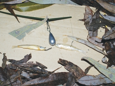 Potenciálne úlovky sú takmer všetky druhy dravých rýb. Na mŕtve rybky s obľubou útočia jalce, zubáče, ostrieže, mreny. V zimných mesiacoch nakladanými rybkami nepohrdnú miene. Zabrať nám môže i šťuka a boleň. Úspešnosť závisí od koncovej montáže a prezentácie nástrahy, aby sme mohli zaregistrovať na špičke útok dravcov. Montáže môžete vidieť na obrázkoch.