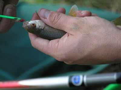 Nadväzec preto mením na 0,10 mm a háčik z č. 22 na č. 14. Skúšam inú nástrahu a napichujem hnojáky. Mením tiež spôsob vedenia, nástrahu pridržiavam na jednom mieste a zrazu prásk!! Zásek a pekná plotica cca 0,5 kg sa trepoce v podberáku.